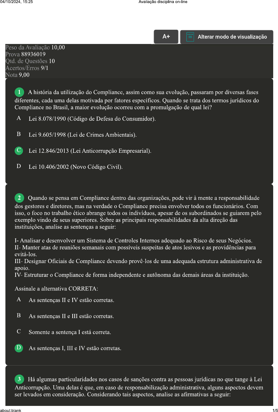 <p>04/10/2024, 15:25 Avaliação disciplina on-line A+ Alterar modo de visualização Peso da Avaliação 10,00 Prova 88936019 Qtd. de Questões 10 Acertos/Erros 9/1 Nota 9,00 1 A história da utilização do Compliance, assim como sua evolução, passaram por diversas fases diferentes, cada uma delas motivada por fatores específicos. Quando se trata dos termos jurídicos do Compliance no Brasil, a maior evolução ocorreu com a promulgação de qual lei? A Lei 8.078/1990 (Código de Defesa do Consumidor). B Lei 9.605/1998 (Lei de Crimes Ambientais). Lei 12.846/2013 (Lei Anticorrupção Empresarial). D Lei 10.406/2002 (Novo Código Civil). 2 Quando se pensa em Compliance dentro das organizações, pode vir à mente a responsabilidade dos gestores e diretores, mas na verdade Compliance precisa envolver todos os funcionários. Com isso, foco no trabalho ético abrange todos os indivíduos, apesar de os subordinados se guiarem pelo exemplo vindo de seus superiores. Sobre as principais responsabilidades da alta direção das instituições, analise as sentenças a seguir: I- Analisar e desenvolver um Sistema de Controles Internos adequado ao Risco de seus Negócios. II- Manter atas de reuniões semanais com possíveis suspeitas de atos lesivos e as providências para evitá-los. III- Designar Oficiais de Compliance devendo provê-los de uma adequada estrutura administrativa de apoio. IV- Estruturar Compliance de forma independente e autônoma das demais áreas da instituição. Assinale a alternativa CORRETA: A As sentenças II e IV estão corretas. B As sentenças II e III estão corretas. C Somente a sentença I está correta. D As sentenças I, III e IV estão corretas. 3 Há algumas particularidades nos casos de sanções contra as pessoas jurídicas no que tange à Lei Anticorrupção. Uma delas é que, em caso de responsabilização administrativa, alguns aspectos devem ser levados em consideração. Considerando tais aspectos, analise as afirmativas a seguir: about:blank 1/5</p><p>04/10/2024, 15:25 Avaliação disciplina on-line I- A quantidade de funcionários. II- A gravidade da infração. III- A vantagem auferida pelo infrator. IV- A existência de procedimentos internos de auditoria. Assinale a alternativa CORRETA: A As afirmativas I e II estão corretas. B As afirmativas II, III e IV estão corretas. C As afirmativas I e IV estão corretas. D As afirmativas I, II e IV estão corretas. 4 Acordos de Leniência são acordos com intenção de que infrator auxilie nas investigações de crimes contra a ordem financeira. A Lei Anticorrupção também aborda situações em que Acordos de Leniência são permitidos. Sobre Pontos Fundamentais para a celebração do acordo, analise as sentenças a seguir: I- A pessoa jurídica precisa ser a primeira a manifestar interesse em cooperar para a apuração de ato lesivo específico. II- A pessoa jurídica pode dar sua colaboração verbal, sem precisar entregar elementos que comprovem a infração. III- A pessoa jurídica precisa ter cessado completamente seu envolvimento no ato lesivo a partir da data da proposta do acordo. Assinale a alternativa CORRETA: A As sentenças I e III estão corretas. B As sentenças II e III estão corretas. C Somente a sentença III está correta. D Somente a sentença I está correta. 5 O setor bancário foi primeiro a ser obrigado a adotar normas de Compliance. Essas obrigatoriedades foram especificadas na Resolução n° 2.554/98, do Banco Central do Brasil. No que se refere a essas obrigações bancárias, analise as sentenças a seguir: I- Deveriam criar estruturas e mecanismos efetivos de controles internos e de riscos. II- Deveriam criar em seus organogramas áreas específicas de Compliance, capacitando os responsáveis por referidas áreas. III- Deveriam elaborar análise matricial de riscos operacionais e de mercado. Deveriam fornecer treinamento semestral aos seus clientes sobre corrupção e Compliance. Assinale a alternativa CORRETA: A As sentenças II e IV estão corretas. about:blank 2/5</p><p>15:25 Avaliação disciplina on-line B As sentenças I e IV estão corretas. C As sentenças II, III e IV estão corretas. D As sentenças I, II e III estão corretas. 6 Um dos aspectos tratados na Lei Anticorrupção (LAC) é Processo Administrativo de Responsabilização. Esse processo é relacionado com a instauração e julgamento de processo administrativo para verificar a responsabilidade da pessoa jurídica. Sobre Processo Administrativo de Responsabilização, classifique V para as sentenças verdadeiras e F para as falsas: ( ) É concedido à pessoa jurídica prazo de 90 dias para defesa, contados a partir da intimação. ( ) O processo administrativo para apuração da responsabilidade de pessoa jurídica será conduzido por comissão designada pela autoridade instauradora e composta por dois ou mais servidores ( ) A comissão deverá concluir processo no prazo de 60 dias contados da data da publicação do ato que a institui. ( ) O processo administrativo, com relatório da comissão, será remetido à autoridade instauradora para julgamento. Assinale a alternativa que apresenta a sequência CORRETA: em: 10 set. 2020. A V F V F. B F-V-F-V D 7 A pessoa jurídica Atacado Veloz foi acusada de ato lesivo contra a administração pública. O gestor estava tranquilo quanto à situação, pois acreditava que não poderia ser responsabilizado pessoalmente nesse caso. Sobre essa situação, analise as afirmativas a seguir: I- A responsabilização da pessoa jurídica não exclui a responsabilidade individual de seus dirigentes ou administradores ou de qualquer pessoa natural, autora, coautora ou partícipe do ato ilícito. II- A pessoa jurídica será responsabilizada proporcionalmente à responsabilização individual das pessoas naturais envolvidas no ato lesivo. III- Os dirigentes ou administradores somente serão responsabilizados por atos ilícitos na medida da sua culpabilidade. Assinale a alternativ