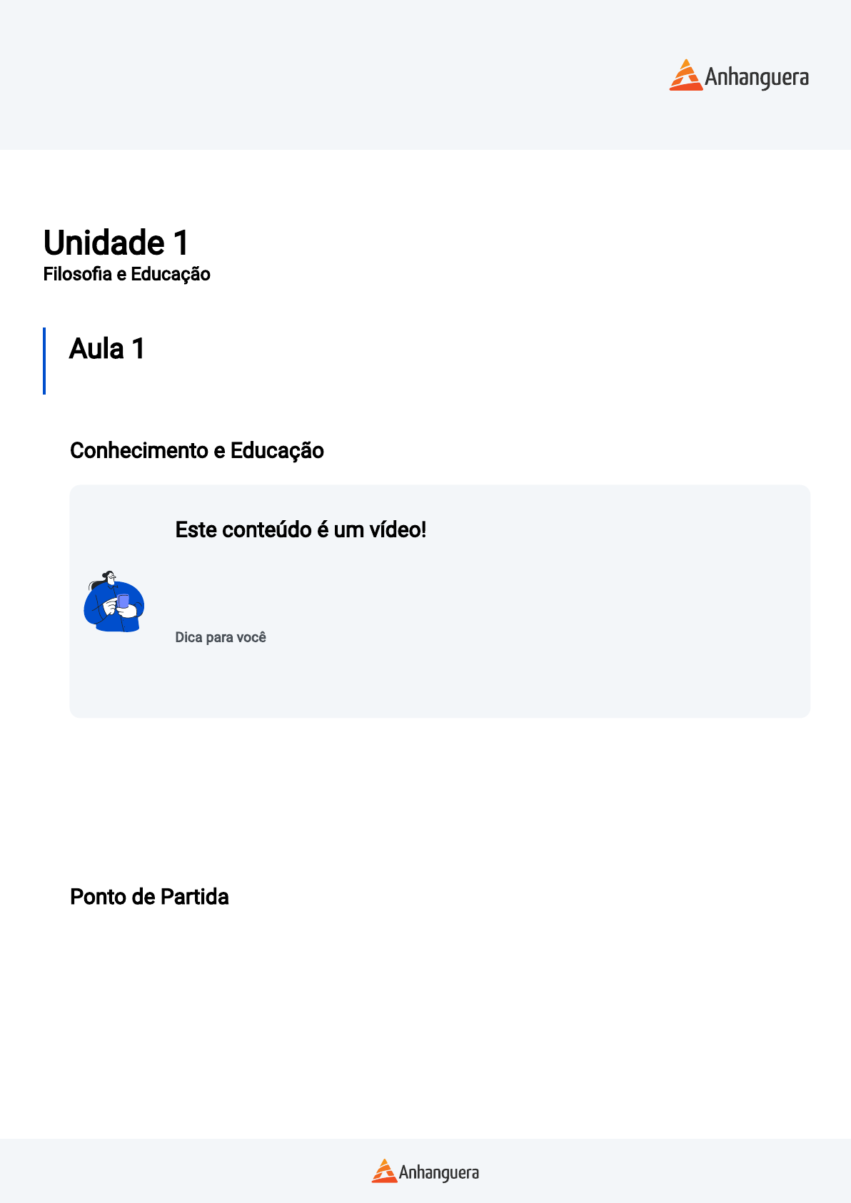 <p>Disciplina</p><p>FUNDAMENTOS DA EDUCAÇÃO</p><p>Unidade 1</p><p>Filoso�a e Educação</p><p>Aula 1</p><p>Conhecimento e Educação</p><p>Conhecimento e Educação</p><p>Este conteúdo é um vídeo!</p><p>Para assistir este conteúdo é necessário que você acesse o AVA pelo</p><p>computador ou pelo aplicativo. Você pode baixar os vídeos direto no aplicativo</p><p>para assistir mesmo sem conexão à internet.</p><p>Dica para você</p><p>Aproveite o acesso para baixar os slides do vídeo, isso pode deixar sua</p><p>aprendizagem ainda mais completa.</p><p>Olá, estudante!</p><p>Nesta aula você irá re�etir a respeito da origem do conhecimento e como os �lósofos, desde a</p><p>Antiguidade, pensaram a construção do conhecimento humano. Esse conteúdo é importante</p><p>para a sua formação pro�ssional, pois o levará ao entendimento da relação existente entre</p><p>ciência, conhecimento e educação. Prepare-se para essa jornada de conhecimento! Vamos lá!</p><p>Ponto de Partida</p><p>A Filoso�a é um conhecimento que marca, signi�cativamente, a história ocidental. Tendo sua</p><p>origem por volta do século VII a.C., ao longo dos séculos ela deu luz a um conhecimento singular</p><p>da realidade. A Filoso�a mostra sua importância ao problematizar o homem e a produção de</p><p>conhecimento. A teoria do conhecimento é uma disciplina �losó�ca que busca compreender</p><p>como acontece a complexa relação entre o sujeito que aprende e o objeto que ele busca</p><p>aprender, além de esclarecer quais são os múltiplos fatores que estão envolvidos nesse</p><p>processo.</p><p>Disciplina</p><p>FUNDAMENTOS DA EDUCAÇÃO</p><p>Sendo um dos pilares mais fundamentais da prática pedagógica, entre os seus temas de estudo</p><p>estão os relacionados à origem dos saberes, isto é, à forma como o ser humano se apropria do</p><p>conhecimento sobre o mundo físico e social. Por ser uma teoria que trata de elementos mais</p><p>subjetivos do que objetivos, não é possível encontrarmos uma única abordagem nesse campo de</p><p>estudo, pois nesse território convivem múltiplas e antagônicas concepções.</p><p>Para compreendermos melhor tais questões e conseguirmos olhar mais especi�camente para</p><p>essas questões, vamos pensar na seguinte situação: você está no momento de cursar os</p><p>estágios obrigatórios do seu curso de graduação. Você inicia suas horas de estágio</p><p>acompanhando o professor Carlos, responsável pela disciplina de Ciências em turmas do Ensino</p><p>Fundamental em uma escola da rede pública de ensino.</p><p>As aulas são expositivas quase em sua totalidade, com questionários e atividades que devem ser</p><p>realizados no caderno ou livro, individualmente ou em grupo. Motivado pelo que tem estudado</p><p>nas disciplinas da faculdade, você começa a perceber que a prática da sala de aula, observada</p><p>no cumprimento do estágio, está bem distante daquilo que se pensa como boa prática pelos</p><p>teóricos. Re�ita o seguinte: qual a utilidade da teoria, já que ela parece não ser aplicável?</p><p>Vamos Começar!</p><p>A origem do conhecimento</p><p>Como sabemos o que sabemos, ou conhecemos aquilo que julgamos conhecer? Essa é uma</p><p>questão que ocupa a mente dos �lósofos desde a Antiguidade, e desde então eles vêm tentando</p><p>desvendar os aspectos que envolvem a interação do ser humano com o ambiente social, físico e</p><p>cultural. A origem do conhecimento sempre foi um enigma para o ser humano. A �loso�a</p><p>centrada no ser humano, que teve seu início praticamente com Sócrates na Grécia Antiga, já</p><p>apresentava, desde o princípio, a clássica formulação epistemológica "sujeito-objeto". Isso</p><p>signi�ca que, desde o momento em que adquiriu consciência de sua existência como uma</p><p>entidade autônoma em relação aos elementos da natureza, o ser humano passou a dedicar-se à</p><p>busca da verdade (conhecimento).</p><p>Se falamos em ensinar, temos, em contrapartida, a ideia de que há quem deve aprender. Também</p><p>de modo primário, entenderemos que no processo educativo deve haver quem provoca (ensina) e</p><p>aquele que é provocado (aprende). “Aprender” signi�ca, aqui, “apreender um objeto”. Desse modo,</p><p>ao tratar da educação, necessariamente, temos de tratar da relação que ocorre entre aquele que</p><p>aprende (chamemos de “sujeito”) e aquilo que é apreendido (chamemos de “objeto”). A essa</p><p>relação entre um sujeito que apreende um objeto, damos o nome de conhecimento. Dito isso,</p><p>podemos concluir não ser possível falar de educação sem falar do conhecimento.</p><p>Por diferentes motivos, os seres humanos têm o desejo de explorar e compreender o mundo em</p><p>todos os seus aspectos, pois o conhecimento proporciona uma sensação de segurança à sua</p><p>existência. Essa busca pela segurança pode ser facilmente compreendida ao considerar o</p><p>seguinte argumento: se nada é conhecido, não há expectativas e a falta de previsão prevalece; se</p><p>Disciplina</p><p>FUNDAMENTOS DA EDUCAÇÃO</p><p>tudo permanece imprevisto e inesperado, os perigos se tornam inevitáveis. Assim, a ausência de</p><p>conhecimento resulta em falta de segurança, transformando a própria vida em uma situação</p><p>perigosa. Portanto, o ato de conhecer coloca o ser humano em uma posição diferente na</p><p>existência, distanciando-o das surpresas que afetam outros animais.</p><p>Aristóteles (384-322 a.C.) foi um dos grandes pensadores do auge da Filoso�a Grega. Uma de</p><p>suas monumentais obras, que recebeu o título de Metafísica, é iniciada com a seguinte ideia:</p><p>Todos os homens, por natureza, desejam conhecer. Sinal disso é o prazer que nos proporcionam</p><p>os nossos sentidos, pois, ainda que não levemos em conta a sua utilidade, são estimados por si</p><p>mesmos; e, acima de todos os outros, o sentido da visão. 