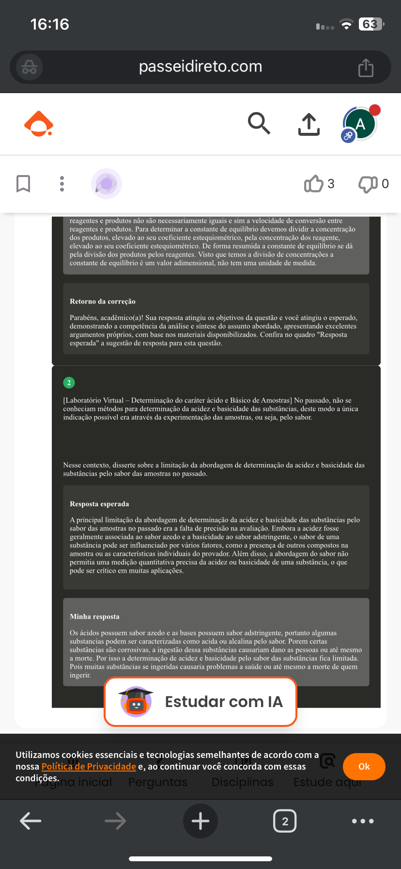 <p>16:16 63 passeidireto.com A 3 0 reagentes e produtos não são necessariamente iguais e sim a velocidade de conversão entre reagentes e produtos. Para determinar a constante de equilibrio devemos dividir a concentração dos produtos, elevado ao seu coeficiente estequiométrico, pela concentração dos reagente, elevado ao seu coeficiente estequiométrico. De forma resumida a constante de equilibrio se dá pela divisão dos produtos pelos reagentes. Visto que temos a divisão de concentrações a constante de equilibrio é um valor adimensional, não tem uma unidade de medida. Retorno da correção Parabéns, acadêmico(a)! Sua resposta atingiu os objetivos da questão e você atingiu esperado, demonstrando a competência da análise e síntese do assunto abordado, apresentando excelentes argumentos com base nos materiais disponibilizados. Confira no quadro "Resposta esperada" a sugestão de resposta para esta 2 [Laboratório Virtual - Determinação do caráter ácido e Básico de No não se conheciam métodos para determinação da acidez e basicidade das substâncias, deste modo a única indicação possível era através da experimentação das amostras, ou seja, pelo sabor. Nesse contexto, disserte sobre a limitação da abordagem de determinação da acidez e basicidade das substâncias pelo sabor das amostras no passado. Resposta esperada A principal limitação da abordagem de determinação da acidez e basicidade das substâncias pelo sabor das amostras no passado era a falta de precisão na Embora a acidez fosse geralmente associada ao sabor azedo e a basicidade ao sabor adstringente, sabor de uma substância pode ser influenciado por vários fatores, como a presença de outros compostos na amostra ou as características individuais do provador Além disso. a abordagem do sabor não permitia uma medição quantitativa precisa da acidez ou basicidade de uma substância, que pode ser crítico em muitas aplicações. Minha resposta Os ácidos possuem sabor azedo e as bases possuem sabor adstringente, portanto algumas substancias podem ser caracterizadas como acida ou alcalina pelo sabor. Porem certas substâncias são a ingestão dessa substâncias causariam dano as pessoas ou até mesmo a morte. Por isso a determinação de acidez e basicidade pelo sabor das substâncias fica limitada Pois muitas substâncias se ingeridas causaria problemas a saúde ou até mesmo a morte de quem ingerir. Estudar com IA Utilizamos cookies essenciais e tecnologias semelhantes de acordo com a nossa Política de Privacidade e, ao continuar você concorda com essas Q Ok condições. gina inicial Perguntas Disciplinas Estude aqui + 2</p>