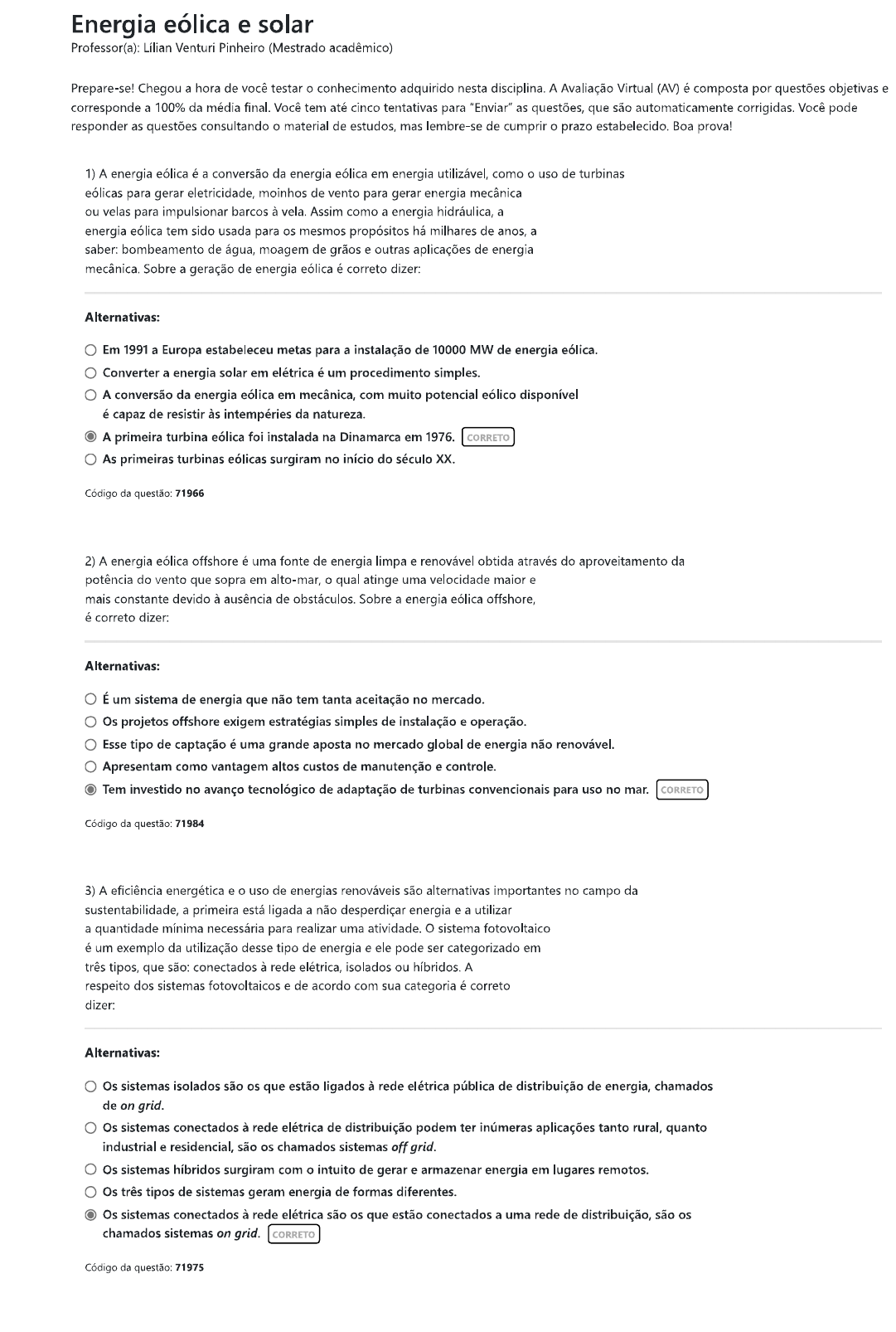 <p>Energia eólica e solar Professor(a): Lílian Venturi Pinheiro (Mestrado acadêmico) Prepare-se! Chegou a hora de você testar conhecimento adquirido nesta disciplina. A Avaliação Virtual (AV) é composta por questões objetivas e corresponde a 100% da média final. Você tem até cinco tentativas para "Enviar" as questões, que são automaticamente corrigidas. Você pode responder as questões consultando o material de estudos, mas lembre-se de cumprir o prazo estabelecido. Boa prova! 1) A energia eólica é a conversão da energia eólica em energia utilizável, como uso de turbinas eólicas para gerar eletricidade, moinhos de vento para gerar energia mecânica ou velas para impulsionar barcos à vela. Assim como a energia hidráulica, a energia eólica tem sido usada para os mesmos propósitos há milhares de anos, a saber: bombeamento de água, moagem de grãos e outras aplicações de energia mecânica. Sobre a geração de energia eólica é correto dizer: Alternativas: Em 1991 a Europa estabeleceu metas para a instalação de 10000 MW de energia eólica. Converter a energia solar em elétrica é um procedimento simples. A conversão da energia eólica em mecânica, com muito potencial eólico disponível é capaz de resistir às intempéries da natureza. A primeira turbina eólica foi instalada na Dinamarca em 1976. CORRETO As primeiras turbinas eólicas surgiram no início do século XX. Código da questão: 71966 2) A energia eólica offshore é uma fonte de energia limpa e renovável obtida através do aproveitamento da potência do vento que sopra em alto-mar, o qual atinge uma velocidade maior e mais constante devido à ausência de obstáculos. Sobre a energia eólica offshore, é correto dizer: Alternativas: É um sistema de energia que não tem tanta aceitação no mercado. Os projetos offshore exigem estratégias simples de instalação e operação. Esse tipo de captação é uma grande aposta no mercado global de energia não renovável. Apresentam como vantagem altos custos de manutenção e controle. Tem investido no avanço tecnológico de adaptação de turbinas convencionais para uso no mar. CORRETO Código da questão: 71984 3) A eficiência energética e o uso de energias renováveis são alternativas importantes no campo da sustentabilidade, a primeira está ligada a não desperdiçan energia e a utilizar a quantidade mínima necessária para realizar uma atividade. sistema fotovoltaico é um exemplo da utilização desse tipo de energia e ele pode ser categorizado em três tipos, que são: conectados à rede elétrica, isolados ou híbridos. A respeito dos sistemas fotovoltaicos e de acordo com sua categoria é correto dizer: Alternativas: Os sistemas isolados são os que estão ligados à rede elétrica pública de distribuição de energia, chamados de on grid. Os sistemas conectados à rede elétrica de distribuição podem ter inúmeras aplicações tanto rural, quanto industrial e residencial, são os chamados sistemas off grid. Os sistemas híbridos surgiram com o intuito de gerar e armazenar energia em lugares remotos. Os três tipos de sistemas geram energia de formas diferentes. Os sistemas conectados à rede elétrica são os que estão conectados a uma rede de distribuição, são os chamados sistemas on grid. CORRETO Código da questão: 71975</p><p>4) A crise mundial entre Rússia e Ucrânia tem afetado diretamente a economia global, com o aumento dos preços das commodites (que são produtos originados de recursos naturais, por exemplo: trigo, milho, petróleo, gás etc.). A questão do conflito tem afetado diretamente a economia mundial, trazendo uma série de incertezas, com o aumento do preço do barril de petróleo e do gás que já duram por várias semanas, resultando num impacto significativo no aumento do preço da gasolina, do diesel e, também, no setor de distribuição de energia. Devido a dependência dos países europeus do gás russo, o atual cenário de guerra entre Ucrânia e Rússia pode acelerar o processo de transição para fontes de energia limpa, como a eólica. Segundo o texto citado anteriormente, é correto que se afirma em: Alternativas: A importância de que os países devem preservar a segurança energética com mais eficiência, favorecendo, assim, a energia renovável de forma mais CORRETO Possibilidade dos parques eólicos onshore e perspectivas de crescimento no mercado internacional. Europeus querem aumentar esta dependência e ganhar menos autonomia do gás russo. A Europa usa esse combustível para finalidades como geração de energia elétrica em processos industriais e aquecimento no inverno. o impacto da guerra no processo de não adesão da energia limpa na Europa depende do tempo de duração da guerra. Código da questão: 71969 5) Dentro da matriz energética brasileira existe, ainda, as seguintes definições para geração distribuída: Alternativas: Nanogeração e microgeração distribuída. Picogeração e nanogeração distribuída. Picogeração e macrogeração distribuída. Microgeração e minigeração distribuída. CORRETO Subgeração e macrogeração distribuída. Código da questão: 71973 6) Os sistemas eólicos podem ser utilizados em algumas aplicações e seguem basicamente uma configuração básica, constituídos de uma unidade de controle e, em determinados casos, uma unidade de armazenamento. Quais das aplicações citadas a seguir dizem respeito a uma aplicação da energia eólica? Assinale a alternativa correta: Alternativas: Sistema hídrico. Sistema químico. Sistema fotovoltaico. Sistema isolado. CORRETO Sistema nuclear. Código da questão: 71982 7) Alguns estudos indicam que a energia solar se tornará a principal fonte de energia elétrica mundial devido às suas vantagens, exceto: Alternativas: o fato de ser uma energia renovável, limpa e barata. A possibilidade de instalação de painéis fotovoltaicos em regiões distantes ou isoladas.</p><p>A baixa manutenção.