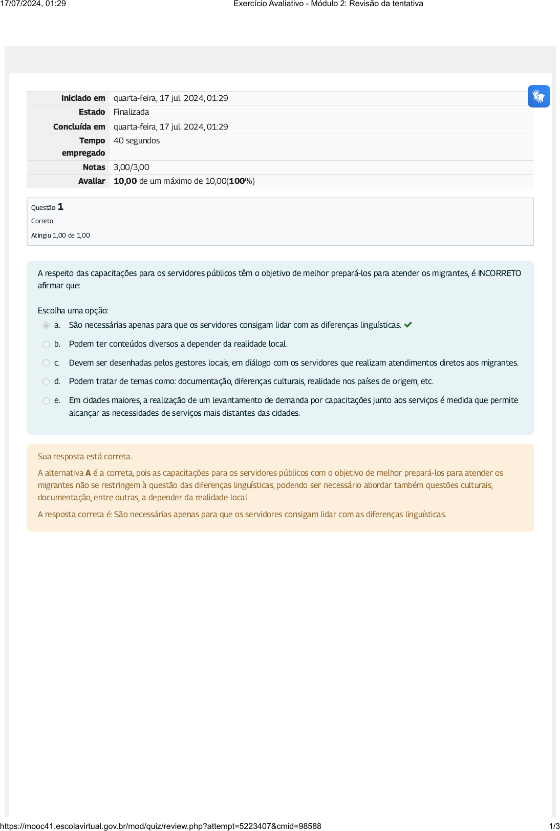 <p>Iniciado em quarta-feira, 17 jul. 2024, 01:29</p><p>Estado Finalizada</p><p>Concluída em quarta-feira, 17 jul. 2024, 01:29</p><p>Tempo</p><p>empregado</p><p>40 segundos</p><p>Notas 3,00/3,00</p><p>Avaliar 10,00 de um máximo de 10,00(100%)</p><p>Questão 1</p><p>Correto</p><p>Atingiu 1,00 de 1,00</p><p>A respeito das capacitações para os servidores públicos têm o objetivo de melhor prepará-los para atender os migrantes, é INCORRETO</p><p>a�rmar que:</p><p>Escolha uma opção:</p><p>a. São necessárias apenas para que os servidores consigam lidar com as diferenças linguísticas. </p><p>b. Podem ter conteúdos diversos a depender da realidade local.</p><p>c. Devem ser desenhadas pelos gestores locais, em diálogo com os servidores que realizam atendimentos diretos aos migrantes.</p><p>d. Podem tratar de temas como: documentação, diferenças culturais, realidade nos países de origem, etc.</p><p>e. Em cidades maiores, a realização de um levantamento de demanda por capacitações junto aos serviços é medida que permite</p><p>alcançar as necessidades de serviços mais distantes das cidades.</p><p>Sua resposta está correta.</p><p>A alternativa A é a correta, pois as capacitações para os servidores públicos com o objetivo de melhor prepará-los para atender os</p><p>migrantes não se restringem à questão das diferenças linguísticas, podendo ser necessário abordar também questões culturais,</p><p>documentação, entre outras, a depender da realidade local.</p><p>A resposta correta é: São necessárias apenas para que os servidores consigam lidar com as diferenças linguísticas.</p><p>17/07/2024, 01:29 Exercício Avaliativo - Módulo 2: Revisão da tentativa</p><p>https://mooc41.escolavirtual.gov.br/mod/quiz/review.php?attempt=5223407&cmid=98588 1/3</p><p>Questão 2</p><p>Correto</p><p>Atingiu 1,00 de 1,00</p><p>Questão 3</p><p>Correto</p><p>Atingiu 1,00 de 1,00</p><p>Sobre as capacitações de servidores públicos no atendimento aos migrantes, é INCORRETO a�rmar que:</p><p>Escolha uma opção:</p><p>a. Podem ser realizadas por meio de parcerias com organizações da sociedade civil, parcerias com universidades, parcerias com</p><p>outros entes governamentais que tenham experiência no tema.</p><p>b. Pode-se buscar a oferta de cursos junto a organizações internacionais e órgãos federais (como as defensorias públicas).</p><p>c. Devem ser realizadas apenas pela formação de facilitadores de aprendizagem entre os servidores públicos que possam</p><p>replicar o conteúdo.</p><p></p><p>d. Pode-se buscar a oferta existente de cursos de Educação a Distância (EaD) ou a elaboração de um curso especí�co nesse</p><p>formato.</p><p>e. Cada gestor local deve avaliar a sua realidade e os recursos a que tem acesso para decidir qual o melhor formato a ser</p><p>adotado.</p><p>Sua resposta está correta.</p><p>A alternativa C é a correta, pois as capacitações de servidores públicos no atendimento aos migrantes podem ser realizadas de</p><p>diferentes maneiras, sendo a formação de capacitadores entre os servidores públicos - os quais possam replicar o conteúdo para</p><p>outros colegas - apenas uma das possibilidades.</p><p>A resposta correta é: Devem ser realizadas apenas pela formação de facilitadores de aprendizagem entre os servidores públicos que</p><p>possam replicar o conteúdo.</p><p>Ações de sensibilização sobre os direitos dos migrantes junto à população em geral podem ser feitas com campanhas em várias mídias:</p><p>vídeos, materiais informativos impressos, rádio, realização de debates ou apoio a eventos, etc.</p><p>Ações de sensibilização sobre os direitos dos migrantes junto à população tem o objetivo de:</p><p>Escolha uma opção:</p><p>a. Formar a população para que possa futuramente atender os migrantes.</p><p>b. Levar, ao conhecimento da população em geral, informações sobre os direitos dos migrantes, combatendo a discriminação</p><p>e xenofobia e promovendo o apoio da comunidade às ações que visam garantir esses direitos.</p><p></p><p>c. Informar apenas os migrantes sobre os seus direitos.</p><p>d. Mostrar para a comunidade internacional que a sua cidade recebe bem os migrantes.</p><p>e. Atrair migrantes para a sua cidade.</p><p>Sua resposta está correta.</p><p>A alternativa B é a correta, pois as ações de sensibilização sobre os direitos dos migrantes junto à população em geral se constituem</p><p>em campanhas informativas (não de formação), voltadas não somente aos migrantes, mas à sociedade que os recebe, promovendo o</p><p>conhecimento de todos e a aproximação com o tema. Campanhas de informação sobre direitos são ações de cidadania e não visam a</p><p>atração de migrantes ou o reconhecimento internacional.</p><p>A resposta correta é: Levar, ao conhecimento da população em geral, informações sobre os direitos dos migrantes, combatendo a</p><p>discriminação e xenofobia e promovendo o apoio da comunidade às ações que visam garantir esses direitos.</p><p>17/07/2024, 01:29 Exercício Avaliativo - Módulo 2: Revisão da tentativa</p><p>https://mooc41.escolavirtual.gov.br/mod/quiz/review.php?attempt=5223407&cmid=98588 2/3</p><p>17/07/2024, 01:29 Exercício Avaliativo - Módulo 2: Revisão da tentativa</p><p>https://mooc41.escolavirtual.gov.br/mod/quiz/review.php?attempt=5223407&cmid=98588 3/3</p>