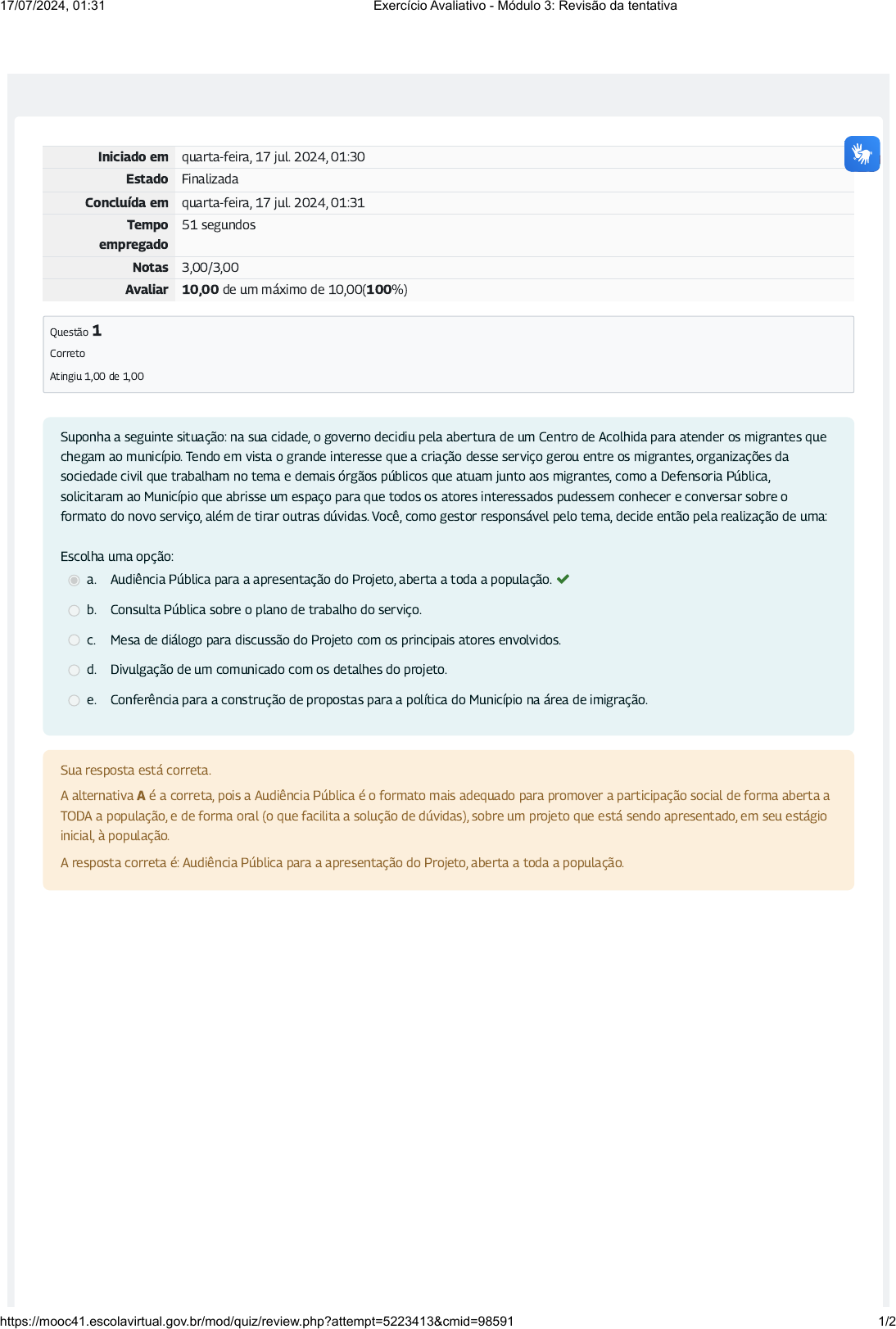 <p>Iniciado em quarta-feira, 17 jul. 2024, 01:30</p><p>Estado Finalizada</p><p>Concluída em quarta-feira, 17 jul. 2024, 01:31</p><p>Tempo</p><p>empregado</p><p>51 segundos</p><p>Notas 3,00/3,00</p><p>Avaliar 10,00 de um máximo de 10,00(100%)</p><p>Questão 1</p><p>Correto</p><p>Atingiu 1,00 de 1,00</p><p>Suponha a seguinte situação: na sua cidade, o governo decidiu pela abertura de um Centro de Acolhida para atender os migrantes que</p><p>chegam ao município. Tendo em vista o grande interesse que a criação desse serviço gerou entre os migrantes, organizações da</p><p>sociedade civil que trabalham no tema e demais órgãos públicos que atuam junto aos migrantes, como a Defensoria Pública,</p><p>solicitaram ao Município que abrisse um espaço para que todos os atores interessados pudessem conhecer e conversar sobre o</p><p>formato do novo serviço, além de tirar outras dúvidas. Você, como gestor responsável pelo tema, decide então pela realização de uma:</p><p>Escolha uma opção:</p><p>a. Audiência Pública para a apresentação do Projeto, aberta a toda a população. </p><p>b. Consulta Pública sobre o plano de trabalho do serviço.</p><p>c. Mesa de diálogo para discussão do Projeto com os principais atores envolvidos.</p><p>d. Divulgação de um comunicado com os detalhes do projeto.</p><p>e. Conferência para a construção de propostas para a política do Município na área de imigração.</p><p>Sua resposta está correta.</p><p>A alternativa A é a correta, pois a Audiência Pública é o formato mais adequado para promover a participação social de forma aberta a</p><p>TODA a população, e de forma oral (o que facilita a solução de dúvidas), sobre um projeto que está sendo apresentado, em seu estágio</p><p>inicial, à população.</p><p>A resposta correta é: Audiência Pública para a apresentação do Projeto, aberta a toda a população.</p><p>17/07/2024, 01:31 Exercício Avaliativo - Módulo 3: Revisão da tentativa</p><p>https://mooc41.escolavirtual.gov.br/mod/quiz/review.php?attempt=5223413&cmid=98591 1/2</p><p>Questão 2</p><p>Correto</p><p>Atingiu 1,00 de 1,00</p><p>Questão 3</p><p>Correto</p><p>Atingiu 1,00 de 1,00</p><p>Sobre os Conselhos de Políticas para Migrantes, é INCORRETO a�rmar que:</p><p>Escolha uma opção:</p><p>a. São órgãos colegiados permanentes que participam na formulação, no monitoramento e na avaliação das políticas da temática</p><p>para a qual foram instituídos.</p><p>b. São responsáveis por executar as ações previstas na estratégia local de acolhimento para migrantes. </p><p>c. Podem ser consultivos ou deliberativos.</p><p>d. A representação da sociedade civil pode seguir diferentes formatos (membros de associações de migrantes, de coletivos não</p><p>formalizados, de organizações de apoio a migrantes ou, ainda, migrantes não associados).</p><p>e. São orientados pelo princípio da paridade, ou seja, metade de seus membros representará o Poder Público, enquanto a outra</p><p>metade representará a sociedade civil.</p><p>Sua resposta está correta.</p><p>A alternativa B é a correta, pois os Conselhos de Políticas públicas não são órgãos de caráter executório. Esses órgãos podem ter</p><p>caráter consultivo ou deliberativo, ou seja, manifestam opiniões ou decidem sobre a condução de determinada política pública que será</p><p>executada pelos órgãos responsáveis.</p><p>A resposta correta é: São responsáveis por executar as ações previstas na estratégia local de acolhimento para migrantes.</p><p>Manifestações culturais dos migrantes como festas tradicionais e feiras são momentos de expressão de suas culturas e identidades.</p><p>São diversas as ações possíveis para incentivá-las. Identi�que a conduta que NÃO incentiva essas manifestações e as trocas com a</p><p>sociedade de origem:</p><p>Escolha uma opção:</p><p>a. Adequação de editais na área de cultura para a participação de migrantes.</p><p>b. Apoio na elaboração de projetos de migrantes para a busca de �nanciamento.</p><p>c. Fornecimento de infraestrutura para festas e feiras de migrantes.</p><p>d. A realização de uma competição entre as comunidades migrantes para avaliar quem realiza a melhor festa tradicional da</p><p>cidade, que será escolhida para receber apoio público.</p><p></p><p>e. Divulgação de festas e eventos, e inclusão nos calendários o�ciais dos municípios.</p><p>Sua resposta está correta.</p><p>A alternativa D é a correta, pois submeter as comunidades migrantes e suas manifestações culturais a uma comparação entre si para</p><p>escolher aquela que merece obter apoio não constitui um incentivo a manifestações tão diversas, de comunidades diversas, com</p><p>tamanhos diversos. Isso não signi�ca que não devam existir requisitos objetivos e avaliação da disponibilidade de recursos para o</p><p>fornecimento de apoio público.</p><p>A resposta correta é: A realização de uma competição entre as comunidades migrantes para avaliar quem realiza a melhor festa</p><p>tradicional da cidade, que será escolhida para receber apoio público.</p><p>17/07/2024, 01:31 Exercício Avaliativo - Módulo 3: Revisão da tentativa</p><p>https://mooc41.escolavirtual.gov.br/mod/quiz/review.php?attempt=5223413&cmid=98591 2/2</p>