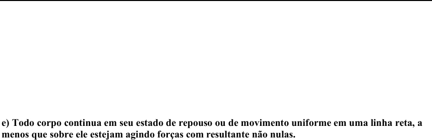 <p>Lista de exercícios 1º Leis de Newton</p><p>1. (Vunesp-SP) Assinale a alternativa que apresenta o enunciado da Lei de Inércia, também</p><p>conhecida como Primeira Lei de de Newton.</p><p>a ) Qualquer planeta gira em torno do Sol descrevendo uma órbita elíptica, da qual o Sol ocupa um</p><p>dos focos.</p><p>b) Dois corpos quaisquer se atraem com uma força proporcional ao produto de suas massas e</p><p>inversamente proporcional ao quadrado da distância entre eles.</p><p>c) Quando um corpo exerce uma força sobre outro, este reage sobre o primeiro com uma força de</p><p>mesma intensidade e direção, mas de sentido contrário.</p><p>d) A aceleração que um corpo adquire é diretamente proporcional à resultante das forças que nele</p><p>atuam, e tem mesma direção e sentido dessa resultante.</p><p>e) Todo corpo continua em seu estado de repouso ou de movimento uniforme em uma linha reta, a</p><p>menos que sobre ele estejam agindo forças com resultante não nulas.</p><p>2. (Vunesp-SP) As estatísticas indicam que o uso do cinto de segurança deve ser obrigatório para</p><p>prevenir lesões mais graves em motoristas e passageiros no caso de acidentes. Fisicamente, a função</p><p>do cinto está relacionada com a:</p><p>a) Primeira Lei de Newton.</p><p>b) Lei de Snell.</p><p>c) Lei de Ampère.</p><p>d) Lei de Ohm.</p><p>e) Primeira Lei de Kepler.</p><p>3. (UFMG) Um corpo de massa m está sujeito à ação de uma força F que o desloca segundo um eixo</p><p>vertical em sentido contrário ao da gravidade.</p><p>Se esse corpo se move com velocidade constante é porque:</p><p>a) A força F é maior do que a da gravidade.</p><p>b) A força resultante sobre o corpo é nula.</p><p>c) A força F é menor do que a da gravidade.</p><p>d) A diferença entre os módulos das duas forças é diferente de zero.</p><p>e) A afirmação da questão está errada, pois qualquer que seja F o corpo estará acelerado porque</p><p>sempre existe a aceleração da gravidade.</p><p>4. (UFMG) A Terra atrai um pacote de arroz com uma força de 49 N. Pode-se então afirmar que o</p><p>pacote de arroz:</p><p>a) atrai a Terra com uma força de 49 N.</p><p>b) atrai a Terra com uma força menor do que 49 N.</p><p>c) não exerce força nenhuma sobre a Terra.</p><p>d) repele a Terra com uma força de 49 N.</p><p>e) repele a Terra com uma força menor do que 49 N.</p><p>5-(Univali-SC) Uma única força atua sobre uma partícula em movimento. A partir do instante em que cessar a atuação da</p><p>força, o movimento da partícula será:</p><p>a) retilíneo uniformemente acelerado.</p><p>b) circular uniforme.</p><p>c) retilíneo uniforme.</p><p>d) retilíneo uniformemente retardado.</p><p>e) nulo. A partícula pára.</p><p>6- (UEPA) Na parte final de seu livro Discursos e demonstrações concernentes a duas novas ciências, publicado em 1638,</p><p>Galileu Galilei trata do movimento do projétil da seguinte maneira: "Suponhamos um corpo qualquer, lançado ao longo de</p><p>um plano horizontal, sem atrito; sabemos que esse corpo se moverá indefinidamente ao longo desse plano, com um</p><p>movimento uniforme e perpétuo, se tal plano for limitado."</p><p>O princípio físico com o qual se pode relacionar o trecho destacado acima é:</p><p>a) o princípio da inércia ou primeira lei de Newton.</p><p>b) o prinicípio fundamental da Dinâmica ou Segunda Lei de Newton.</p><p>c) o princípio da ação e reação ou terceira Lei de Newton.</p><p>d) a Lei da gravitação Universal.</p><p>e) o princípio da energia cinética</p><p>7-(PUC-MG) Abaixo, apresentamos três situações do seu dia-a-dia que devem ser associados com as</p><p>três leis de Newton.</p><p>1. Ao pisar no acelerador do seu carro, o</p><p>velocímetro pode indicar variações de</p><p>velocidade.</p><p>A) Primeira Lei, ou Lei da Inércia.</p><p>2. João machucou o pé ao chutar uma</p><p>pedra.</p><p>B) segunda Lei ( F = m . a )</p><p>3. Ao fazer uma curva ou frear, os</p><p>passageiros de um ônibus que viajam em</p><p>pé devem se segurar.</p><p>C) Terceira Lei de Newton, ou Lei da</p><p>Ação e Reação.</p><p>A opção que apresenta a sequência de associação correta é:</p><p>a) A1, B2, C3</p><p>b) A2, B1, C3</p><p>c) A2, B3, C1</p><p>d) A3, B1, C2</p><p>e) A3, B2, C1</p><p>8-CESCEA-SP) Um cavalo puxa uma carroça em movimento. Qual das forças enumeradas a seguir</p><p>é responsável pelo movimento do cavalo?</p><p>a) A força de atrito entre a carroça e o solo.</p><p>b) A força que o cavalo exerce sobre a carroça.</p><p>c) A força que o solo exerce sobre o cavalo.</p><p>d) A força que o cavalo exerce sobre o solo.</p><p>e) A força que a carroça exerce sobre o cavalo.</p><p>9. (UnB-DF) Uma nave espacial é capaz de fazer todo o percurso da viagem, após o lançamento,</p><p>com os foguetes desligados (exceto para pequenas correções de curso); desloca-se à custa apenas do</p><p>impulso inicial da largada da atmosfera. Esse fato ilustra a:</p><p>a) Terceira Lei de Kepler.</p><p>b) Segunda Lei de Newton.</p><p>c) Primeira Lei de Newton.</p><p>d) Lei de conservação do momento angular.</p><p>e) Terceira Lei de Newton.</p><p>10-(Unisinos-RS) Em um trecho de uma estrada retilínea e horizontal, o velocímetro de um carro</p><p>indica um valor constante. Nesta situação:</p><p>I - a força resultante sobre o carro tem o mesmo sentido que o da velocidade.</p><p>II - a soma vetorial das forças que atuam sobre o carro é nula.</p><p>III - a aceleração do carro é nula.</p><p>a) somente I é correta.</p><p>b) somente II é correta.</p><p>c) apenas I e II são corretas.</p><p>d) apenas I e III são corretas.</p><p>e) I, II e III são corretas</p><p>11-(FATEC-SP) Dadas as afirmações:</p><p>I - Um corpo pode permanecer em repouso quando solicitado por forças externa.</p><p>II - As forças de ação e reação têm resultante nula, provocando sempre o equilíbrio do corpo em</p><p>que atuam.</p><p>III - A força resultante aplicada sobre 
