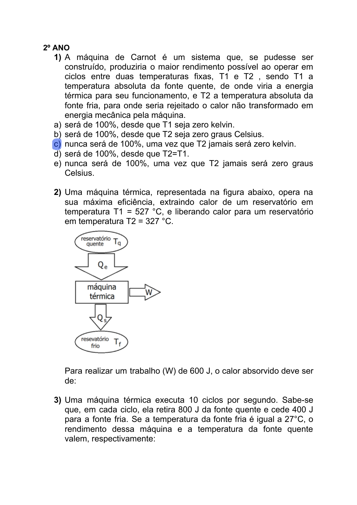 <p>2º ANO</p><p>1) A máquina de Carnot é um sistema que, se pudesse ser</p><p>construído, produziria o maior rendimento possível ao operar em</p><p>ciclos entre duas temperaturas fixas, T1 e T2 , sendo T1 a</p><p>temperatura absoluta da fonte quente, de onde viria a energia</p><p>térmica para seu funcionamento, e T2 a temperatura absoluta da</p><p>fonte fria, para onde seria rejeitado o calor não transformado em</p><p>energia mecânica pela máquina.</p><p>a) será de 100%, desde que T1 seja zero kelvin.</p><p>b) será de 100%, desde que T2 seja zero graus Celsius.</p><p>c) nunca será de 100%, uma vez que T2 jamais será zero kelvin.</p><p>d) será de 100%, desde que T2=T1.</p><p>e) nunca será de 100%, uma vez que T2 jamais será zero graus</p><p>Celsius.</p><p>2) Uma máquina térmica, representada na figura abaixo, opera na</p><p>sua máxima eficiência, extraindo calor de um reservatório em</p><p>temperatura T1 = 527 °C, e liberando calor para um reservatório</p><p>em temperatura T2 = 327 °C.</p><p>Para realizar um trabalho (W) de 600 J, o calor absorvido deve ser</p><p>de:</p><p>3) Uma máquina térmica executa 10 ciclos por segundo. Sabe-se</p><p>que, em cada ciclo, ela retira 800 J da fonte quente e cede 400 J</p><p>para a fonte fria. Se a temperatura da fonte fria é igual a 27°C, o</p><p>rendimento dessa máquina e a temperatura da fonte quente</p><p>valem, respectivamente:</p><p>a) 20%; 327 K.</p><p>b) 30%; 327 K.</p><p>c) 40%; 700 K.</p><p>d) 50%; 600 K.</p><p>e) 50%; 700 K.</p><p>4) Uma máquina foi construída, cujo rendimento é igual a 0,1. Se</p><p>essa máquina realiza um trabalho de 10 J, é CORRETO afirmar</p><p>que a quantidade de calor rejeitada ao reservatório de menor</p><p>temperatura foi, em joules, de:</p><p>a) 100</p><p>b) 99</p><p>c) 90</p><p>d) 10</p><p>e) 1</p><p>5) Uma máquina térmica que opera segundo o Ciclo de Carnot tem</p><p>temperatura da sua fonte quente 827 ºC e temperatura da fonte</p><p>fria -53ºC. Calcule o rendimento da máquina.</p><p>6) A cada ciclo, uma máquina térmica extrai 45 kJ de calor da sua</p><p>fonte quente e descarrega 36 kJ de calor na sua fonte fria. O</p><p>rendimento que essa máquina pode ter é de:</p><p>7) Uma máquina de Carnot cuja fonte fria está a 17 ºC tem um</p><p>rendimento de 40%. De quanto deve ser elevada a temperatura da</p><p>fonte quente para que o rendimento aumente em 50%?</p><p>8) (EsPCEx) Um motor térmico funciona segundo o ciclo de Carnot.</p><p>A temperatura da fonte quente vale 323 ºC e a da fonte fria vale</p><p>25ºC. O rendimento desse motor é de:</p><p>9) Ao construir uma máquina de Carnot, um engenheiro percebeu</p><p>que seu rendimento era de 25%. Se a fonte fria trabalha a 25 °C, a</p><p>temperatura da fonte quente, em °C, de tal motor será</p><p>aproximadamente:</p><p>10) Uma máquina térmica de Carnot opera entre uma fonte quente</p><p>a 600 K e uma fonte fria a 350 K. Em cada ciclo, ela absorve 1500</p><p>J de calor da fonte quente.</p><p>a) Qual é a eficiência dessa máquina térmica de Carnot?</p><p>b) Quanto calor é rejeitado para a fonte fria em cada ciclo?</p><p>c) Quanto trabalho é realizado em cada ciclo?</p>