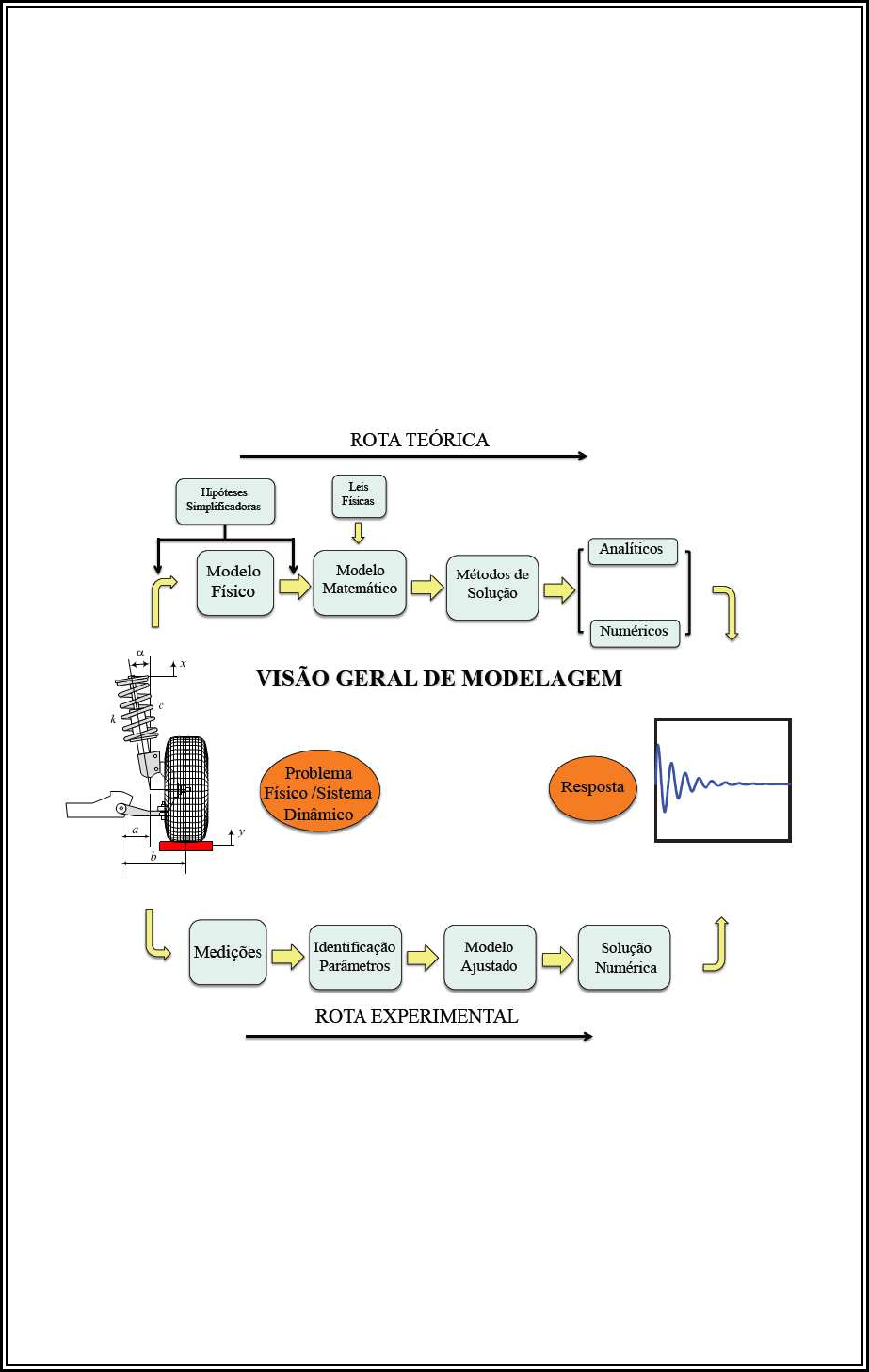 <p>UNIVERSIDADE FEDERAL DA PARAÍBA</p><p>CENTRO DE TECNOLOGIA</p><p>DEPARTAMENTO DE ENGENHARIA MECÂNICA</p><p>VIBRAÇÕES DOS SISTEMAS MECÂNICOS</p><p>VIBRAÇÕES FORÇADAS HARMONICAMENTE DE</p><p>SISTEMAS DE 1 GL</p><p>N O T A S D E A U L A S</p><p>Virgílio Mendonça da Costa e Silva</p><p>S e t e m b r o – 2 0 2 4</p><p>2</p><p>4. Vibrações Forçadas com e sem Amortecimento de Sistemas com 1 GL</p><p>Comentamos nos capítulos anteriores que a resposta de um sistema mecânico</p><p>depende do amortecimento presente no sistema e da força de excitação imposta ao</p><p>mesmo. No capitulo anterior vimos como o amortecimento interfere nos sistemas</p><p>com vibrações livres. Neste capitulo observaremos como o sistema se comporta sob</p><p>a ação de uma força de excitação na presença ou não de um amortecimento.</p><p>Começaremos com excitação harmônica e em seguida estenderemos para excitação</p><p>não harmônica.</p><p>4.1 Vibrações Forçada Harmonicamente</p><p>A excitação harmônica é muitas vezes encontrada em sistemas mecânicos. O</p><p>caso mais comum é o desequilíbrio ou desbalanceamento de sistemas rotativos.</p><p>Embora a excitação harmônica pura seja menos frequente que a periódica ou outros</p><p>tipos é essencial analisarmos o comportamento de um sistema a ela submetido, a fim</p><p>de compreendermos como o mesmo responderá a tipos mais comuns de excitação. A</p><p>excitação harmônica pode ser sob a forma de uma força ou um deslocamento,</p><p>aplicada em qualquer pondo do sistema.</p><p>4.1.1 Determinação da Equação Diferencial do Movimento</p><p>4.1.1.1 Método de Somatório de Forças (Newton)</p><p>Considere um sistema de um grau de liberdade, composto de uma massa M ,</p><p>uma mola de massa desprezível e rigidez K e um amortecedor viscoso de massa</p><p>desprezível, com coeficiente de amortecimento C , excitado por uma força harmônica</p><p>ω0F F sen t= , como representado pela Figura 4.1:</p><p>M</p><p>CK</p><p>∆</p><p>CK</p><p>M</p><p>Peso</p><p>K ∆</p><p>Posição sem Deflexão</p><p>Sistema em Equilibrio Estático</p><p>MX</p><p>K (∆+X)</p><p>Peso</p><p>Xɺ Xɺɺ</p><p>Sistema em Movimento</p><p>C Xɺ</p><p>Diagrama de Corpo livre</p><p>0F sen t ω</p><p>Figura 4.1 – Sistema de 1 GL com Amortecimento, Excitado Harmonicamente.</p><p>3</p><p>Aplicando somatório de forças (Segunda Lei do Movimento de Newton), ao</p><p>modelo físico da Figura 4.1, obtém-se:</p><p>( )∆ ω0M X = Peso - C X - K X F sen tɺɺ ɺ + +</p><p>ou</p><p>ω0M X + C X + K X = F sen tɺɺ ɺ (4.1)</p><p>Na equação (4.1), temos:</p><p>M Xɺɺ → Força relacionada ao movimento (Força de Inércia).</p><p>C Xɺ → Força do amortecedor (Força de Amortecimento).</p><p>K X → Força da mola (Força de Rigidez).</p><p>ω0F sen t → Força de Excitação</p><p>0F → Amplitude da Força de Excitação.</p><p>ω → Frequência de Excitação em [rad/s]</p><p>4.1.1.2 Método de Energia Usando Equação de Lagrange</p><p>Observando o que foi feito para sistema com vibrações livres amortecidos, com</p><p>um GL, basta introduzimos o valor da força externa generalizada kQ .</p><p>A equação de Lagrange é representada por:</p><p>k</p><p>k k k k</p><p>d T T D U</p><p>- + + = Q</p><p>d t q q q qɺ ɺ</p><p>∂ ∂ ∂ ∂</p><p>∂ ∂ ∂ ∂</p><p>(4.2)</p><p>onde:</p><p>T é a energia cinética do sistema</p><p>U é a energia potencial do sistema</p><p>D é a energia dissipada do sistema</p><p>kQ é a k-éssima força externa generalizada aplicada ao sistema</p><p>kq é a k-éssima coordenada generalizada do sistema</p><p>Para um sistema de um grau de liberdade com amortecimento temos apenas</p><p>uma coordenada generalizada 1q X= . As equações de energia para o sistema são:</p><p>4</p><p>Energia Cinética:</p><p>⋅ 21</p><p>T = M X</p><p>2</p><p>ɺ (4.3)</p><p>Energia Potencial:</p><p>( )∆ 21</p><p>U K + X - MgX</p><p>2</p><p>= (4.4)</p><p>Energia Dissipada:</p><p>⋅ 21</p><p>D = C X</p><p>2</p><p>ɺ (4.5)</p><p>Calculando as parcelas da equação (4.2) com base nas equações (4.3), (4.4) e</p><p>(4.5), temos:</p><p>k</p><p>T T 1</p><p>= = M 2 X</p><p>q X 2</p><p>ɺ</p><p>ɺɺ</p><p>∂ ∂ ⋅ ⋅</p><p>∂ ∂</p><p>(4.6)</p><p>k</p><p>d T d T</p><p>= = M X</p><p>d t q d t X</p><p>ɺɺ</p><p>ɺɺ</p><p>∂ ∂ ⋅</p><p>∂ ∂</p><p>(4.7)</p><p>k</p><p>T T</p><p>= = 0</p><p>q X</p><p>∂ ∂</p><p>∂ ∂</p><p>(4.8)</p><p>k</p><p>D D 1</p><p>= = C 2 X = C X</p><p>q X 2</p><p>ɺ ɺ</p><p>ɺɺ</p><p>∂ ∂ ⋅ ⋅ ⋅</p><p>∂ ∂</p><p>(4.9)</p><p>∆</p><p>k</p><p>U U 1</p><p>= = K + K 2 X - Mg = K X</p><p>q X 2</p><p>∂ ∂ ⋅ ⋅ ⋅</p><p>∂ ∂</p><p>(4.10)</p><p>( )k 0Q = F Sen tω (4.11)</p><p>Substituindo as equações (4.7), (4.8), (4.9), (4.10) e (4.11) na equação (4.2),</p><p>obtém-se:</p><p>( )0M X + C X + K X = F Sen tωɺɺ ɺ (4.12)</p><p>5</p><p>4.1.2 Solução e Análise da Equação Diferencial do Movimento</p><p>A equação (4.12) é uma equação diferencial ordinária, de segunda ordem, não</p><p>homogênea com coeficientes constantes. Portanto, sua solução é composta de duas</p><p>partes:</p><p> 1ª. Parte - Solução geral da equação diferencial homogênea associada, ou</p><p>seja: Solução geral da equação diferencial,</p><p>M X + C X + K X = 0ɺɺ ɺ (4.13)</p><p>Esta solução é a de um sistema de vibração livre com amortecimento de 1 GL,</p><p>determinada no capitulo anterior. Considerando o caso de sistema subamortecido,</p><p>tem-se:</p><p>( ) ( )ζω ζ ω ϕnt 2</p><p>n X t = Xe sen 1 - t + − (4.14)</p><p> 2ª. Parte – Uma solução particular (qualquer uma) da equação diferencial não</p><p>homogênea dada pela equação (4.12).</p><p>Esta solução particular será uma oscilação de estado permanente com a</p><p>mesma frequência da força excitação, ou seja, ω . Podemos supor que esta solução</p><p>particular seja da forma:</p><p>( )ω φx = X sen t − (4.