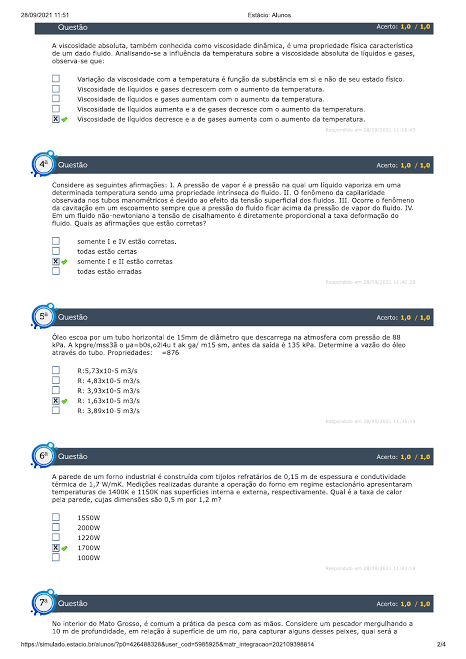 <p>Questão Acerto: 1.0 A viscosidade também conhecida como viscosidade uma propriedade física de um dado Analisando-se da temperatura sobre a viscosidade absoluta de líquidos e gases, observa-se que Variação com temperatura é função da substância em não de seu estado Viscosidade de liquidos . com aumento da Viscosidade de liquidos . aumentam com aumento da Viscosidade de liquidos aumenta de gases com aumento da Viscosidade de decresce a de gases aumenta com aumento da temperatura Questão Acerto: Considere as seguintes afirmações A pressão de vapor pressão na um liquido vaporiza em uma determinada temperatura uma propriedade da capilaridade observada nos tubos manométricos ao efeito da tensão superficial dos III. Ocorre da cavitação em um escoamento sempre que a pressão do ficar acima da pressão de vapor do IV. Em um fluido não-newtoniano a tensão de é a taxa deformação do as afirmações que estão corretas? somente e estão todas estão certas somente II estão corretas todas estão erradas Questão 1,0 / 1.0 escoa por um tubo horizontal de 15mm de que descarrega na com pressão de A ak m15 antes da saida Determine a vazão do através do Propriedades: -876 m3/s 4,83x10-5 m3/s 3.93x10-5 m3/s 1.63x10-5 m3/s m3/s Questão 1,0 / A parede de um forno industrial é com tijolos refratários de 0.15 m de condutividade térmica de 1.7 Medições realizadas durante a operação do em regime estacionário apresentaram temperaturas de 1400K e 1150K nas superficies interna Qual a taxa de calor parede, cujas dimensões 0,5 m por 1,2 m? 1550W 2000W 1220W 1700W 1000W Questão 1,0 / 1.0 No interior do Mato é comum a prática da pesca com as Considere um pescador mergulhando a 10 - de em relação à superficie de um para capturar desses qual será a</p>