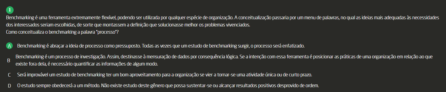 <p>1 Benchmarking é uma ferramenta extremamente flexível, podendo ser utilizada por qualquer espécie de organização. A conceitualização passaria por um menu de palavras, no qual as ideias mais adequadas às necessidades dos interessados seriam escolhidas, de sorte que montassem a definição que solucionasse melhor os problemas vivenciados. Como conceitualiza benchmarking a palavra "processo"? A Benchmarking é abraçar a ideia de processo como pressuposto. Todas as vezes que um estudo de benchmarking surgir, processo será enfatizado. Benchmarking é um processo de investigação. Assim, destinasse à mensuração de dados por consequência lógica. Se a intenção com essa ferramenta é posicionar as práticas de uma organização em relação ao que B existe fora dela, é necessário quantificar as informações de algum modo. Será improvável um estudo de benchmarking ter um bom aproveitamento para a organização se vier a tornar-se uma atividade única de curto prazo. D 0 estudo sempre obedecerá a um método. Não existe estudo deste gênero que possa sustentar-se alcançar resultados positivos desprovido de ordem.</p>