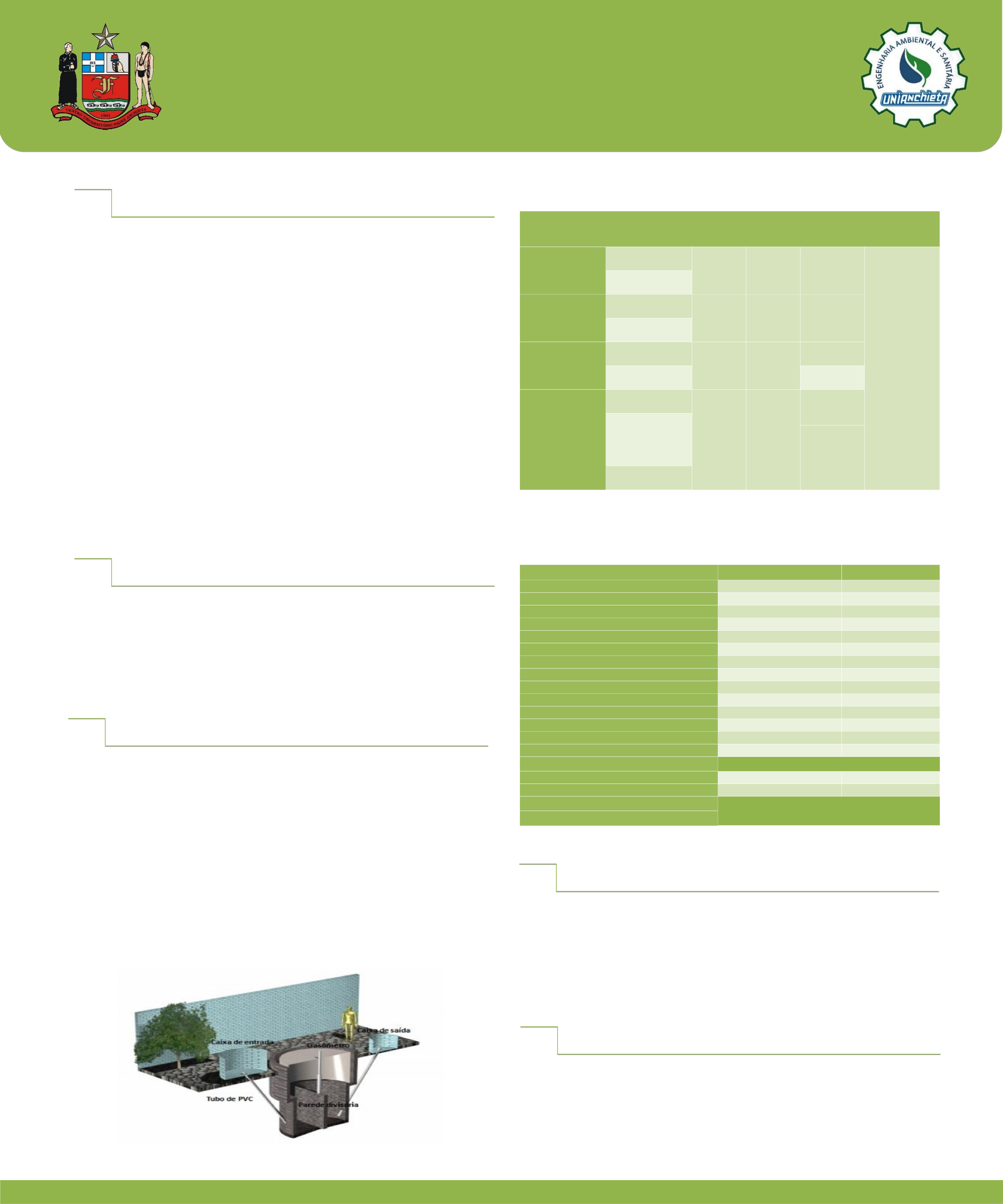 <p>Milhares de pessoas sofrem com a falta de distribuição de energia elétrica, no país, majoritariamente na região amazônica; em pequenas comunidades que vivem com sistemas isolados de energia, por conta de suas particularidades geográficas. Segundo Gaspar (2003), a implantação de um sistema confiável de biogás para suprir tal déficit, possibilita melhora qualidade de vida melhor, na educação, no acesso à saúde e a água tratada. A quantidade de energia gerada, será menor se comparada ao produzido em hidrelétricas, mas, por outro lado, os impactos sociais são mínimos e os benefícios para meio ambiente e população são expressivos (GASPAR, 2003).</p><p>O objetivo deste trabalho foi o desenvolvimento de um projeto para a implementação de um sistema de biodigestor em comunidades da Amazônia, a fim de contribuir com o desenvolvimento da população local, que em sua maioria sofre com a falta de abastecimento de gás e energia, gerando desenvolvimento econômico e social, além de melhoria nas condições ambientais e na qualidade de vida.</p><p>Revisão bibliográfica, consultas a bases cientificas e bibliografias específicas;</p><p>Consulta as legislações vigentes referentes ao biogás;</p><p>Análise comparativa e seleção de modelo;</p><p>Pesquisas de inovações tecnológicas e adaptações;</p><p>Desenvolvimento de projeto com detalhamento de especificações.</p><p>Tabela 1 - Análise comparativa dos modelos.</p><p>TEIXEIRA, B. B. T.</p><p>E-mail: thiagobuente@hotmail.com</p><p>ORIENTADORA: Raquel Carnivalle Silva Melillo.</p><p>E-mail: raquel.melillo@anchieta.br</p><p>Proposta do biodigestor</p><p>Atender uma média de 5 pessoas por família, em comunidade de 100 pessoas;</p><p>Tratar uma parcela dos resíduos orgânicos das residências das comunidades;</p><p>Seja possível capacitar as pessoas da comunidade para o gerenciamento dos recursos e da produção;</p><p>Disponibilizar uma tecnologia de gaseificação adaptada aos insumos locais, com um custo baixo na instalação e na manutenção;</p><p>Possa ser operado em qualquer temperatura.</p><p>Modelo selecionado</p><p>BRASIL. Lei nº 12.305 de 2 de agosto de 2010. Institui a Política Nacional de Resíduos Sólidos; altera a Lei no 9.605, de 12 de fevereiro de 1998; e dá outras providências.</p><p>DENAGUTTI, R.; PALHACI, P. J. C. M. Biodigestores rurais: modelo indiano, chinês e batelada. UNESP. Bauru, SP. 2002.</p><p>GASPAR, R. M. B. L. Utilização de biodigestores em pequenas e médias propriedades rurais com ênfase na agregação de valor: um estudo de caso na região de Toledo – PR. Dissertação de Mestrado, Universidade Federal de Santa Catarina, Florianópolis, 2003.</p><p>GONÇALVES, F. L.G. Biodigestores: uma alternativa para reduzir a contaminação das águas pelo esgoto. Especialização, Universidade Federal de Minas Gerais, 2012.</p><p>MATTOS, L. C. M.; FARIAS JÚNIOR, M. Manual do biodigestor sertanejo – (Cartilha simplificada e adaptada). Recife: Projeto Dom Helder Camara, 2011.</p><p>NAZARO, S. M. Desenvolvimento de um biodigestor residencial para processamento de resíduos sólidos orgânicos. Trabalho de Conclusão de Curso, Universidade Federal de Santa Catarina, Florianopólis, 2016.</p><p>Centro Universitário Padre Anchieta, Jundiaí – SP, 2019.</p><p>PROJETO E IMPLANTAÇÃO DE UM SISTEMA BIODIGESTOR PARA FORNECIMENTO ALTERNATIVO DE GÁS E ENERGIA NAS COMUNIDADES DA REGIÃO AMAZÔNICA – AM</p><p>MATERIAIS E MÉTODOS</p><p>INTRODUÇÃO</p><p>RESULTADOS E DISCUSSÕES</p><p>CONCLUSÕES</p><p>REFERÊNCIAS</p><p>Modelos Eficiência Instalação Custos Resíduos e Recursos Legislação</p><p>Biodigetsor Chinês Produção média de 2,7m³ ao dia Fácil, mão de obra especial. Baixo Substrato (ST*) não superior a 8% A Política Nacional de Resíduos Sólidos (PNRS), juntamente com a Lei 12.305/10 e o decreto 7.404/10, incentivam a implantação de biodigestores no país, estabelecendo uma ordem de prioridade na gestão e gerenciamento de resíduos sólidos.</p><p>Média de substrato 489kg/m³</p><p>Biodigestor Indiano Produção média de 3,0 m³ ao dia Fácil Gasômetro encarece custo final. Substrato (ST*) não superior a 8%</p><p>Média de substrato 538kg/m³</p><p>Homebiogás 2.0 Produção média não informada. Fácil Baixo Resíduo doméstico</p><p>Volume digerido de 15l/dia Não atende 100 pessoas.</p><p>EUCOlino Volume digerido de 200m³ Difícil Alto Resíduo agropecuário e doméstico</p><p>Fornece eletricidade à 50 casas/ano e aquece 61 casas/ano</p><p>Fornece eletricidade à 50 casas/ano e aquece 61 casas/ano Substrato (ST*) 15 – 20%</p><p>Volume digerido de 96m³ Substrato (ST*) 15 – 20%</p><p>Fonte: Deganutti et. al. (2002), Brasil (2010), Gonçalves (2012).</p><p>Elaborado pelo autor, 2019.</p><p>Item Quantidade Total (R$)</p><p>Estrutura Câmara de Entrada 1 1000,00</p><p>Cuba para câmara de entrada 1 100,00</p><p>Gasômetro 15m² 675,00</p><p>Tubulação Sanfonada 4m 271,60</p><p>Tubulação de gás 2m 54,00</p><p>Válvula de Esfera 1’’ 1 36,00</p><p>Flanges 1’’ 1 15,00</p><p>Flanges 4’’ 2 30,00</p><p>Vedação 2 50,20</p><p>Tubo PVC 32mm 30m 834,00</p><p>Mangueira alimentadora de água 1 48,90</p><p>Temporizador 1 100,00</p><p>Parafusos 32 134,40</p><p>Porcas 32 67,20</p><p>Total de Materiais 3416,30</p><p>Mão de obra pedreiro 15 diárias 750,00</p><p>Mão de obra ajudante 15 diárias 300,00</p><p>Total de Serviços 1050,00</p><p>TOTAL GERAL R$ 4466,30</p><p>Tabela 2 – Orçamento parcial para o biodigestor proposto.</p><p>Fonte: Elaborado pelo autor, baseado em Mattos (2011) e Nazaro (2016).</p><p>Na implementação de projetos de biodigestores deve prevalecer a ótica social antes da econômica. Conceder condições de desenvolvimento econômico à comunidades rurais, carentes, traz além das vantagens da vida modera, um impacto positivo no conjunto da sociedade. Cabe ressaltar, que para planejamento e gerenciamento da utilização