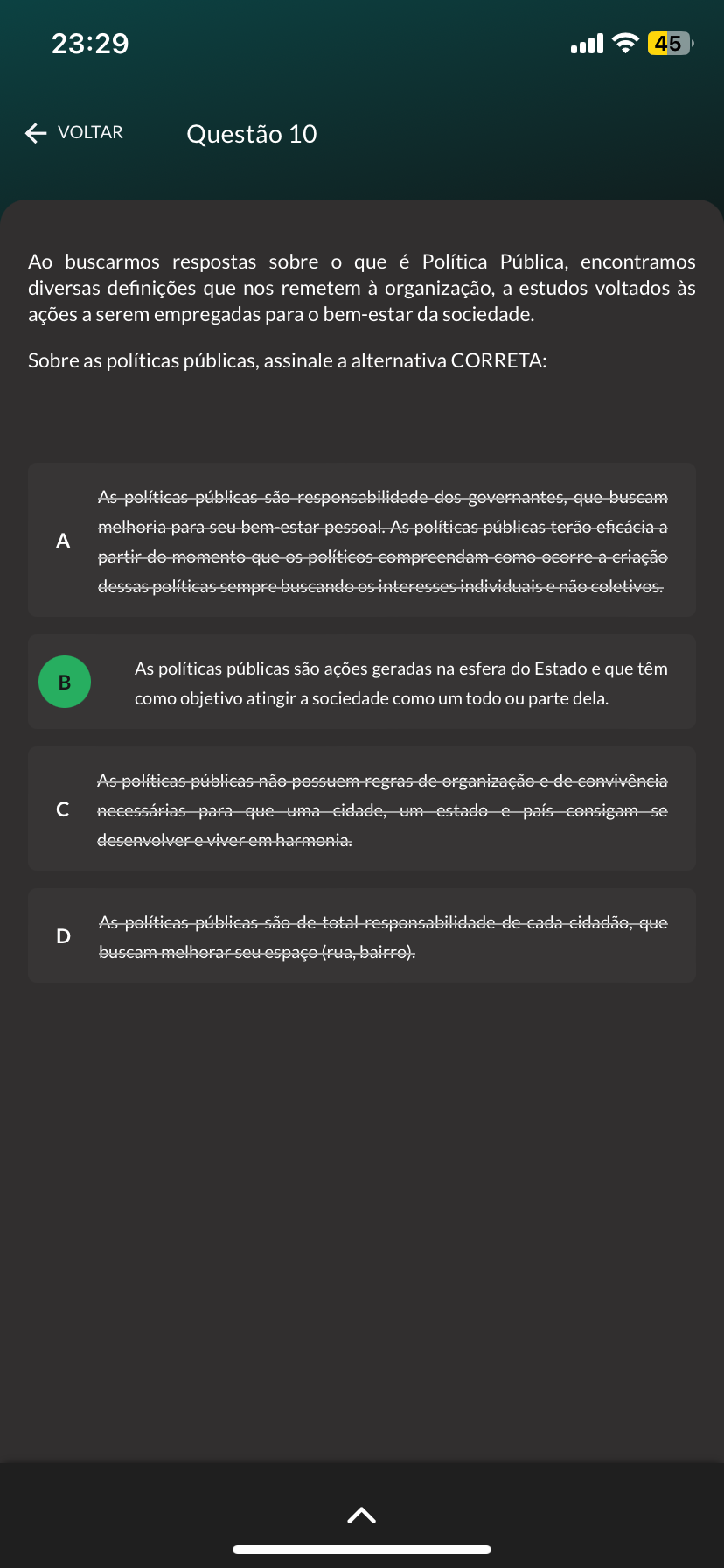 <p>23:29 45 VOLTAR Questão 10 Ao buscarmos respostas sobre que é Política Pública, encontramos diversas definições que nos remetem à organização, a estudos voltados às ações a serem empregadas para bem-estar da sociedade. Sobre as políticas públicas, assinale a alternativa CORRETA: As pelíticas públicas são responsabilidade des que para-seu bem estar pesseal As pelíticas públicas a A partir-do-momente que es compreendam come dessas pelíticas es interesses individuais e celetives. As políticas públicas são ações geradas na esfera do Estado e que têm como objetivo atingir a sociedade como um todo ou parte dela. As pelíticas públicas de e de convivência necessárias para que uma cidade, um estade país se As pelíticas públicas são de total responsabilidade de cada que D seu (rua, bairre).</p>