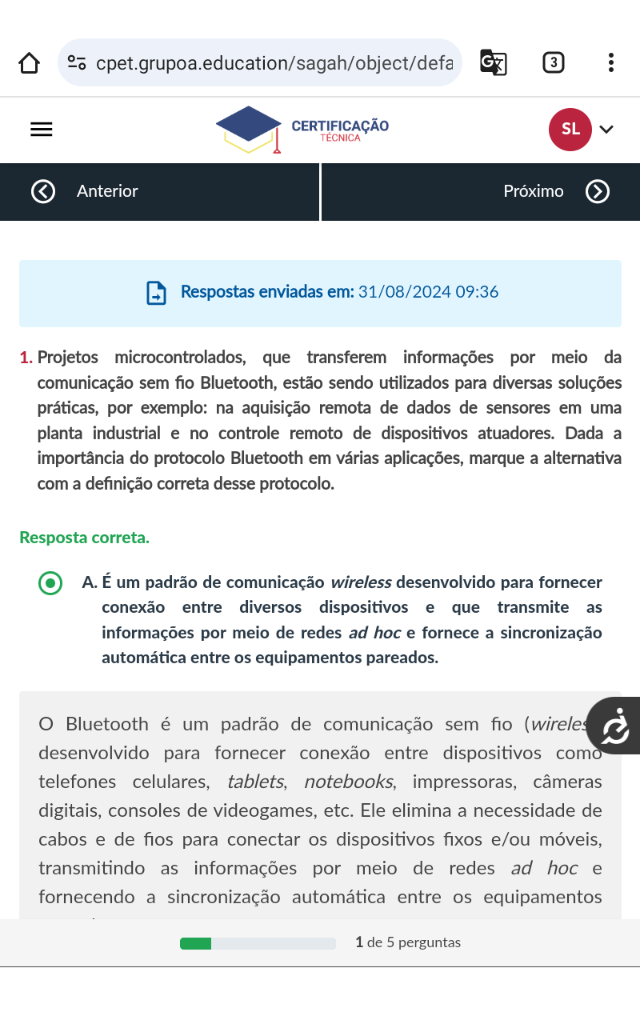 <p>cpet.grupoa.education/sagah/object/det 3 CERTIFICAÇÃO SL Anterior Próximo Respostas enviadas em: 31/08/2024 09:36 1. Projetos microcontrolados, que transferem informações por meio da comunicação sem fio Bluetooth, estão sendo utilizados para diversas soluções práticas, por exemplo: na aquisição remota de dados de sensores em uma planta industrial e no controle remoto de dispositivos atuadores. Dada a importância do protocolo Bluetooth em várias aplicações, marque a alternativa com a definição correta desse protocolo. Resposta correta. A. É um padrão de comunicação wireless desenvolvido para fornecer conexão entre diversos dispositivos e que transmite as informações por meio de redes ad hoc e fornece a sincronização automática entre os equipamentos pareados. Bluetooth é um padrão de comunicação sem fio (wireles desenvolvido para fornecer conexão entre dispositivos como telefones celulares, tablets, notebooks, impressoras, câmeras digitais, consoles de videogames, etc. Ele elimina a necessidade de cabos e de fios para conectar os dispositivos fixos e/ou móveis, transmitindo as informações por meio de redes ad hoc e fornecendo a sincronização automática entre os equipamentos 1 de 5 perguntas</p>