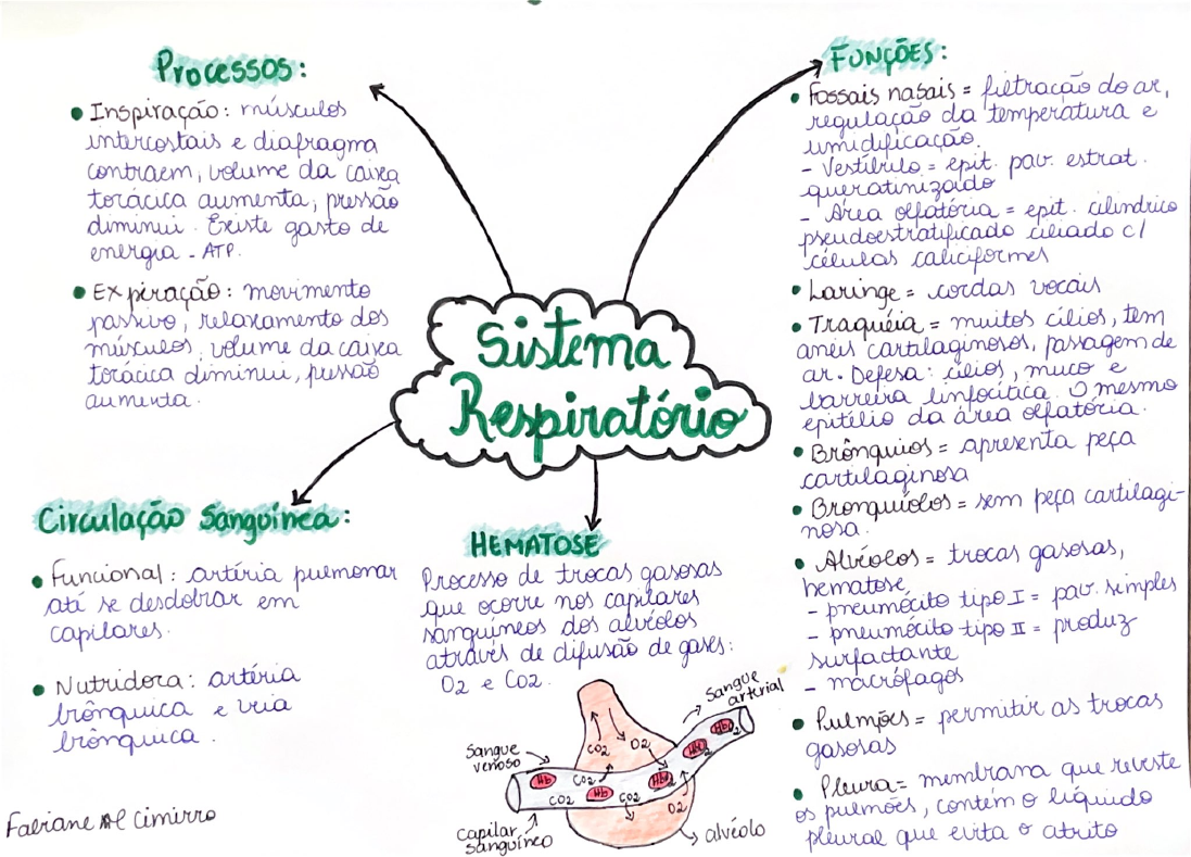 <p>Processos: Inspiração: Fossais regulação temperatura e e diafragma volume da - = estrat toracica aumenta, diminui Existe gasto de - Area = celendrico energia - ciliado cl célular EX : movimento = cordas vocais relaxamento dos volume da Sistema Traqueia = muitos cilios, tem passagem de pressao ar. cilios muco e mesmo da area = apresenta Sanguinea = sem HEMATOSE arteria Processo de trocas gasosas = trocas gasosas, se em que ocorre nos - tipo. I = pau simples dos - tipo II = produz atraves de de gases: Nutridora: arteria surfactante O2 e - e = permitir as trocas Sangue CO2 02 venoso gasoras membrana que CO2 Al cimirro 02 capilar pulmoes, liquido pleural que evita o atrito</p>