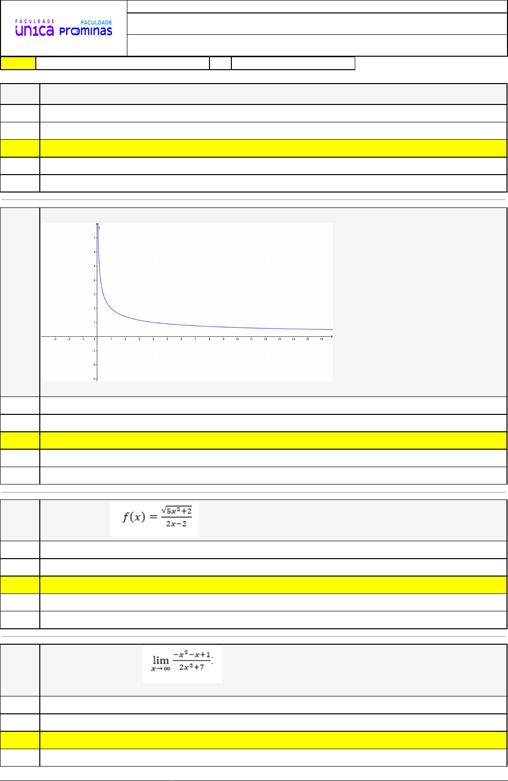 <p>14/09/2024 18:16:53 1/2</p><p>REVISÃO DE SIMULADO</p><p>Nome:</p><p>KARINE RAIANE DA SILVA SANTOS SOARES</p><p>Disciplina:</p><p>Cálculo I</p><p>Respostas corretas são marcadas em amarelo X Respostas marcardas por você.</p><p>Questão</p><p>001 A função f(x)= 6/x + x2, possui assíntota vertical igual a:</p><p>X A) x=1</p><p>B) x=6</p><p>C) x=0</p><p>D) x=2</p><p>E) x=3</p><p>Questão</p><p>002 Observe o gráfico da função f(x)=2/√x .</p><p>Podemos afirmar que:</p><p>A) A função possui uma assíntota vertical x=1</p><p>X B) A função possui uma assíntota horizontal y=2</p><p>C) A função possui uma assíntota vertical x=0</p><p>D) A função possui uma assíntota horizontal y=1</p><p>E) A função possui uma assíntota vertical x=3</p><p>Questão</p><p>003</p><p>Dada função , podemos afirmar que sua assíntota horizontal é:</p><p>A) y=2</p><p>B) y=0</p><p>X C) y=√5/2</p><p>D) y =√5</p><p>E) y=√3</p><p>Questão</p><p>004</p><p>Determine o limite</p><p>A) -2</p><p>X B) 1/2</p><p>C) -1/2</p><p>D) 0</p><p>14/09/2024 18:16:53 2/2</p><p>E) 1</p><p>Questão</p><p>005</p><p>Podemos afirmar que o limite é igual:</p><p>A) -2/3</p><p>B) 0</p><p>X C) -1/3</p><p>D) 1/3</p><p>E) +∞</p><p>Questão</p><p>006 Determine o limite da função x3 - 2x2 + 1/x para x → 0 pela direita:</p><p>A) Æ</p><p>B) -∞</p><p>X C) ∞</p><p>D) 1</p><p>E) - 1</p><p>Questão</p><p>007 Dada função f(x)=(2x+1)/(x-3), podemos afirmar que sua assíntota horizontal é</p><p>A) -2</p><p>B) -3</p><p>X C) 1</p><p>D) 0</p><p>E) 2</p><p>Questão</p><p>008</p><p>O valor do limite</p><p>X A) - 3</p><p>B) Æ</p><p>C) -∞</p><p>D) 3</p><p>E) ∞</p>