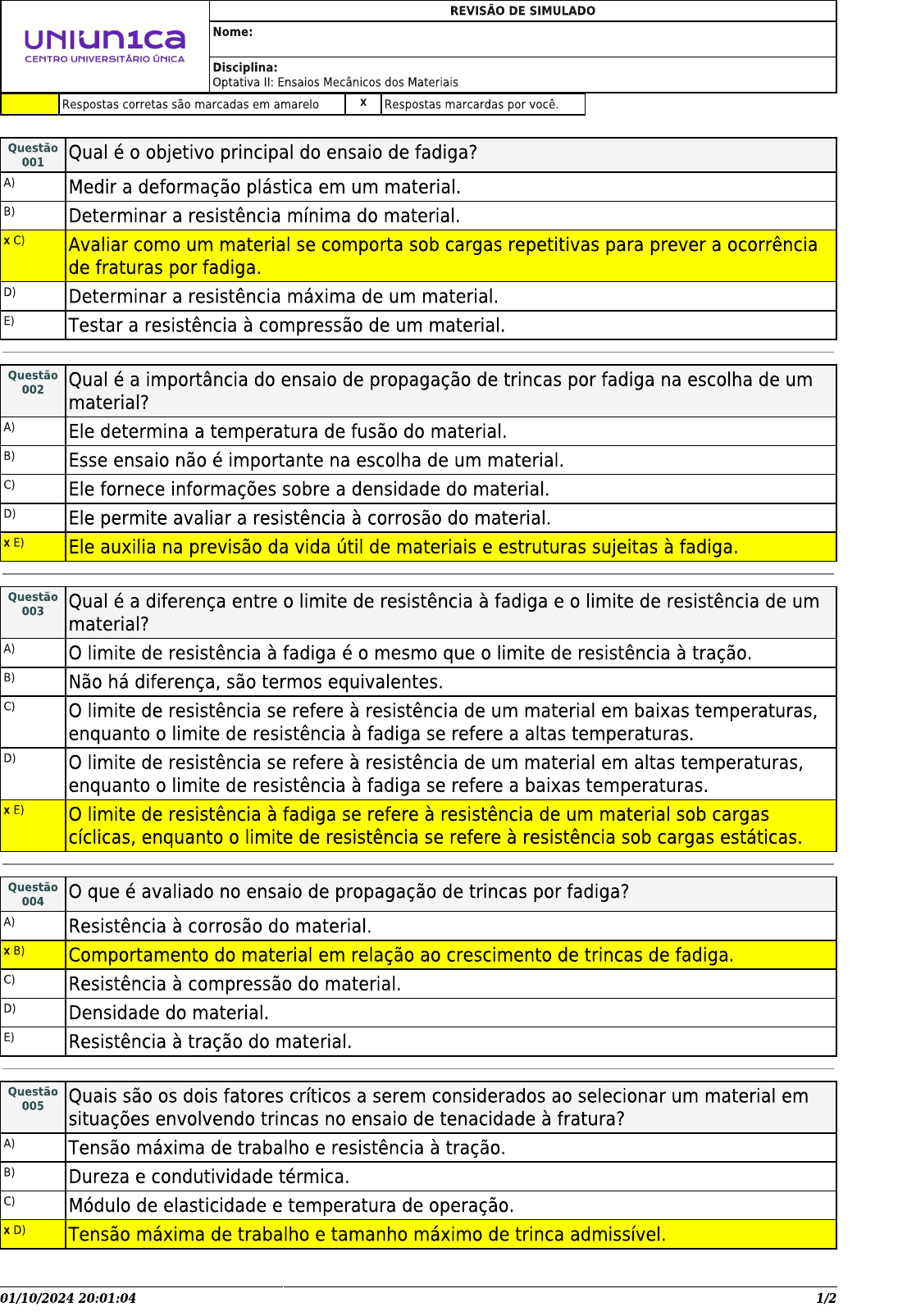 <p>REVISÃO DE SIMULADO Nome: CENTRO UNIVERSITÁRIO ÚNICA Disciplina: Optativa II: Ensaios Mecânicos dos Materiais Respostas corretas são marcadas em amarelo X Respostas marcardas por você. Questão Qual é o objetivo principal do ensaio de fadiga? 001 A) Medir a deformação plástica em um material. B) Determinar a resistência mínima do material. Avalian como um material se comporta sob cargas repetitivas para prever a ocorrência de fraturas por fadiga. D) Determinar a resistência máxima de um material. E) Testar a resistência à compressão de um material. Questão Qual é a importância do ensaio de propagação de trincas por fadiga na escolha de um 002 material? A) Ele determina a temperatura de fusão do material. B) Esse ensaio não é importante na escolha de um material. C) Ele fornece informações sobre a densidade do material. D) Ele permite avaliar a resistência à corrosão do material. x E) Ele auxilia na previsão da vida útil de materiais e estruturas sujeitas à fadiga. Questão Qual é a diferença entre o limite de resistência à fadiga e o limite de resistência de um 003 material? A) limite de resistência à fadiga é o mesmo que o limite de resistência à tração. B) Não há diferença, são termos equivalentes. C) O limite de resistência se refere à resistência de um material em baixas temperaturas, enquanto o limite de resistência à fadiga se refere a altas temperaturas. D) O limite de resistência se refere à resistência de um material em altas temperaturas, enquanto o limite de resistência à fadiga se refere a baixas temperaturas. x E) O limite de resistência à fadiga se refere à resistência de um material sob cargas cíclicas, enquanto o limite de resistência se refere à resistência sob cargas estáticas. Questão O que é avaliado no ensaio de propagação de trincas por fadiga? 004 A) Resistência à corrosão do material. x B) Comportamento do material em relação ao crescimento de trincas de fadiga. C) Resistência à compressão do material. D) Densidade do material. E) Resistência à tração do material. Questão Quais são os dois fatores críticos a serem considerados ao selecionar um material em 005 situações envolvendo trincas no ensaio de tenacidade à fratura? A) Tensão máxima de trabalho e resistência à tração. B) Dureza e condutividade térmica. C) Módulo de elasticidade e temperatura de operação. x D) Tensão máxima de trabalho e tamanho máximo de trinca admissível. 01/10/2024 20:01:04 1/2</p><p>E) Peso e temperatura de fusão. Questão ensaio de tenacidade à fratura é um teste mecânico projetado para avaliar a 006 capacidade de um material resistir à propagação de trincas e fraturas. Esse tipo de ensaio é particularmente relevante para materiais que exibem comportamento frágil, como metais e cerâmicas, onde a fratura pode ocorrer de forma súbita e catastrófica, muitas vezes sem aviso prévio. Sabendo disso, assinale a alternativa que representa qual é o principal objetivo do ensaio de tenacidade à fratura. A) Avaliar a resistência à corrosão do material. B) Medir a resistência à compressão do material. C) Determinar a densidade do material. x D) Avaliar a capacidade do material resistir à propagação de trincas e fraturas. E) Medir a dureza do material. Questão Qual é a principal diferença entre o ensaio de tração e o ensaio de fadiga? 007 A) O ensaio de tração mede a resistência à fadiga, enquanto o ensaio de fadiga mede a resistência à tração. B) ensaio de tração envolve cargas cíclicas, enquanto o ensaio de fadiga envolve cargas estáticas. C) ensaio de tração é destrutivo e o ensaio de fadiga é não destrutível. x D) O ensaio de tração aplica uma carga constante até a ruptura, enquanto o ensaio de fadiga envolve cargas cíclicas repetidas. E) ensaio de tração não é usado para testar materiais metálicos. Questão Qual dos seguintes fatores críticos deve ser considerado ao selecionar um material em 008 situações envolvendo trincas? A) Tensão de compressão máxima. B) Condutividade elétrica do material. C) Dureza do material. x D) Máxima Tensão de Trabalho e Máximo Tamanho de Trinca Admissível. E) A capacidade do material de conduzir calor. 01/10/2024 20:01:04 2/2</p>