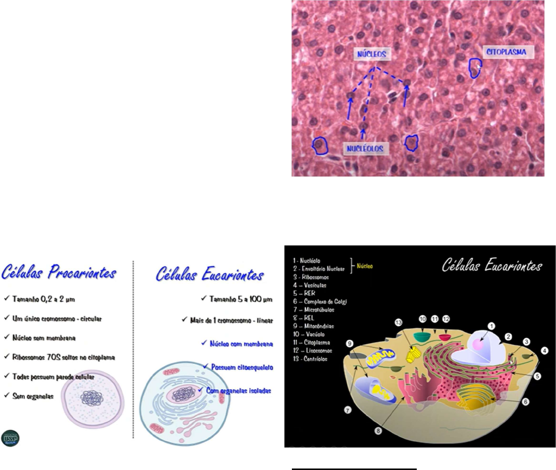 <p>SOI – MÓDULO 2 REBECA TORRES (T4)</p><p>Estudo dos</p><p>Componentes Celulares</p><p>Continuação de Histologia</p><p>1. Introdução</p><p>A célula é a unidade básica estrutural e</p><p>funcional de todos os seres vivos. Todas as</p><p>células se originam de células pré-</p><p>existentes.</p><p>Durante os estudos acerca das células, os</p><p>cientistas constataram a existência de dois</p><p>tipos celulares diferentes:</p><p>As principais estruturas da célula</p><p>eucarionte são: membrana plasmática (ou</p><p>plasmalema), núcleo, citoplasma (também</p><p>chamado de matriz citoplasmática ou citosol)</p><p>e organelas (que estão inseridas no</p><p>citoplasma).</p><p>Em preparados histológicos, só é possível</p><p>identificar o núcleo e o nucléolo. A</p><p>membrana plasmática não pode ser</p><p>observada através das colorações</p><p>tradicionais.</p><p>2. Células Eucariontes - Organelas</p><p>Diversas organelas preenchem o</p><p>citoplasma:</p><p>Membrana Plasmática</p><p>É um tipo de biomembrana, ou seja, é um</p><p>envoltório que estabelece limites estruturais</p><p>e funcionais.</p><p>Existem dois tipos de biomembrana: a</p><p>plasmática e a citomembrana. A membrana</p><p>plasmática corresponde a um limite externo</p><p>da célula, enquanto as citomembranas são</p><p>limites internos presentes em organelas.</p><p>SOI – MÓDULO 2 REBECA TORRES (T4)</p><p>Funções da Membrana Plasmática:</p><p>1. Manutenção da constância do meio</p><p>intracelular:</p><p>-Manutenção do pH 7.2 e da</p><p>composição iônica;</p><p>-Funciona como barreira biológica:</p><p>permeabilidade seletiva separa o</p><p>meio intra e extracelular. Entram</p><p>apenas os nutrientes e saem os</p><p>metabólitos.</p><p>2. Estabilidade:</p><p>Evita que os componentes da célula</p><p>se choquem.</p><p>3. Comunicação Celular</p><p>Algumas estruturas específicas da</p><p>membrana plasmática permitem a</p><p>comunicação com as células vizinhas</p><p>e com células distantes.</p><p>Observação: independente do local</p><p>do corpo em que estão, a composição</p><p>das células é sempre a mesma.</p><p>Composição da Membrana Plasmática:</p><p>1. Lipídios – 35%</p><p>2. Proteínas – 60%</p><p>3. Carboidratos – 5%</p><p>A membrana plasmática é constituída por</p><p>uma estrutura trilaminar, onde estão</p><p>agrupados os seus componentes.</p><p>Não existe uma simetria entre a face</p><p>interna e externa da membrana.</p><p> Proteínas Periféricas: estão</p><p>fracamente ligadas às membranas.</p><p>Geralmente estão associadas ao</p><p>interior hidrofóbico e/ou aos lipídios;</p><p> Proteínas Integrais: inseridas na</p><p>bicamada lipídica. Atravessam da</p><p>porção externa até a interna da</p><p>membrana. Podem ser de passagem</p><p>única (quando atravessam a</p><p>membrana uma única vez, com um</p><p>“tubo” só) ou múltipla (quando</p><p>SOI – MÓDULO 2 REBECA TORRES (T4)</p><p>atravessam a membrana mais de uma</p><p>vez, com vários “tubos”).</p><p>Funções das Proteínas:</p><p> Estrutura;</p><p> Transporte;</p><p> Adesão;</p><p> Enzimas;</p><p> Receptores;</p><p> Sinalização.</p><p>Modelo do Mosaico Fluido:</p><p>Proposto por Singer e Nicholson em 1972.</p><p>De acordo com esse modelo, a membrana</p><p>plasmática se comporta de forma dinâmica:</p><p>as proteínas se movimentam entre os</p><p>lipídios, o que confere uma fluidez à</p><p>membrana.</p><p>Glicocálice:</p><p>Composto por cadeias glicídicas</p><p>(glicoproteínas e glicolipídios) e</p><p>proteoglicanos. Sua função é promover a</p><p>adesão entre as células, o reconhecimento</p><p>celular e participa da sinalização</p><p>(receptores).</p><p>Para realizar a integração de uma célula</p><p>com outra, as membranas plasmáticas</p><p>desenvolveram especializações que</p><p>permitem isso.</p><p>Junções Intercelulares:</p><p>São regiões especializadas da</p><p>membrana. Existem diversos tipos de</p><p>junções, cada um com uma função</p><p>específica:</p><p> Junções de Adesão: promovem a</p><p>vedação, separam um ambiente do outro:</p><p> Junções de Oclusão</p><p>Formam uma faixa/cinturão circular</p><p>contínuo ao redor das células. Ocorre</p><p>uma fusão das membranas por meio</p><p>de filamentos proteicos. As junções</p><p>formam barreiras de permeabilidade</p><p>seletiva e determinam a polaridade</p><p>das células.</p><p> Junções de Coesão:</p><p> Junções de Ancoragem</p><p> Zônulas de Adesão</p><p>Formam uma faixa circular</p><p>contínua ao redor das células.</p><p>Mantém as células unidas umas às</p><p>outras, com espaços, por meio da</p><p>relação com o citoesqueleto</p><p>(actina) e mediado por proteínas.</p><p>Ocorrem nos domínios laterais de</p><p>células adjacentes.</p><p>Função:</p><p>-Resistência ao stress mecânico;</p><p>-Previne ruptura lateral.</p><p>SOI – MÓDULO 2 REBECA TORRES (T4)</p><p> Desmossomos</p><p>São placas que mantém as</p><p>células unidas fortemente.</p><p>Frequentes em células</p><p>submetidas a tração (epiderme,</p><p>esôfago e músculo cardíaco).</p><p>Formados por filamentos de</p><p>queratina do citoesqueleto.</p><p>A união é realizada por meio de</p><p>proteínas, as quais podem ser</p><p>divididas em proteínas de adesão</p><p>célula-célula e proteínas</p><p>acessórias.</p><p> Hemidesmossomos</p><p>Promovem a adesão entre a</p><p>célula e a lâmina basal. Fazem</p><p>isso por meio de proteínas</p><p>integrinas:</p><p>-Placa citoplasmática:</p><p>tonofilamentos;</p><p>-Placa de membrana: filamentos</p><p>de ancoragem.</p><p> Comunicação: promovem a</p><p>comunicação / sinalização:</p><p> Junções Comunicantes: junções</p><p>do tipo “GAP”</p><p>-Locais especializados = Grandes</p><p>canais intercelulares</p><p>-O par de meios-canais é chamado de</p><p>conexons;</p><p>-As conexinas são formadas por seis</p><p>subunidades proteicas simétr