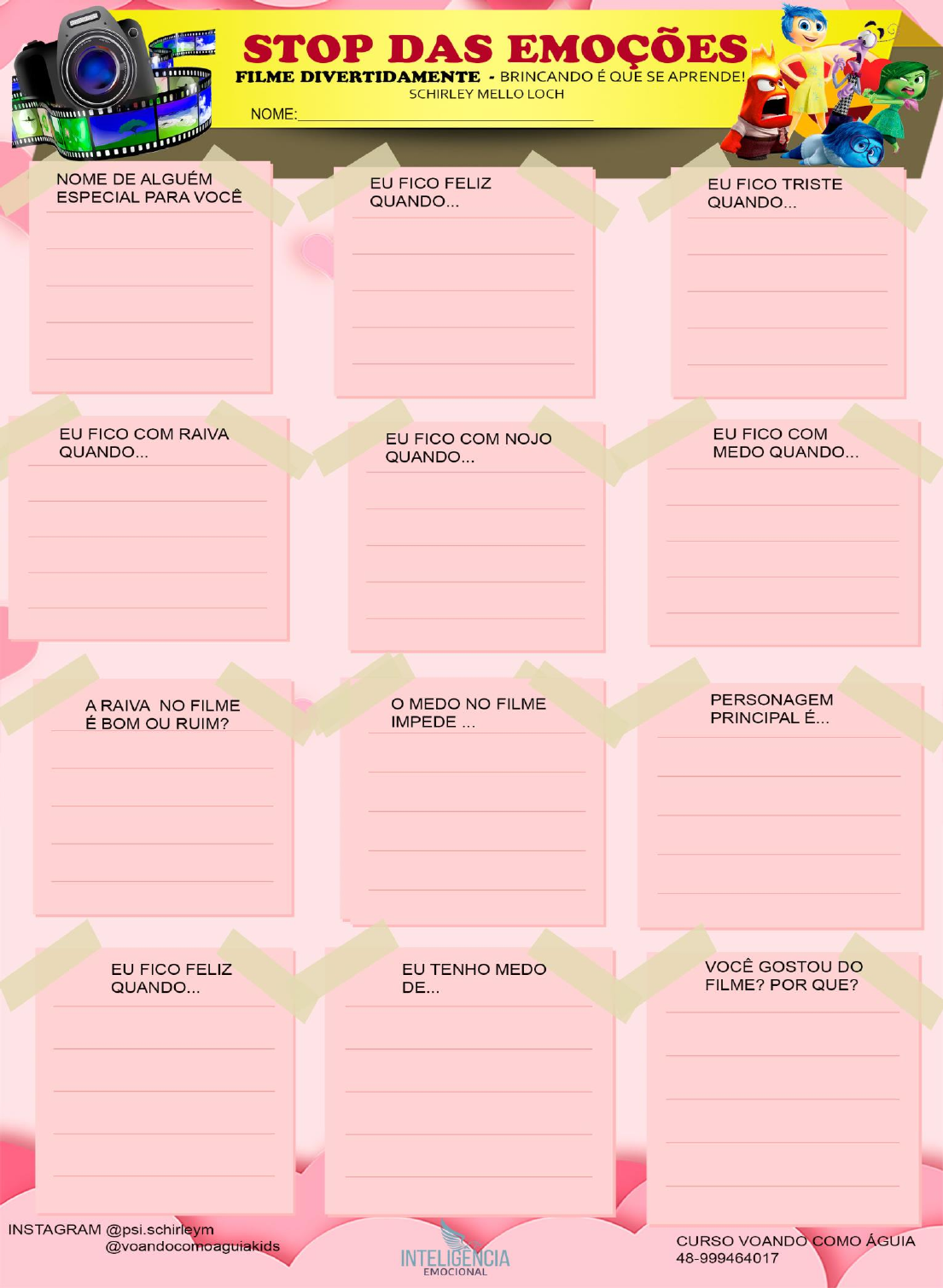 <p>STOP DAS EMOÇÕES FILME DIVERTIDAMENTE - BRINCANDO É QUE SE APRENDE! SCHIRLEY MELLO LOCH NOME: NOME DE ALGUÉM EU FICO FELIZ EU FICO TRISTE ESPECIAL PARA VOCÊ QUANDO. QUANDO. EU FICO COM RAIVA EU FICO COM NOJO EU FICO COM QUANDO... QUANDO... MEDO QUANDO... A RAIVA NO FILME MEDO NO FILME PERSONAGEM É BOM OU RUIM? IMPEDE PRINCIPAL É EU FICO FELIZ EU TENHO MEDO VOCÊ GOSTOU DO QUANDO... DE. FILME? POR QUE? INSTAGRAM@psi.schirleym @voandocomoaguiakids CURSO VOANDO COMO ÁGUIA INTELIGENCIA 48-999464017 EMOCIONAL</p>