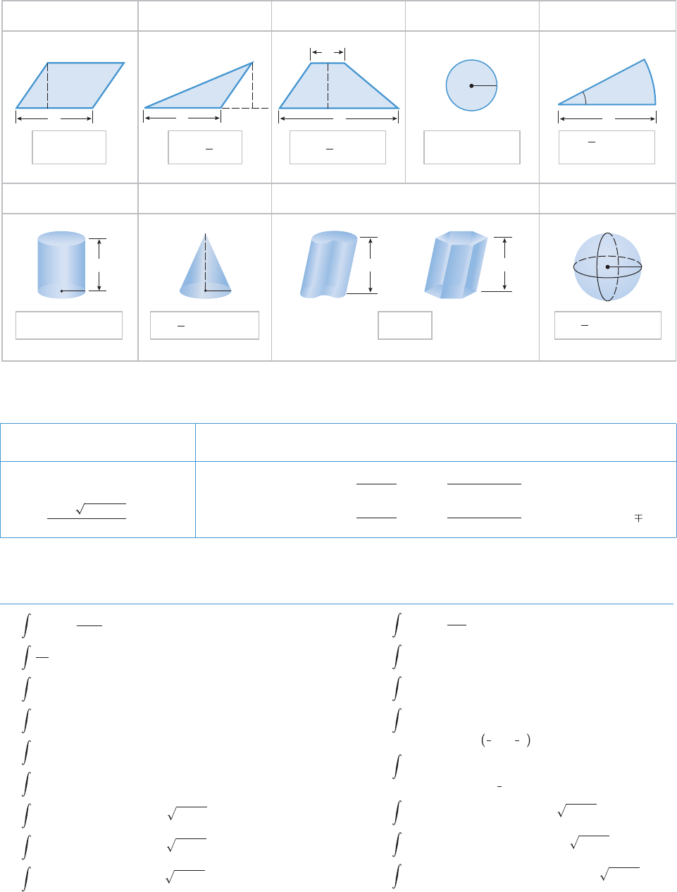 <p>FÓRMULAS DE GEOMETRIA</p><p>A = área, S = área da superfície lateral, V = volume, h = altura, B = área da base, r = raio, l = altura inclinada, C = circunferência, s = comprimento de arco</p><p>V = Bh</p><p>h</p><p>B</p><p>h</p><p>b</p><p>A = bh</p><p>h</p><p>b</p><p>A = bh1</p><p>2</p><p>1</p><p>3</p><p>A = (a + b)h1</p><p>2</p><p>h</p><p>b</p><p>a</p><p>A = πr2, C = 2π r</p><p>r</p><p>(θ em radianos)</p><p>r</p><p>s</p><p>�</p><p>A = r2θ , s = rθ</p><p>1</p><p>2</p><p>h</p><p>r</p><p>V = πr2h, S = 2π rh V = πr3, S = 4π r2</p><p>r</p><p>4</p><p>3</p><p>l</p><p>r</p><p>h</p><p>V = πr2h, S = π rl</p><p>h</p><p>B</p><p>Paralelogramo</p><p>Cilindro circular reto Cone circular reto Cilindro ou prisma com bases paralelas Esfera</p><p>Triângulo Trapézio Círculo Setor</p><p>FÓRMULAS DE ÁLGEBRA</p><p>A FÓRMULA</p><p>QUADRÁTICA A FÓRMULA BINOMIAL</p><p>As soluções da equação quadrática</p><p>ax2 + bx + c = 0 são</p><p>x =</p><p>−b ± b2 − 4ac</p><p>2a</p><p>(x + y)n = xn + nxn−1y +</p><p>n(n − 1)</p><p>1 · 2</p><p>xn−2y2 +</p><p>n(n − 1)(n − 2)</p><p>1 · 2 · 3</p><p>xn−3y3 + · · · + nxyn−1 + yn</p><p>(x − y)n = xn − nxn−1y +</p><p>n(n − 1)</p><p>1 · 2</p><p>xn−2y2 −</p><p>n(n − 1)(n − 2)</p><p>1 · 2 · 3</p><p>xn−3y3 + · · · ± nxyn−1 yn</p><p>TABELA DE INTEGRAIS</p><p>FUNÇÕES BÁSICAS</p><p>1. un du =</p><p>un+1</p><p>n + 1</p><p>+ C</p><p>2.</p><p>du</p><p>u</p><p>= ln |u| + C</p><p>3. eu du = eu + C</p><p>4. sen u du = − cos u + C</p><p>5. cos u du = sen u + C</p><p>6. tg u du = ln |sec u| + C</p><p>7. arc sen u du = u arc sen u + 1 − u2 + C</p><p>8. arc cos u du = u arc cos u − 1 − u2 + C</p><p>9. arc tg u du = u arc tg u − ln 1 + u2 + C</p><p>10. au du =</p><p>au</p><p>ln a</p><p>+ C</p><p>11. ln u du = u ln u − u + C</p><p>12. cotg u du = ln |sen u| + C</p><p>13.</p><p>sec u du = ln |sec u + tg u| + C</p><p>= ln |tg 1</p><p>4 π + 1</p><p>2 u | + C</p><p>14.</p><p>cossec u du = ln |cossec u − cotg u| + C</p><p>= ln |tg 1</p><p>2 u| + C</p><p>15. arc cotg u du = u arc cotg u + ln 1 + u2 + C</p><p>16. arc sec u du = u arc sec u − ln |u + u2 − 1| + C</p><p>17. arc cossec u du = u arc cossec u + ln |u + u2 − 1| + C</p><p>RECÍPROCOS DE FUNÇÕES BÁSICAS</p><p>18.</p><p>1</p><p>1 ± sen u</p><p>du = tg u ∓ sec u + C</p><p>19.</p><p>1</p><p>1 ± cos u</p><p>du = − cotg u ± cossec u + C</p><p>20.</p><p>1</p><p>1 ± tg u</p><p>du = 1</p><p>2 (u ± ln |cos u ± sen u|) + C</p><p>21.</p><p>1</p><p>sen u cos u</p><p>du = ln |tg u| + C</p><p>22.</p><p>1</p><p>1 ± cotg u</p><p>du = 1</p><p>2 (u ∓ ln |sen u ± cos u|) + C</p><p>23.</p><p>1</p><p>1 ± sec u</p><p>du = u + cotg u ∓ cossec u + C</p><p>24.</p><p>1</p><p>1 ± cossec u</p><p>du = u − tg u ± sec u + C</p><p>25.</p><p>1</p><p>1 ± eu</p><p>du = u − ln(1 ± eu) + C</p><p>POTÊNCIAS DE FUNÇÕES TRIGONOMÉTRICAS</p><p>26. sen2 u du = 1</p><p>2 u − 1</p><p>4 sen 2u + C</p><p>27. cos2 u du = 1</p><p>2 u + 1</p><p>4 sen 2u + C</p><p>28. tg2 u du = tg u − u + C</p><p>29. senn u du = −</p><p>1</p><p>n</p><p>senn−1 u cos u +</p><p>n − 1</p><p>n</p><p>senn−2 u du</p><p>30. cosn u du =</p><p>1</p><p>n</p><p>cosn−1 u sen u +</p><p>n − 1</p><p>n</p><p>cosn−2 u du</p><p>31. tgn u du =</p><p>1</p><p>n − 1</p><p>tgn−1 u − tgn−2 u du</p><p>32. cotg2 u du = − cotg u − u + C</p><p>33. sec2 u du = tg u + C</p><p>34. cossec2 u du = − cotg u + C</p><p>35. cotgn u du = −</p><p>1</p><p>n − 1</p><p>cotg n−1 u − cotgn−2 u du</p><p>36. secn u du =</p><p>1</p><p>n − 1</p><p>secn−2 u tg u +</p><p>n − 2</p><p>n − 1</p><p>secn−2 u du</p><p>37. cossecn u du = −</p><p>1</p><p>n − 1</p><p>cossecn−2 u cotg u +</p><p>n − 2</p><p>n − 1</p><p>cossecn−2 u du</p><p>PRODUTOS DE FUNÇÕES TRIGONOMÉTRICAS</p><p>38. sen mu sen nu du = −</p><p>sen(m + n)u</p><p>2(m + n)</p><p>+</p><p>sen(m − n)u</p><p>2(m − n)</p><p>+ C</p><p>39. cos mu cos nu du =</p><p>sen(m + n)u</p><p>2(m + n)</p><p>+</p><p>sen(m − n)u</p><p>2(m − n)</p><p>+ C</p><p>40. sen mu cos nu du = −</p><p>cos(m + n)u</p><p>2(m + n)</p><p>−</p><p>cos(m − n)u</p><p>2(m − n)</p><p>+ C</p><p>41. senm u cosn u du = −</p><p>senm−1 u cosn+1 u</p><p>m + n</p><p>+</p><p>m − 1</p><p>m + n</p><p>senm−2 u cosn u du</p><p>=</p><p>senm+1 u cosn−1 u</p><p>m + n</p><p>+</p><p>n − 1</p><p>m + n</p><p>senm u cosn−2 u du</p><p>PRODUTOS DE FUNÇÕES TRIGONOMÉTRICAS E EXPONENCIAIS</p><p>42. eau sen bu du =</p><p>eau</p><p>a2 + b2</p><p>(a sen bu − b cos bu) + C 43. eau cos bu du =</p><p>eau</p><p>a2 + b2</p><p>(a cos bu + b sen bu) + C</p><p>POTÊNCIAS DE u MULTIPLICANDO OU DIVIDINDO FUNÇÕES BÁSICAS</p><p>44. u sen u du = sen u − u cos u + C</p><p>45. u cos u du = cos u + u sen u + C</p><p>46. u2 sen u du = 2u sen u + (2 − u2) cos u + C</p><p>47. u2 cos u du = 2u cos u + (u2 − 2) sen u + C</p><p>48. un sen u du = −un cos u + n un−1 cos u du</p><p>49. un cos u du = un sen u − n un−1 sen u du</p><p>50. un ln u du =</p><p>un+1</p><p>(n + 1)2</p><p>[(n + 1) ln u − 1] + C</p><p>51. ueu du = eu(u − 1) + C</p><p>52. uneu du = uneu − n un−1eu du</p><p>53. unau du =</p><p>unau</p><p>ln a</p><p>−</p><p>n</p><p>ln a</p><p>un−1au du + C</p><p>54.</p><p>eu du</p><p>un</p><p>= −</p><p>eu</p><p>(n − 1)un−1</p><p>+</p><p>1</p><p>n − 1</p><p>eu du</p><p>un−1</p><p>55.</p><p>au du</p><p>un</p><p>= −</p><p>au</p><p>(n − 1)un−1</p><p>+</p><p>ln a</p><p>n − 1</p><p>au du</p><p>un−1</p><p>56.</p><p>du</p><p>u ln u</p><p>= ln |ln u| + C</p><p>POLINÔMIOS MULTIPLICANDO FUNÇÕES BÁSICAS</p><p>57. p(u)eau du =</p><p>1</p><p>a</p><p>p(u)eau −</p><p>1</p><p>a2</p><p>p (u)eau +</p><p>1</p><p>a3</p><p>p (u)eau − · · · [sinais alternados: + − + − ···]</p><p>58. p(u) sen au du = −</p><p>1</p><p>a</p><p>p(u) cos au +</p><p>1</p><p>a2</p><p>p (u) sen au +</p><p>1</p><p>a3</p><p>p (u) cos au − 