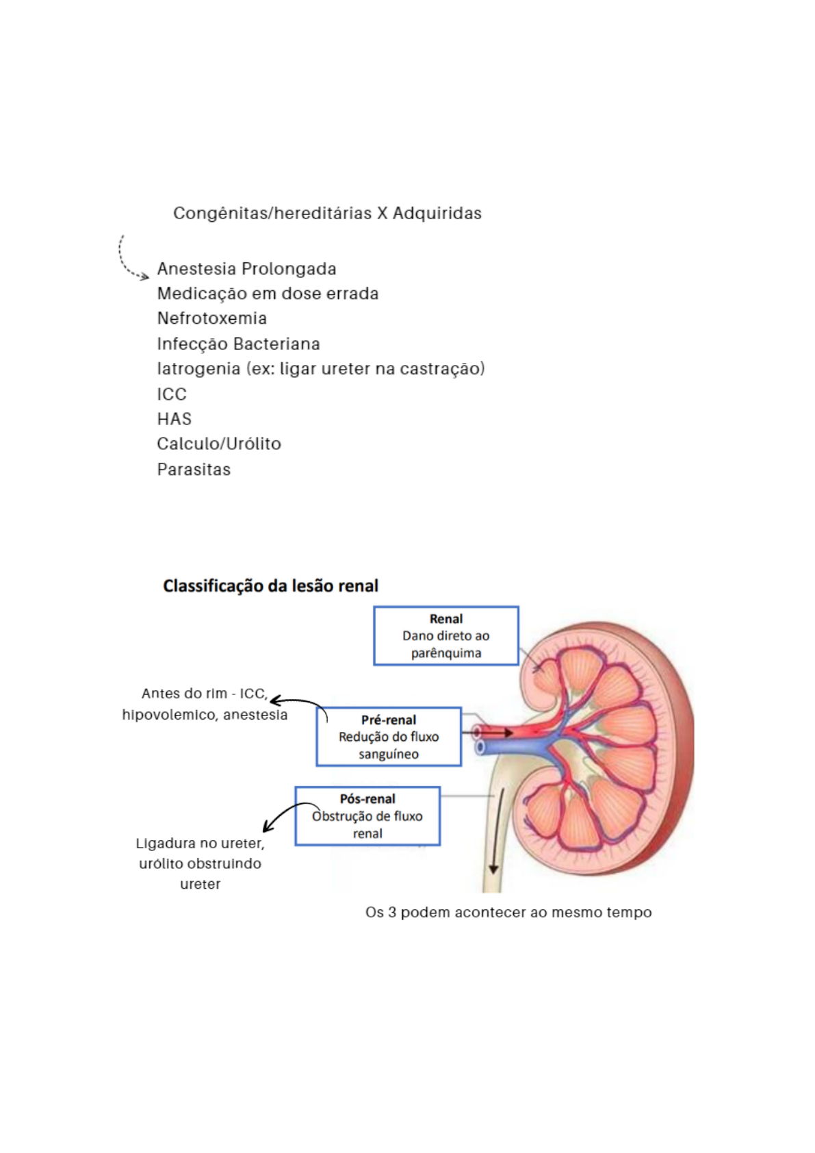 <p>Doença Renal Crônica (DRC) e Injúria Renal Aguda (IRA)</p><p>O que causa lesão renal em pequenos animais?</p><p>RENAL:</p><p>Nefrotoxinas: (potencial nefrotoxico)</p><p>- Antibióticos: aminoglicosídeos*, sulfonamidas, carbapenêmicos, quinolonas</p><p>- Quimioterápicos: doxorrubicina, cisplatina, carboplatina</p><p>- Plantas tóxicas/frutas: lírios, uva, carambola →lírio muito tóxico em gatos IRA bem graves,</p><p>em cães o mais comum é por uva.</p><p>- Antifúngicos: anfotericina B</p><p>- Acidentes ofídicos</p><p>Infecciosas: - Pielonefrite - Piometrite - Leptospirose - Leishmaniose - PIF - Doença</p><p>periodontal</p><p>Neoplasia:</p><p>- Linfoma - + em gatos</p><p>- Carcinoma - + em cães</p><p>Parasitária: Dioctophyma renale</p><p>*Quinolona é usado em pielonefrites, pois consegue penetrar o parênquima renal (potencial</p><p>toxico, porem por conseguir penetrar se usa)*</p><p>Pré-renal:</p><p>Redução do fluxo sanguíneo</p><p>Hipovolemia: - Desidratação - Hemorragia - Diuréticos</p><p>Hipotensão: - Anestesia prolongada - ICC - Sepse</p><p>Alterações hemodinâmicas:</p><p>- Antiinflamatórios não esteroidais</p><p>↳ O Aine tira a resposta da aferente fazendo com que a taxa de filtração diminua - aine</p><p>impede fluxo que já estava ruim piora, por ser mediado por prostaglandina</p><p>- iECA → impede vasoconstrição da eferente (por isso não se usa em obstruido)</p><p>Antiinflamatórios Não Esteroidais (AINEs):</p><p>● Como funcionam: AINEs inibem a enzima ciclooxigenase (COX), que é</p><p>responsável pela produção de prostaglandinas. As prostaglandinas desempenham</p><p>um papel importante na vasodilatação da arteríola aferente, que leva sangue ao</p><p>glomérulo renal.</p><p>● Efeito nos rins: Em situações de fluxo sanguíneo renal reduzido (por exemplo,</p><p>hipovolemia, desidratação), os rins dependem das prostaglandinas para manter a</p><p>dilatação da arteríola aferente e, assim, preservar a taxa de filtração glomerular</p><p>(TFG).</p><p>● Consequência: O uso de AINEs inibe a produção de prostaglandinas, resultando</p><p>em vasoconstrição da arteríola aferente. Isso diminui ainda mais o fluxo sanguíneo</p><p>para o glomérulo, reduzindo a TFG e piorando a insuficiência renal pré-renal.</p><p>Inibidores da Enzima Conversora de Angiotensina (iECA):</p><p>● Como funcionam: Os iECAs inibem a enzima conversora de angiotensina, que é</p><p>responsável por transformar a angiotensina I em angiotensina II. A angiotensina II</p><p>tem um efeito vasoconstritor, principalmente na arteríola eferente (a que sai do</p><p>glomérulo).</p><p>● Efeito nos rins: Em situações de fluxo sanguíneo renal baixo, o organismo tenta</p><p>manter a TFG pela vasoconstrição da arteríola eferente (mediada pela angiotensina</p><p>II), o que aumenta a pressão intraglomerular.</p><p>● Consequência: Quando se usa iECAs, ocorre inibição dessa vasoconstrição da</p><p>arteríola eferente. Isso resulta em uma diminuição da pressão intraglomerular, o que</p><p>reduz a TFG. Por isso, o uso de iECAs pode ser problemático em pacientes com</p><p>fluxo sanguíneo renal comprometido, como na insuficiência renal pré-renal ou em</p><p>situações de obstrução urinária, onde a pressão intraglomerular já está</p><p>comprometida.</p><p>Pós-renal: Obstrução de fluxo renal</p><p>Obstrução ureteral:</p><p>- Urolitíase</p><p>- Coágulos sanguíneos solidificados - em gatos especialmente na pelve renal, causando</p><p>obstrução, acaba fazendo sinais de IRA, mas não tem sinal especifico, não ve no US</p><p>- Estenose</p><p>- Neoplasia</p><p>Obstrução uretral</p><p>Nefropatias familiares</p><p>• Diagnóstico final: biopsia</p><p>• Displasia renal - + comum em cães mais jovens - congenito</p><p>↳ formação incorreta do rim, assimetria/alteração de formato, no desenvolvimento, pode</p><p>ser uni ou bilateral, normalmente bilateral.</p><p>Golden Retriever, Shihtzu, Lhasa, Labrador</p><p>• Doença renal policística (PKD) - gatos persas + idosos - congenito/genetico</p><p>diagnostico seria por biopsia porem não é necessario porque se ve no us, e não há</p><p>tratamento para isso e sim para DRC.</p><p>Definição: O débito urinário é a quantidade de urina produzida por um paciente em um</p><p>determinado período de tempo, geralmente expressa em mililitros por quilograma de peso</p><p>corporal por hora (ml/kg/h).</p><p>Valores Normais:</p><p>● O valor de referência para animais é de aproximadamente 1-2 ml/kg/hora. Isso</p><p>significa que, para um animal de 10 kg, espera-se que produza entre 10 a 20 ml de</p><p>urina por hora.</p><p>● Valores abaixo disso podem indicar oligúria (produção reduzida de urina) ou anúria</p><p>(ausência de produção de urina), sugerindo comprometimento da função renal.</p><p>Procedimento para Monitorar o DU:</p><p>● Vazão Inicial da Bexiga: Para garantir uma medição precisa, a bexiga deve estar</p><p>vazia no início do monitoramento. Isso pode ser feito por sondagem ou micção</p><p>espontânea.</p><p>● Sondagem:</p><p>○ Introduz-se uma sonda urinária para coletar a urina diretamente da bexiga.</p><p>○ Anota-se o volume de urina coletado e o tempo decorrido desde a última</p><p>sondagem ou esvaziamento.</p><p>○</p><p>Pesagem de Tapete Higiênico:</p><p>○ Uma alternativa é pesar o tapete higiênico antes e após a micção.</p><p>○ A diferença de peso em gramas equivale ao volume de urina em mililitros,</p><p>pois 1 grama de água = 1 ml de água.</p><p>○ Isso é útil para pacientes que não estão sondados, mas requer supervisão</p><p>constante.</p><p>Avaliação da Função Renal:</p><p>● A quantidade de urina produzida reflete diretamente a filtração renal. Na IRA, a</p><p>produção pode ser comprometida, e o DU é um dos primeiros sinais clínicos a serem</p><p>monitorados.</p><p>Estado de Hidratação:</p><p>● Hidratação 