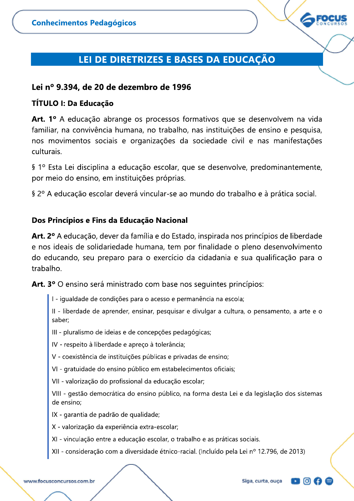 <p>FOCUS Conhecimentos Pedagógicos CONCURSOS LEI DE DIRETRIZES E BASES DA EDUCAÇÃO Lei n° 9.394, de 20 de dezembro de 1996 TÍTULO I: Da Educação Art. 1° A educação abrange os processos formativos que se desenvolvem na vida familiar, na convivência humana, no trabalho, nas instituições de ensino e pesquisa, nos movimentos sociais e organizações da sociedade civil e nas manifestações culturais. § 1° Esta Lei disciplina a educação escolar, que se desenvolve, predominantemente, por meio do ensino, em instituições próprias. § 2° A educação escolar deverá vincular-se ao mundo do trabalho e à prática social. Dos Princípios e Fins da Educação Nacional Art. 2° A educação, dever da família e do Estado, inspirada nos princípios de liberdade e nos ideais de solidariedade humana, tem por finalidade o pleno desenvolvimento do educando, seu preparo para o exercício da cidadania e sua qualificação para trabalho. Art. 3° O ensino será ministrado com base nos seguintes princípios: - igualdade de condições para o acesso e permanência na escola; liberdade de aprender, ensinar, pesquisar e divulgar a cultura, o pensamento, a arte e o saber; III pluralismo de ideias e de concepções pedagógicas; IV respeito à liberdade e apreço à tolerância; V coexistência de instituições públicas e privadas de ensino; VI gratuidade do ensino público em estabelecimentos oficiais; VII valorização do profissional da educação escolar; VIII gestão democrática do ensino público, na forma desta Lei e da legislação dos sistemas de ensino; IX garantia de padrão de qualidade; X valorização da experiência extra-escolar; XI vinculação entre a educação escolar, o trabalho e as práticas sociais. XII consideração com a diversidade étnico-racial. (Incluído pela Lei n° 12.796, de 2013) Siga, curta, ouça</p><p>FOCUS Conhecimentos Pedagógicos CONCURSOS XIII garantia do direito à educação e à aprendizagem ao longo da vida. (Incluído pela Lei 13.632, de 2018) XIV respeito à diversidade humana, linguística, cultural e identitária das pessoas surdo-cegas e com deficiência auditiva. (Incluído pela Lei n° 14.191, de 2021) Do Direito à Educação e do Dever de Educar Art. O dever do Estado com a educação escolar pública será efetivado mediante a garantia de: - educação básica obrigatória e gratuita dos 4 (quatro) aos 17 (dezessete) anos de idade, organizada da seguinte forma: a) pré-escola; b) ensino fundamental; c) ensino médio; educação infantil gratuita às crianças de até 5 (cinco) anos de idade III atendimento educacional especializado gratuito aos educandos com deficiência, transtornos globais do desenvolvimento e altas habilidades ou superdotação, transversal a todos os níveis, etapas e modalidades, preferencialmente na rede regular de ensino IV acesso público e gratuito aos ensinos fundamental e médio para todos os que não os concluíram na idade própria; V acesso aos níveis mais elevados do ensino, da pesquisa e da criação artística, segundo a capacidade de cada um; VI oferta de ensino noturno regular, adequado às condições do educando; VII oferta de educação escolar regular para jovens e adultos, com características e modalidades adequadas às suas necessidades e disponibilidades, garantindo-se aos que forem trabalhadores as condições de acesso e permanência na escola; VIII atendimento ao educando, em todas as etapas da educação básica, por meio de programas suplementares de material didático-escolar, transporte, alimentação e assistência à saúde; IX padrões mínimos de qualidade do ensino, definidos como a variedade e a quantidade mínimas, por aluno, de insumos indispensáveis ao desenvolvimento do processo de ensino- aprendizagem adequados à idade e às necessidades específicas de cada estudante, inclusive mediante a provisão de mobiliário, equipamentos e materiais pedagógicos apropriados; (Redação dada pela Lei n° 14.333, de 2022). X - vaga na escola pública de educação infantil ou de ensino fundamental mais próxima de sua residência a toda criança a partir do dia em que completar 4 (quatro) anos de idade XI alfabetização plena e capacitação gradual para a leitura ao longo da educação básica como requisitos indispensáveis para a efetivação dos direitos e objetivos de aprendizagem e para o desenvolvimento dos indivíduos. (Incluído pela Lei n° 14.407, de 2022) Siga, curta, ouça</p><p>FOCUS Conhecimentos Pedagógicos CONCURSOS XII educação digital, com a garantia de conectividade de todas as instituições públicas educação básica e superior à internet em alta velocidade, adequada para o uso com o desenvolvimento de competências voltadas ao letramento digital de jovens e adultos, criação de conteúdos digitais, comunicação e colaboração, segurança e resolução de problemas. (Incluído pela Lei 14.533, de 2023) Parágrafo único. Para efeitos do disposto no inciso XII do caput deste artigo, as relações entre o ensino e a aprendizagem digital deverão prever técnicas, ferramentas e recursos digitais que fortaleçam os papéis de docência e aprendizagem do professor e do aluno e que criem espaços coletivos de mútuo desenvolvimento. (Incluído pela Lei 14.533, de 2023) Art. É assegurado atendimento educacional, durante o período de internação, ao aluno da educação básica internado para tratamento de saúde em regime hospitalar ou domiciliar por tempo prolongado, conforme dispuser o Poder Público em regulamento, na esfera de sua competência federativa. Art. 5 O acesso à educação básica obrigatória é direito público subjetivo, podendo qualquer cidadão, grupo de cidadãos, associação comunitária, organização sindical, entidade de classe ou outra legalmente constituída e, ainda, o Ministério Público, acionar o poder público para exigi-lo. § Comprovada a negligência da autoridade competente para garantir o oferecimento do ensino obri