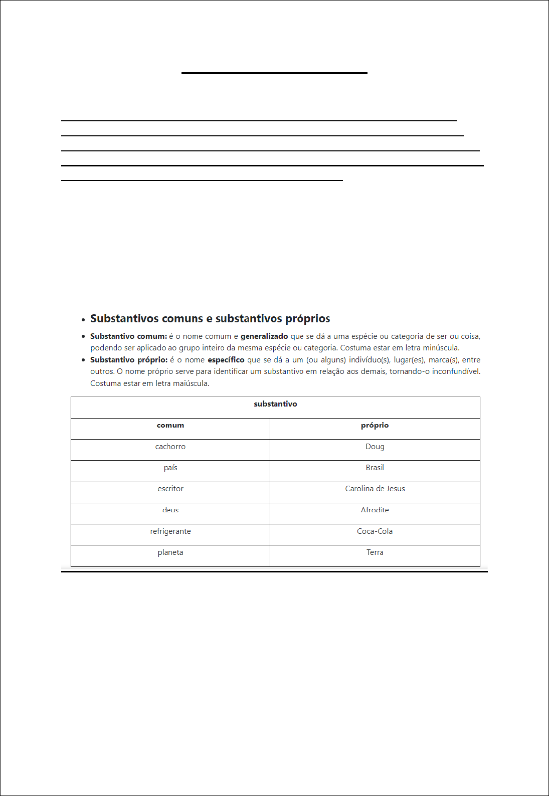 <p>SUBSTANTIVOS</p><p>O substantivo é a classe de palavras que dá nome a seres, coisas, sentimentos,</p><p>processos, estados, fenômenos, substâncias, entre outros. Por isso, é uma classe</p><p>com muitas palavras e é subdividida de acordo com as características daquilo que</p><p>nomeia. Os substantivos são variáveis em gênero (masculino ou feminino), número</p><p>(singular ou plural) e grau (aumentativo e diminutivo).</p><p>Classificação dos substantivos</p><p>Os substantivos são classificados em: comum ou próprio; concreto ou abstrato;</p><p>primitivo ou derivado; simples ou composto. Podem, ainda, ser substantivos</p><p>coletivos. Vamos entender essas classificações.</p><p>• O meu cachorro é engraçado.</p><p>• O Doug é engraçado.</p><p>Nas duas sentenças, “cachorro” é um substantivo comum, pois é o nome que se</p><p>refere a todo e qualquer cachorro. “Doug” é um substantivo próprio, pois refere-se</p><p>a um cachorro especificamente.</p><p>• Substantivos concretos e substantivos abstratos</p><p>Aula dia 22/07</p><p>29/08</p><p>• Substantivo concreto: sua existência é própria e independente, podendo</p><p>ser fisicamente (como no caso de seres vivos, objetos inanimados, fenômenos</p><p>concretos e palpáveis na realidade) ou mentalmente. Assim, mesmo seres</p><p>imaginários podem ser concretos, a partir do momento em que ganham</p><p>forma no pensamento e são imaginados como dotados de existência própria.</p><p>• Substantivo abstrato: é aquele que depende de um ser concreto para</p><p>existir, isto é, para ser produzido. A existência do substantivo abstrato está</p><p>atrelada a outro substantivo concreto e totalmente dependente dele, como</p><p>no caso de sentimentos, anseios ou fenômenos não palpáveis.</p><p>Nas sentenças, “anjo” é um substantivo concreto por representar um ser que,</p><p>independentemente de ser real ou imaginado, apresenta-se como dotado de</p><p>existência própria. Por outro lado, “fé” é um substantivo abstrato, pois não é um ser</p><p>independente, mas depende de outro ser concreto (“ela”, ou seja, uma pessoa) para</p><p>existir.</p><p>• Substantivos primitivos e substantivos</p><p>derivados</p><p>• Substantivo primitivo: é aquele cujo nome não se origina de outro nome.</p><p>Por isso, é um nome que pode originar outros nomes.</p><p>• Substantivo derivado: é aquele cujo nome origina-se de outro. Essa</p><p>origem dá-se comumente por meio do radical de um substantivo primitivo.</p><p>• Substantivos simples e substantivos compostos</p><p>• Substantivo simples: é aquele que apresenta apenas um radical em sua</p><p>forma.</p><p>• Substantivo composto: é aquele que apresenta mais de um radical em</p><p>sua forma. Pode ser formado pela junção de duas ou mais palavras, que se</p><p>transformam em uma só por justaposição (nesse caso, ligadas por hífen) ou</p><p>por aglutinação.</p><p>• Substantivos coletivos</p><p>São nomes usados para representar um grande conjunto de seres ou de</p><p>objetos de uma mesma espécie ou classificação. O coletivo fica no singular por já</p><p>representar a ideia de um grupo, ou seja, de múltiplos seres.</p><p>ATIVIDADES</p><p>SUBSTANTIVOS: CONCRETOE ABSTRATO.</p><p>1) Agora, iremos conhecer mais dois tipos de substantivos:</p><p>Substantivo Concreto: é aquele que designa o ser que existe,</p><p>independentemente de outros seres.</p><p>Obs.: os substantivos concretos designam seres do mundo real e do mundo</p><p>driel</p><p>Texto digitado</p><p>imaginário. Seres do mundo real: homem, mulher, cadeira, cobra, Brasília, etc.</p><p>Seres do mundo imaginário: saci, mãe-d'água, fantasma, etc.</p><p>Substantivo Abstrato é aquele que designa seres que dependem de outros</p><p>para se manifestar ou existir. Pense bem: a beleza não existe por si só, não</p><p>pode ser observada. Só podemos observar a beleza numa pessoa ou coisa</p><p>que seja bela. A beleza depende de outro ser para se manifestar. Portanto, a</p><p>palavra beleza é um substantivo abstrato.</p><p>Os substantivos abstratos designam estados, qualidades, ações e sentimentos</p><p>dos seres, dos quais podem ser abstraídos, e sem os quais não podem existir.</p><p>Por exemplo: vida (estado), rapidez (qualidade), viagem (ação), saudade</p><p>(sentimento). Diante desta explicação, diga qual substantivo abaixo não é</p><p>abstrato:</p><p>( ) medo</p><p>( ) raiva</p><p>( ) alegria</p><p>( ) muro</p><p>02) A palavra LIVRO é um substantivo:</p><p>( ) próprio e abstrato</p><p>( ) comum e abstrato</p><p>( ) próprio e concreto</p><p>( ) comum e concreto</p><p>03) Qual substantivo abaixo está classificado corretamente:</p><p>( ) tristeza - abstrato</p><p>( ) coragem - concreto</p><p>( ) homem - abstrato</p><p>( ) pedra - abstrato</p><p>04) Indique a alternativa em que todos os substantivos são abstratos:</p><p>( ) espaço – olhos – luz – lábios –</p><p>ausência</p><p>( ) saudade - piso - saci - tristeza</p><p>( ) esperança - raiva - fome -</p><p>honestidade</p><p>( ) sede - coragem - ventilador -</p><p>rapidez</p><p>05) Em qual frase abaixo há substantivo abstrato?</p><p>( ) A criança brincava no parque.</p><p>( ) A ansiedade não deixava</p><p>minha mãe dormir.</p><p>( ) Meu quarto está muito</p><p>organizado.</p><p>( ) Estes cadernos estão muito</p><p>pesados.</p><p>Agora, veja mais dois tipos de substantivos:</p><p>1.SUBSTANTIVO SIMPLES - aquele que é formado por um radical apenas, ou</p><p>seja, uma palavra. Ex: pé, roupas, sol, flor, entre outros</p><p>SUBSTANTIVO COMPOSTO - aquele que é formado por mais de um radical,</p><p>ou seja, duas ou mais palavras. Ex: pé -de -moleque, guarda-roupas, girassol,</p><p>beija- flor, entre outros. Mostre que aprendeu em diga em qual alternativa há</p><p>somente substantivos simples.</p><p>( ) colher, bem-te-vi, mesa, pernas</p><p>( ) perna-de-pau, paulada, pessoas, amor</p><p>( ) maçã do amor, maç