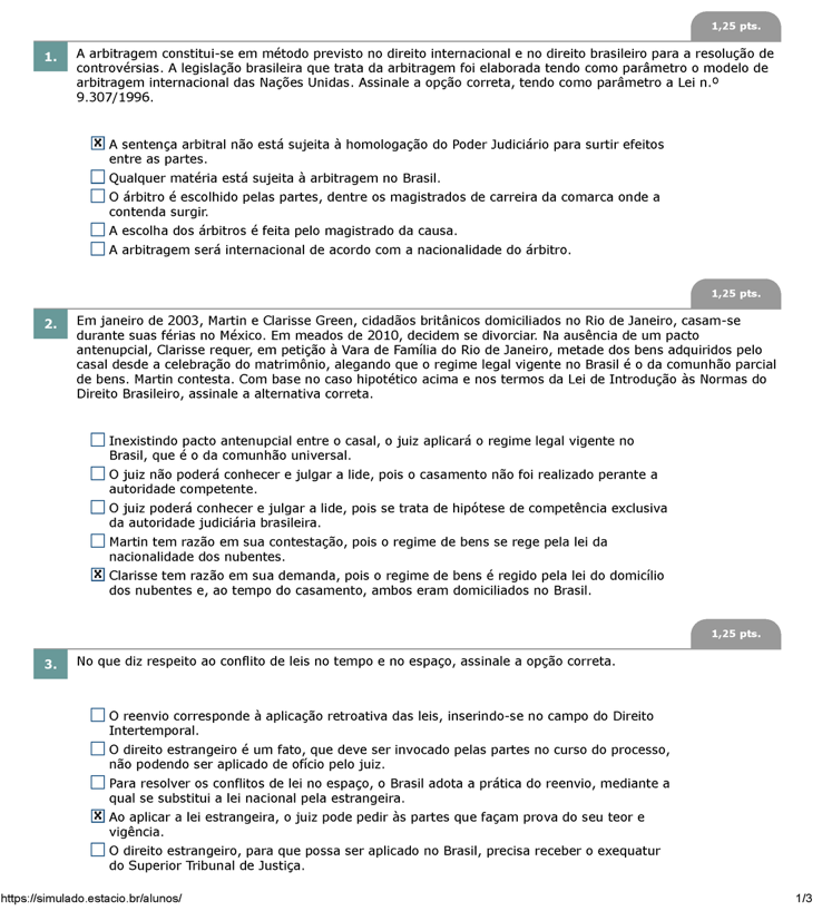 <p>1,25 pts. 1. A arbitragem constitui-se em método previsto no direito internacional e no direito brasileiro para a resolução de A legislação brasileira que trata da arbitragem foi elaborada tendo como parâmetro modelo de arbitragem internacional das Nações Assinale a opção correta, tendo como parâmetro a Lei 9.307/1996. A sentença arbitral não está sujeita à homologação do Poder para surtir efeitos entre as partes. Qualquer matéria está sujeita à arbitragem no Brasil. arbitro é escolhido pelas partes, dentre os magistrados de carreira da comarca onde a contenda surgir. A escolha dos árbitros é feita pelo magistrado da causa. A arbitragem será internacional de acordo com a nacionalidade do 1,25 pts. 2. Em janeiro de 2003, Martin e Clarisse Green, cidadãos britânicos domiciliados no Rio de Janeiro, casam-se durante suas férias no Em meados de 2010, decidem se divorciar. Na ausência de um pacto antenupcial, Clarisse requer, em petição à Vara de Família do Rio de Janeiro, metade dos bens adquiridos pelo casal desde a celebração do matrimônio, alegando que regime legal vigente no Brasil é da comunhão parcial de Martin contesta. Com base no caso hipotético acima e nos termos da Lei de Introdução às Normas do Direito Brasileiro, assinale a alternativa correta. Inexistindo pacto antenupcial entre casal, juiz aplicará regime legal vigente no Brasil, que é da comunhão O juiz não conhecer e julgar a lide, pois casamento não foi realizado perante a autoridade competente. juiz poderá conhecer e julgar a lide, pois se trata de hipótese de competência exclusiva da autoridade judiciária brasileira. Martin tem razão em sua contestação, pois regime de bens se rege pela lei da nacionalidade dos nubentes. Clarisse tem razão em sua demanda, pois regime de bens é regido pela lei do domicílio dos nubentes e, ao tempo do casamento, ambos eram domiciliados no 1,25 pts. 3. No que diz respeito ao conflito de leis no tempo e no espaço, assinale a opção correta. reenvio corresponde à aplicação retroativa das leis, inserindo-se no campo do Direito direito estrangeiro é um fato, que deve ser invocado pelas partes no curso do processo, não podendo ser aplicado de ofício pelo juiz. Para resolver os conflitos de lei no espaço, Brasil adota a prática do reenvio, mediante a qual se substitui a lei nacional pela estrangeira. Ao aplicar a lei estrangeira, juiz pode pedir às partes que façam prova do seu teor e vigência. direito estrangeiro, para que possa ser aplicado no Brasil, precisa receber exequatur do Superior Tribunal de Justiça. https://simulado.estacio.br/alunos/ 1/3</p>
