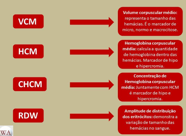 <p>Volume corpuscular médio: representa tamanho das VCM hemácias. É o marcador de micro, normo e macrocitose. Hemoglobina corpuscular HCM média: calcula a quantidade de hemoglobina dentro das hemácias. Marcador de hipo e hipercromia. Concentração de CHCM Hemoglobina corpuscular média: Juntamente com HCM é marcador de hipo e hipercromia. Amplitude de distribuição RDW dos eritrócitos: demonstra a variação de tamanho das hemácias no sangue. VA</p>