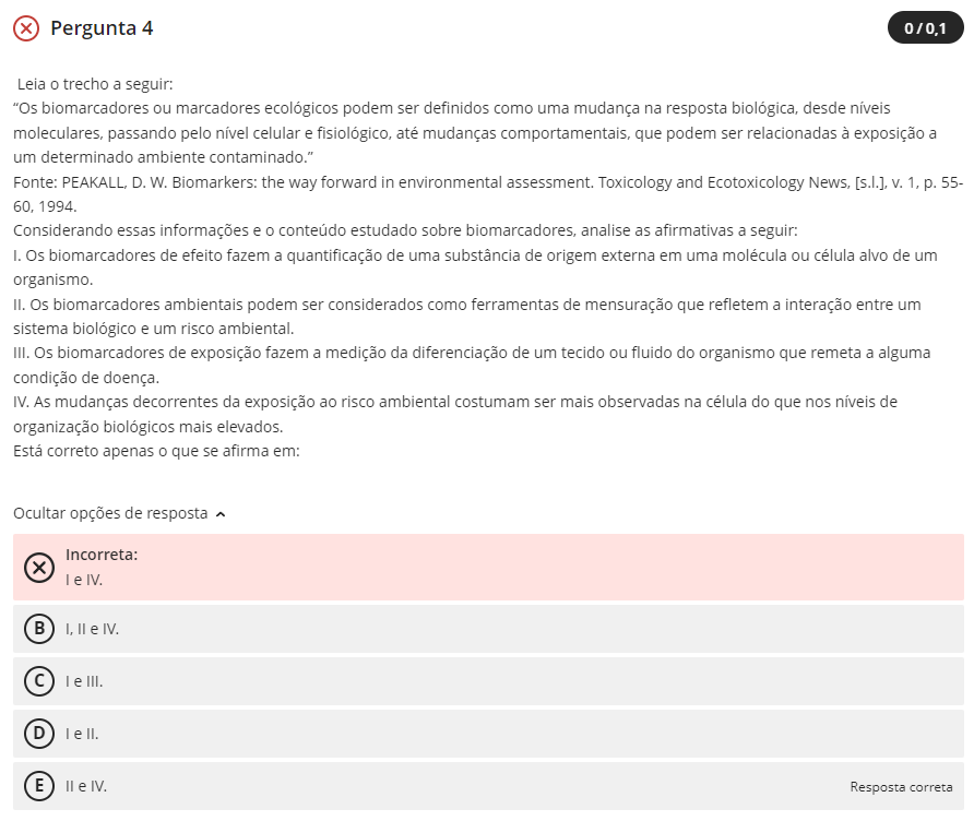 <p>Pergunta 4 Leia trecho a seguir: "Os biomarcadores ou marcadores ecológicos podem ser definidos como uma mudança na resposta biológica, desde níveis moleculares, passando pelo nível celular e fisiológico, até mudanças comportamentais, que podem ser relacionadas à exposição a um determinado ambiente contaminado." Fonte: PEAKALL, D. W. Biomarkers: the way forward in environmental Toxicology and Ecotoxicology News, [s.l.], V. 1, p. 55- 60, 1994. Considerando essas informações e conteúdo estudado sobre biomarcadores, analise as afirmativas a seguir: I. Os biomarcadores de efeito fazem a quantificação de uma substância de origem externa em uma molécula ou célula alvo de um organismo. II. Os biomarcadores ambientais podem ser considerados como ferramentas de mensuração que refletem a interação entre um sistema biológico e um risco ambiental. III. Os biomarcadores de exposição fazem a medição da diferenciação de um tecido ou fluido do organismo que remeta a alguma condição de doença. IV. As mudanças decorrentes da exposição ao risco ambiental costumam ser mais observadas na célula do que nos níveis de organização biológicos mais elevados. Está correto apenas que se afirma em: Ocultar opções de resposta Incorreta: I IV. B I, II e IV. C I III. D II. E II e IV. Resposta correta</p>
