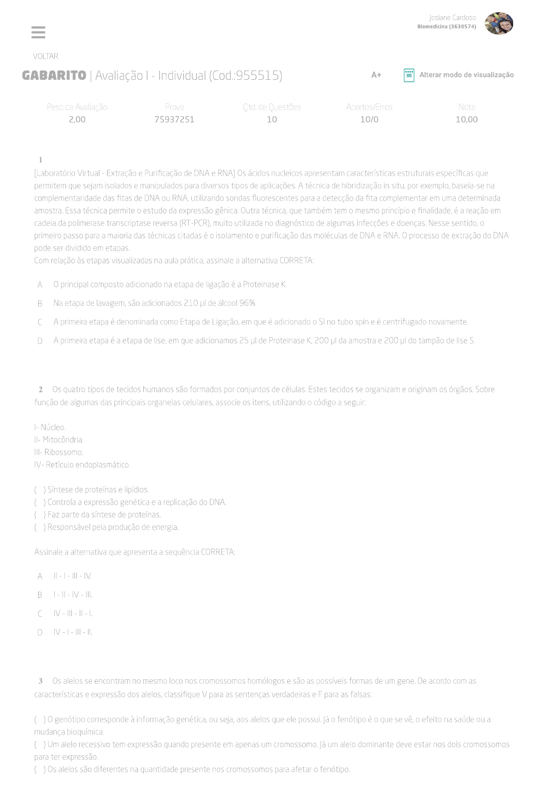 <p>Josiane Cardoso Biomedicina (3630574) VOLTAR GABARITO Avaliação - Individual (Cod.:955515) A+ Alterar modo de visualização Peso da Avaliação Prova de Questões Acertos/Erros Nota 2,00 75937251 10 10/0 10,00 1 [Laboratório Virtual Extração e Purificação de DNA e RNA] Os ácidos nucleicos apresentam características estruturais específicas que permitem que sejam isolados e manipulados para diversos tipos de aplicações. A técnica de in situ, por exemplo, baseia-se na complementaridade das fitas de DNA ou RNA, utilizando sondas fluorescentes para a detecção da fita complementar em uma determinada amostra. Essa técnica permite estudo da expressão gênica. Outra técnica, que também tem mesmo princípio e finalidade, é a reação em cadeia da polimerase transcriptase reversa (RT-PCR), muito utilizada no diagnóstico de algumas infecções e Nesse sentido, primeiro passo para a maioria das técnicas citadas é isolamento e purificação das moléculas de DNA e RNA. O processo de extração do DNA pode ser dividido em Com relação às etapas visualizadas na aula prática, assinale a alternativa CORRETA: A O principal composto adicionado na etapa de ligação é a Proteinase K. B Na etapa de lavagem, são adicionados 210 pl de álcool 96% C A primeira etapa é denominada como Etapa de Ligação, em que é adicionado SI no tubo spin e é centrifugado D A primeira etapa é a etapa de lise, em que adicionamos 25 de Proteinase K, 200 da amostra e 200 do tampão de lise S. 2 Os quatro tipos de tecidos humanos são formados por conjuntos de Estes tecidos se organizam e originam os órgãos. Sobre função de algumas das principais organelas celulares, associe os itens, utilizando código a seguir IV Retículo endoplasmático. ( ) Síntese de proteínas e ( ) Controla a expressão genética e a replicação do DNA. ( ) Faz parte da síntese de ( ) Responsável pela produção de energia. Assinale a alternativa que apresenta a sequência CORRETA: A B C D 3 Os alelos se encontram no mesmo loco nos cromossomos homólogos e são as possíveis formas de um gene. De acordo com as características e expressão dos alelos, classifique V para as sentenças verdadeiras e F para as falsas: ( ) genótipo corresponde à informação genética, ou seja, aos alelos que ele possui. fenótipo é que se vê, efeito na saúde ou a mudança ( ) Um alelo recessivo tem expressão quando presente em apenas um cromossomo. um alelo dominante deve estar nos dois cromossomos para ter expressão. ( ) Os alelos são diferentes na quantidade presente nos cromossomos para afetar</p><p>Cardoso Biomedicina (3630574) B C D 4 As células-tronco podem ser classificadas em embrionárias ou adultas, conforme sua plasticidade (capacidade de diferenciação) em totipotentes, pluripotentes e multipotentes. De acordo com a classificação das células-tronco classifique V para as sentenças verdadeiras e F para as falsas: ( ) As células totipotentes têm potencial ilimitado para se ( ) As células pluripotentes formam todo tipo de tecido. ( ) As células multipotentes produzem células do seu tecido original. Assinale a alternativa que apresenta a sequência CORRETA: A B C D 5 Na transcrição, uma molécula de RNA é sintetizada por uma das fitas de DNA, que serve de molde sendo criado um fragmento de RNA com a de bases nitrogenadas. Sobre as etapas da transcrição, assinale a alternativa INCORRETA: Durante alongamento a RNA polimerase percorre a fita molde unindo as bases nitrogenadas à fita de RNA, no sentido 5' 3 (o A "sentido da B A região promotora corresponde a uma especial de nucleotídeos que sinalizam início do gene. C A etapa mais importante durante O processamento do RNAm é a retirada dos no splicing do A transcrição é ativada por proteínas denominadas de fatores de tradução que se ligam ao RNA em locais específicos dos D cromossomos. 6 As células somáticas apresentam 23 pares de cromossomos, possuindo, portanto, um número diploide (2n) de 46 cromossomos, ao qual dá- se nome de cariótipo. Sobre cariótipo humano, assinale a alternativa CORRETA: Cada par autossômico de 1 a 23 possui dois cromossomos diferentes e com genes distintos, conhecidos como cromossomos A Dos 23 pares de cromossomos do nosso cariótipo, 22 são semelhantes em mulheres e homens, recebem nome de autossômicos. Os cromossomos sexuais são morfologicamente distintos e determinam sexo do indivíduo: XY se for mulher e XX se for D O e espermatozoide são células reprodutivas ou gametas e são as únicas células diploides (2n) do nosso corpo.</p><p>Cardoso Biomedicina (3630574) tais fatores não são Porém, encontra-se certa dificuldade em estudar processo de individualização em gêmeos devido a algumas de suas particularidades, como a genética e ambiente de criação compartilhados, intensificando, consequentemente, as ideações e práticas culturais sob desenvolvimento gemelar. De acordo com a formação de gêmeos, classifique V para as sentenças verdadeiras e F para as falsas: ( ) Os gêmeos bivitelinos são diferentes geneticamente, sendo originados a partir da liberação de dois secundários durante a ovulação. ( ) Os gêmeos univitelinos são formados a partir de um único óvulo ( ) Os gêmeos bivitelinos possuem mesmo genoma e sexo, já os univitelinos podem ser do mesmo sexo ou não e a semelhança será como a de dois irmãos nascidos em épocas Assinale a alternativa que apresenta a sequência CORRETA: A B C D 8 [Laboratório Virtual Extração e Purificação de DNA e RNA] As amostras contendo DNA ou RNA purificados devem ser: 1) ressuspensas em um tampão e armazenadas em tubos, ambos "livres" de enzimas que possam degradá-las (como DNAse ou RNAse nucleases); e 2) mantidas em baixas temperaturas (-20 ou Todos os procedimentos devem ser realizados com luvas para evitar a degradação das amostras, devido à presença de nucleases nos fluidos corporais das De acordo com processo de extração de DNA 
