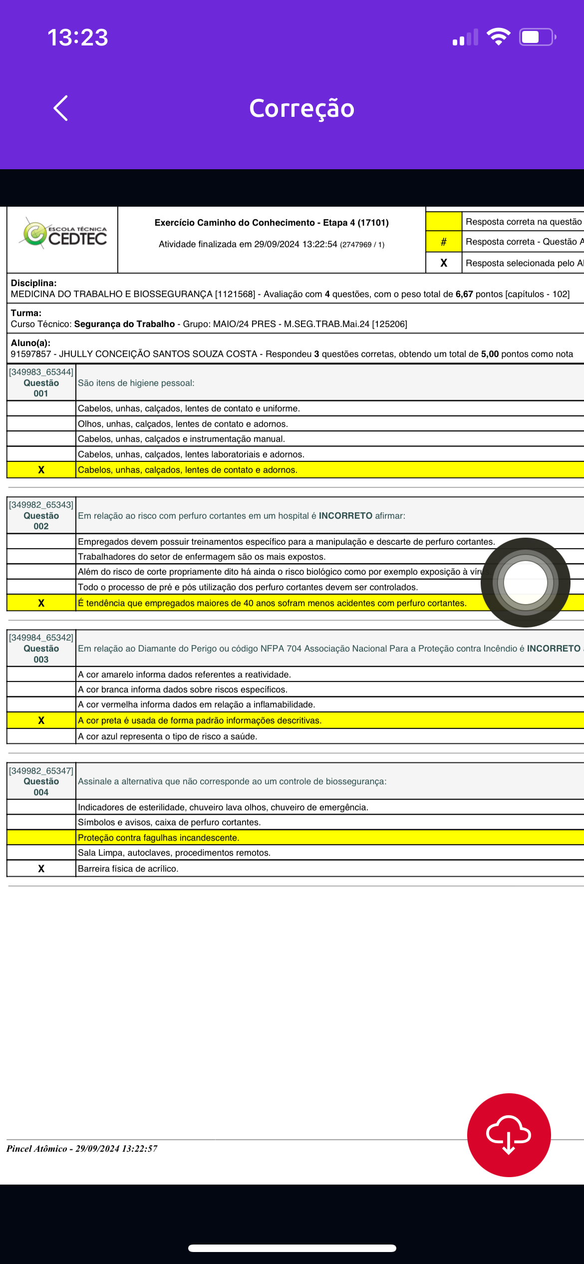 <p>13:23 Correção Exercício Caminho do Conhecimento Etapa 4 (17101) Resposta correta na questão ESCOLA CEDTEC Atividade finalizada em 29/09/2024 13:22:54 (2747969 / 1) # Resposta correta Questão A X Resposta selecionada pelo Al Disciplina: MEDICINA DO TRABALHO E BIOSSEGURANÇA [1121568] - Avaliação com 4 questões, com o peso total de 6,67 pontos [capítulos - 102] Turma: Curso Técnico: Segurança do Trabalho - Grupo: MAIO/24 PRES - - [125206] Aluno(a): 91597857 - JHULLY CONCEIÇÃO SANTOS SOUZA COSTA Respondeu 3 questões corretas, obtendo um total de 5,00 pontos como nota [349983_65344] Questão São itens de higiene pessoal: 001 Cabelos, unhas, calcados, lentes de contato e uniforme. unhas, lentes de contato e adornos. Cabelos. unhas, calçados e instrumentação manual. Cabelos, unhas, calcados, lentes laboratoriais e adornos. X Cabelos, unhas, lentes de contato e adornos. [349982_65343] Questão Em relação ao risco com perfuro cortantes em um hospital é INCORRETO 002 Empregados devem possuir treinamentos específico para a manipulação e descarte de perfuro cortantes. Trabalhadores do setor de enfermagem são os mais expostos. Além do risco de corte propriamente dito há ainda o risco biológico como por exemplo exposição à Todo o processo de pré e pós utilização dos perfuro cortantes devem ser controlados. É tendência que empregados maiores de 40 anos sofram menos acidentes com perfuro cortantes. Questão Em relação ao Diamante do Perigo ou código NFPA 704 Associação Nacional Para a Proteção contra Incêndio é INCORRETO 003 A amarelo informa dados referentes a A con branca informa dados sobre riscos específicos. A cor vermelha informa dados em relação a X A preta é usada de forma padrão informações descritivas. A con azul representa o tipo de risco a saúde. [349982_65347] Questão Assinale a alternativa que não corresponde ao um controle de biossegurança: 004 Indicadores de esterilidade, chuveiro lava olhos, chuveiro de emergência. Símbolos e avisos, caixa de perfuro cortantes. Proteção contra fagulhas incandescente. Sala Limpa, autoclaves, procedimentos remotos. X Barreira física de acrílico. Pincel Atômico - 29/09/2024 13:22:57</p>