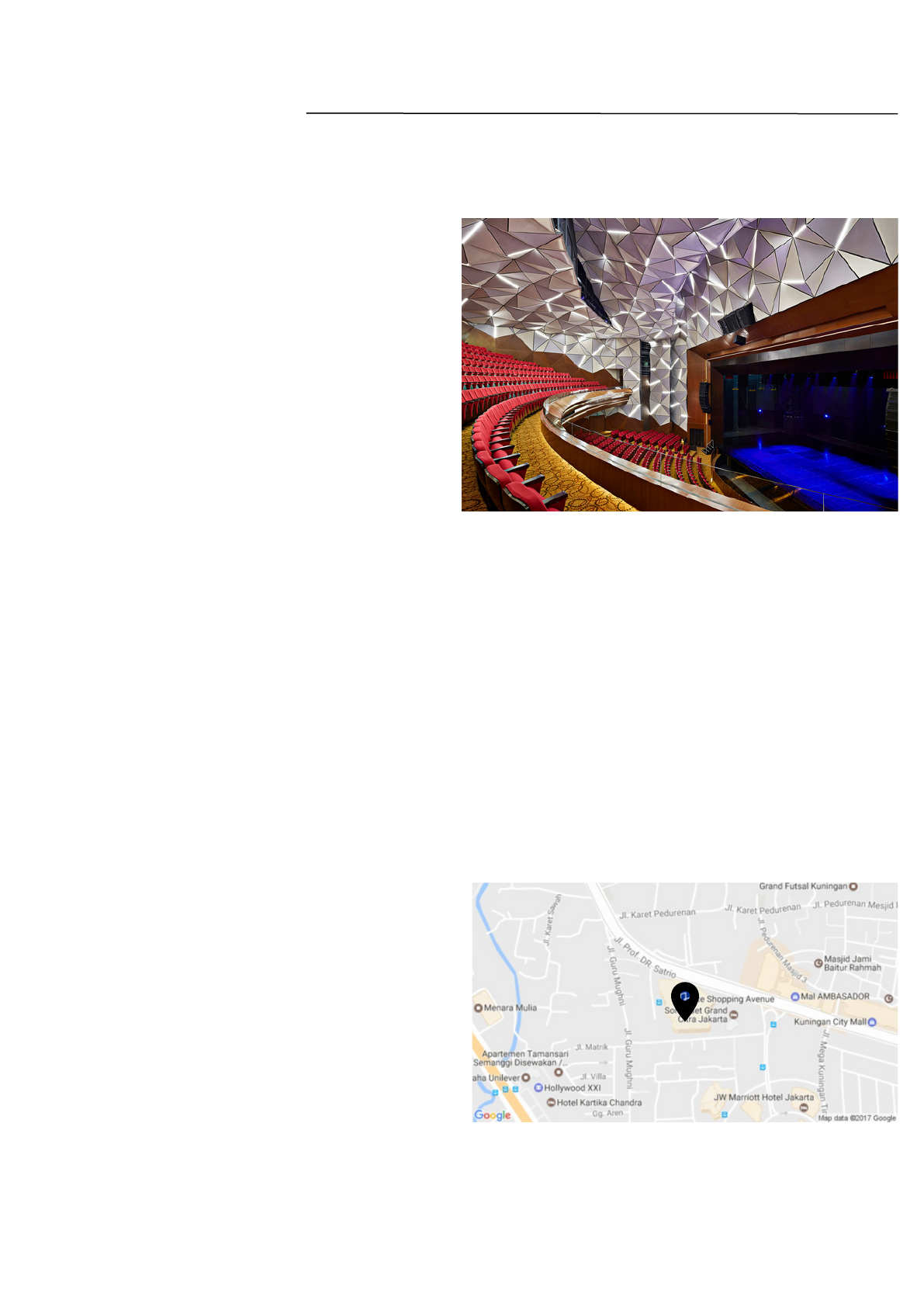 <p>Artpreneur</p><p>Ficha Técnica</p><p>Nome do projeto: Ciputra Artpreneur</p><p>Arquitetos: Benoy Architects</p><p>Área: 14.000m²</p><p>Ano de Projeto: 2014</p><p>Local: SetiaBudi, Jacarta - Indonésia</p><p>Figura 1- Ciputra Artpreneur, Benoy -via ArchDaily</p><p>Partido Arquitetônico</p><p>O Ciputra Artpreneur integra arte e</p><p>comércio nos níveis superiores do Ciputra</p><p>Jakarta Mall, em Jacarta. O projeto oferece</p><p>14.000 m² de espaço multifuncional,</p><p>incluindo um teatro com 1.200 lugares, salas</p><p>de exposições flexíveis, um museu e salas</p><p>multiuso. A arquitetura promove a</p><p>continuidade espacial e a flexibilidade,</p><p>permitindo uma adaptação versátil para</p><p>diferentes eventos e exposições, ao mesmo</p><p>tempo em que cria uma conexão natural</p><p>com o ambiente comercial do shopping.</p><p>Entorno Imediato</p><p>O Ciputra Artpreneur está situado no coração de</p><p>Jacarta, integrado ao Ciputra Jakarta Mall, em um</p><p>entorno urbano dinâmico e de alta densidade. O</p><p>entorno é caracterizado por uma densa</p><p>concentração urbana, com uma mistura de</p><p>edifícios comerciais, hotéis, escritórios e áreas</p><p>residenciais de alta densidade.</p><p>A localização central, com fácil acesso a</p><p>transportes e proximidade de outros marcos da</p><p>cidade, garante um fluxo constante de visitantes e</p><p>fortalece o complexo como um importante hub</p><p>cultural e comercial na região.</p><p>Figura 2 - Entorno do Ciputra Jakarta Mall - Google Maps 2024</p><p>Funcionalidade e Volumetria</p><p>O projeto é marcado pela sua integração</p><p>vertical com o Ciputra Jakarta Mall,</p><p>resultando em uma composição</p><p>arquitetônica que se desenvolve em</p><p>diferentes níveis. Essa verticalização</p><p>permite que o complexo cultural se</p><p>sobreponha ao espaço comercial, criando</p><p>uma estrutura coesa que se destaca na</p><p>paisagem urbana de Jacarta.</p><p>O volume do edifício é projetado para</p><p>acomodar as várias funções do complexo —</p><p>teatro, salas de exposições, museu e espaços</p><p>multiuso — de maneira fluida e organizada.</p><p>Cada função ocupa um volume que se</p><p>relaciona diretamente com as necessidades</p><p>espaciais específicas, contribuindo para a</p><p>flexibilidade e a permeabilidade dos</p><p>ambientes internos.</p><p>Ciputra</p><p>Figura 4 - Planta baixa - Archdaily</p><p>Estrutura Interna</p><p>Figura 3 - Ciputra Artpreneur, vista</p><p>interna - Archdaily</p><p>Com um interior geométrico marcante, o teatro apresenta paredes</p><p>dobradas e detalhes no teto. A forma distinta é composta por painéis</p><p>celulares revestidos com tecido elástico, realçados por faixas</p><p>iluminadas. Uma cortina acústica posicionada atrás dos painéis garante</p><p>um isolamento sonoro completo para o espaço de apresentações.</p><p>O auditório, em estilo proscênio, acomoda 865 pessoas distribuídas em</p><p>dois níveis, com 365 assentos na parte superior. A forma ovalada do</p><p>teatro proporciona um ângulo de visão ideal, garantindo uma</p><p>experiência visual aprimorada para o público.</p><p>A planta baixa do Ciputra Artpreneur é organizada</p><p>para facilitar a circulação fluida entre teatro, salas de</p><p>exposições, museu e áreas multiuso, integrando</p><p>perfeitamente o espaço cultural com o Ciputra Jakarta</p><p>Mall. O teatro está estrategicamente posicionado para</p><p>maximizar a acústica, enquanto as salas de exposições</p><p>são flexíveis e adaptáveis. Áreas de apoio são</p><p>discretamente localizadas para garantir eficiência sem</p><p>interferir na experiência dos visitantes. O layout</p><p>prioriza uma experiência confortável e contínua,</p><p>harmonizando as funções culturais e comerciais.</p><p>Análise da planta</p><p>Conforto Acústico</p><p>1. Teatro:</p><p>- Forma e Design: A forma ovalada do teatro melhora a acústica ao refletir o som uniformemente e</p><p>garantir clareza auditiva para todos os espectadores.</p><p>- Tratamento Acústico: O uso de painéis acústicos e materiais absorventes controla a reverberação</p><p>e evita ecos indesejados, criando um ambiente sonoro equilibrado.</p><p>- Posição do Palco: O design do palco e do auditório assegura que o som se propague diretamente</p><p>para o público, minimizando distorções e melhorando a eficiência sonora.</p><p>2. Salas de Exposição:</p><p>As salas de exposições do Ciputra Artpreneur são projetadas para flexibilidade, com soluções</p><p>acústicas adaptativas como barreiras móveis e painéis ajustáveis. O projeto também inclui</p><p>medidas para controlar o ruído externo e minimizar o vazamento sonoro entre as salas, utilizando</p><p>portas e divisórias acústicas para manter a qualidade do som.</p><p>3. Museu e Espaços Multiuso:</p><p>Para o museu e as salas multiuso, o projeto deve garantir clareza sonora para apresentações e</p><p>eventos interativos, adaptando-se às diversas necessidades acústicas. O controle da reverberação</p><p>é alcançado com materiais de absorção acústica, proporcionando um ambiente auditivo</p><p>confortável sem comprometer a qualidade das exposições.</p><p>Figura 5 - Corte transversal do Auditório - Archdaily</p><p>Análise Crítica</p><p>O Ciputra Artpreneur integra-se ao Ciputra Jakarta Mall, maximizando o fluxo de visitantes,</p><p>mas exige um bom isolamento acústico para evitar interferências do shopping nas atividades</p><p>culturais. A forma ovalada do teatro e o tratamento acústico são positivos, junto da utilização</p><p>do material de tecido. A flexibilidade das salas de exposições é vantajosa. O projeto prioriza</p><p>uma boa experiência para o usuário, e a eficácia do isolamento e das soluções acústicas é ser</p><p>monitorada e ajustada conforme necessário.</p><p>https://www.archdaily.com.br/br/771790/ciputra-artpreneur-benoy?ad_medium=widget&ad_name=navig