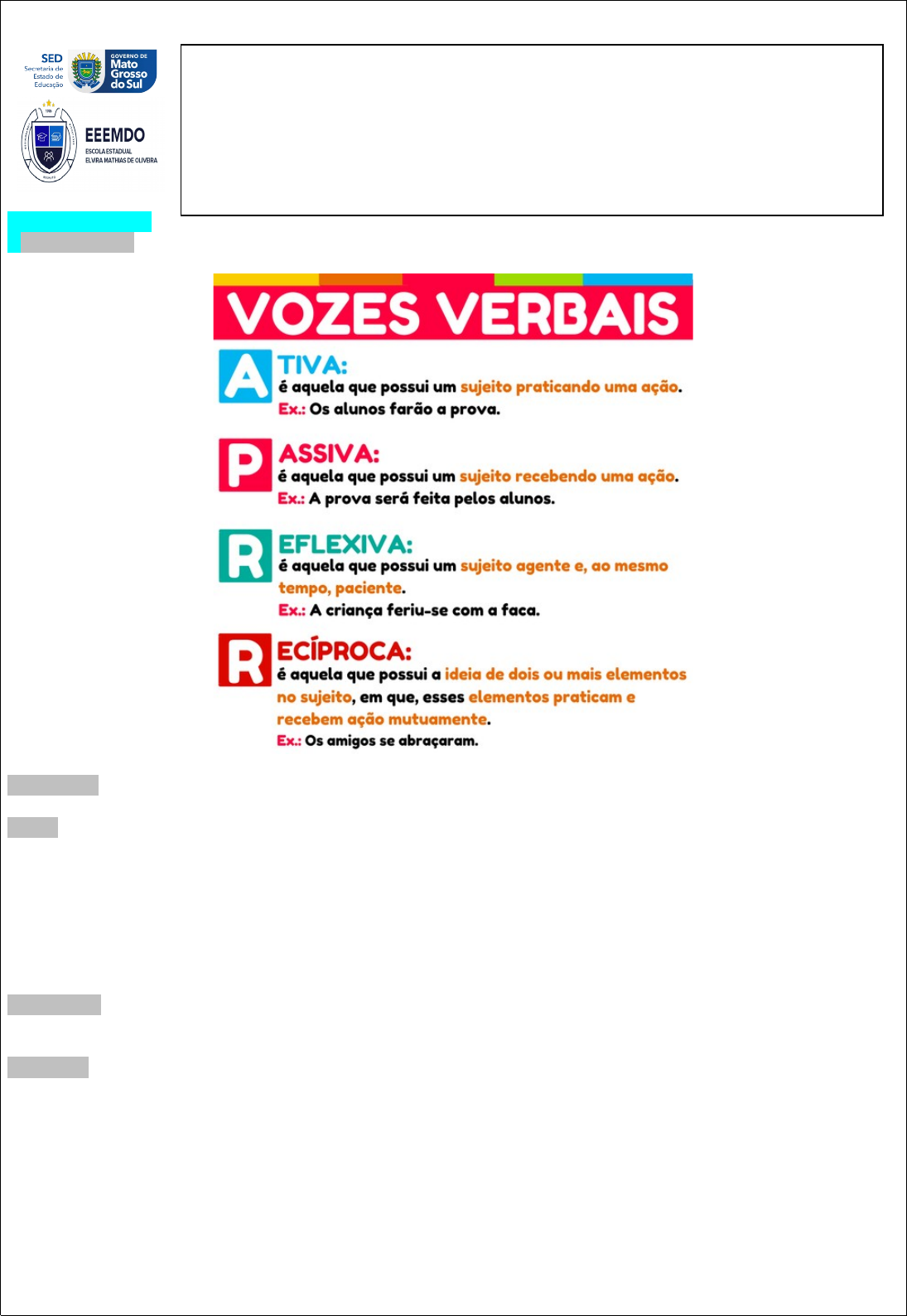 <p>ESCOLA ESTADUAL ELVIRA MATHIAS DE OLIVEIRA</p><p>CAMPO GRANDE,________DE OUTUBRO DE 2024.</p><p>NOME:___________________________________ 1º ANO A</p><p>07 DE OUTUBRO – PORTUGUÊS</p><p>HISTÓRIA</p><p>ARTE</p><p>HUMBERTO AUGUSTO MIRANDA ESPÍNDOLA</p><p>É UM ARTISTA PLÁSTICO BRASILEIRO, CRIADOR E DIFUSOR DO TEMA BOVINOCULTURA.</p><p>SUA PRODUÇÃO PARTE DO TEMA DO BOI, VISTO COMO SÍMBOLO DA RIQUEZA DE MATO GROSSO. EM BOVINOCULTURA, REALIZA UM RETRATO SARCÁSTICO DA SOCIEDADE DO BOI, QUE É PRINCIPALMENTE MOEDA E SÍMBOLO DE PODER.</p><p>BIOLOGIA</p><p>ELETIVA</p><p>OS 12 OBJETIVOS DE DESENVOLVIMENTO SUSTENTÁVEL (ODS)</p><p>1. FIM DA POBREZA</p><p>2. FOME ZERO</p><p>3. SAÚDE E BEM-ESTAR</p><p>4. EDUCAÇÃO DE QUALIDADE</p><p>5. IGUALDADE DE GÊNERO</p><p>6. ÁGUA LIMPA E SANEAMENTO</p><p>7. ENERGIA LIMPA E ACESSÍVEL</p><p>8. TRABALHO DECENTE E CRESCIMENTO ECONÔMICO</p><p>9. INDÚSTRIA, INOVAÇÃO E INFRAESTRUTURA</p><p>10. REDUÇÃO DAS DESIGUALDADES</p><p>11. CIDADES E COMUNIDADES SUSTENTÁVEIS</p><p>12. CONSUMO E PRODUÇÃO RESPONSÁVEL</p><p>08 DE OUTUBRO</p><p>MATEMÁTICA</p><p>PROJETO DE VIDA</p><p>QUÍMICA</p><p>INGLÊS</p><p>FILOSOFIA</p><p>09 DE OUTUBRO</p><p>R.A. L. PORTUGUESA</p><p>UM BEM-TE-VI</p><p>MANOEL DE BARROS</p><p>O LEVE E MACIO</p><p>RAIO DE SOL</p><p>SE PÕE NO RIO.</p><p>FAZ ARREBOL…</p><p>DA ÁRVORE EVOLA</p><p>AMARELO, DO ALTO</p><p>BEM-TE-VI-CARTOLA</p><p>E, DE UM SALTO</p><p>POUSA ENVERGADO</p><p>NO BEBEDOURO</p><p>A BANHAR SEU LOURO</p><p>PELO ENRAMADO…</p><p>DE ARREPIO, NA CERCA</p><p>JÁ SE ABRIU E SECA.</p><p>1. ENCONTRE AS PALAVRAS QUE RIMAM, PINTE-AS E DEPOIS REGISTRE-AS ABAIXO.</p><p>LITERATURA</p><p>PROSA ROMÂNTICA BRASILEIRA:</p><p>NO BRASIL, O DESENVOLVIMENTO DA PROSA ROMÂNTICA É PARALELO AO DESENVOLVIMENTO DA IMPRENSA NO PAÍS, QUE FOI INTRODUZIDA EM 1808. ANTES DA VINDA DA CORTE AO RIO DE JANEIRO, PORTUGAL NÃO PERMITIA O DESENVOLVIMENTO E A INTRODUÇÃO DA IMPRENSA AQUI NO BRASIL. A ATIVIDADE PASSOU A SER DESENVOLVIDA SOMENTE COM A VINDA DA CORTE PORTUGUESA AO BRASIL, EM 1808, QUE EXIGIU O DESENVOLVIMENTO DA COLÔNIA PARA ATENDER AO SEU MODO DE VIDA. COM O DESENVOLVIMENTO DA IMPRENSA, CRIOU-SE UM PÚBLICO LEITOR QUE IMPULSIONOU UM GRANDE NÚMERO DE PUBLICAÇÕES EM FOLHETINS, FORMATO QUE PERMITIU O SURGIMENTO E DESENVOLVIMENTO DA PROSA ROMÂNTICA, QUE, AO LADO DA POESIA, FORMARAM TODA A PRODUÇÃO LITERÁRIA ROMÂNTICA.</p><p>TIPOS DE ROMANCES: TEMOS QUATRO TIPOS DE ROMANCES NO MOVIMENTO: O INDIANISTA, HISTÓRICO, REGIONAL E URBANO E ERA BEM COMUM QUE OS ESCRITORES DA PROSA DO PERÍODO CAMINHASSEM ENTRE OS VÁRIOS TIPOS.</p><p>ROMANCE INDIANISTA</p><p>O ROMANCE INDIANISTA TRAZ À TONA A VIDA, CULTURA, CRENÇA E COSTUMES INDÍGENAS. O ÍNDIO SURGE COMO HERÓI, REPRESENTANDO O BRASIL E OS BRASILEIROS, SENDO CORAJOSO, HERÓICO, FORTE, IDEALIZADO. HÁ UMA VALORIZAÇÃO DA NATUREZA E O ESPAÇO ONDE OCORRE A NARRATIVA REMETE AO NATURAL, À PAISAGEM BRASILEIRA.</p><p>EXEMPLOS DE ROMANCES INDIANISTAS: IRACEMA, O GUARANI E UBIRAJARA, DE JOSÉ DE ALENCAR.</p><p>ROMANCE HISTÓRICO</p><p>O ROMANCE HISTÓRICO TRAZ O RETRATO DE COSTUMES DE UMA ÉPOCA PASSADA, SENDO UM RELATO QUE MUITAS VEZES MISTURA FICÇÃO E REALIDADE.</p><p>EXEMPLOS DE ROMANCES HISTÓRICOS: AS MINAS DE PRATA E A GUERRA DOS MASCATES, AMBOS DE JOSÉ DE ALENCAR.</p><p>É IMPORTANTE SABER QUE ROMANCES INDIANISTAS TAMBÉM PODEM SER CONSIDERADOS HISTÓRICOS.</p><p>ROMANCE REGIONALISTA</p><p>POR FIM, TEMOS O ROMANCE REGIONALISTA, PASSADO EM AMBIENTE RURAL, MOSTRANDO COSTUMES, VALORES E CULTURA TÍPICA DE UMA REGIÃO. ESTE TIPO DE ROMANCE TRAZIA UM MAIOR CONHECIMENTO DO BRASIL SOBRE SI PRÓPRIO, UMA VEZ QUE VOLTAVA SEU OLHAR PRA REGIÕES DIFERENTES DO BRASIL, TRAZENDO À TONA SUA DIVERSIDADE. NESTE CENÁRIO RURAL HÁ UM HERÓI DO CAMPO, SERTANEJO, ALGUÉM QUE PERTENCE À SUA TERRA E É O RETRATO DESTA. É BRAVO E HONRADO, PREZA A MORAL E OS COSTUMES DE SEU AMBIENTE, COLOCANDO-SE CONTRÁRIO ÀS LIBERALIDADES DA CIDADE E DOS HOMENS DE LÁ. É IMPORTANTE RESSALTAR QUE NÃO HÁ TENSÃO SOCIAL NO ROMANCE ROMÂNTICO REGIONALISTA, SENDO ESTE APENAS UM RETRATO REGIONAL DE COSTUMES, SEM CRÍTICAS.</p><p>EXEMPLOS DE ROMANCES REGIONALISTAS: INOCÊNCIA, DE VISCONDE DE TAUNAY; O TRONCO DO IPÊ, TIL E O GAÚCHO, DE JOSÉ DE ALENCAR; A ESCRAVA ISAURA, DE BERNARDO GUIMARÃES.</p><p>JOSÉ DE ALENCAR</p><p>PODEMOS CONSIDERAR ALENCAR COMO O PRECURSOR DO ROMANTISMO NO BRASIL DENTRO DAS QUATRO CARACTERÍSTICAS: INDIANISTA, PSICOLÓGICO, REGIONAL E HISTÓRICO.</p><p>ESTE AUTOR BRASILEIRO UTILIZOU COMO TEMA O ÍNDIO E O SERTÃO DO BRASIL E, AO CONTRÁRIO DE OUTROS ROMANCISTAS DE SUA ÉPOCA QUE ESCREVIAM COM SE VIVESSEM EM PORTUGAL, ALENCAR VALORIZAVA A LÍNGUA FALADA NO BRASIL.</p><p>ESCRITOR DE OBRAS COM ESTILOS VARIADOS, ESTE ESCRITOR CEARENSE CRIOU ROMANCES QUE ABORDAM O COTIDIANO. DESTE ESTILO LITERÁRIO, TAMBÉM CONHECIDO COMO ROMANCE DE COSTUMES, DESTACAM-SE OS LIVROS: DIVA, LUCÍOLA E A VIUVINHA. FORAM TAMBÉM DE SUA AUTORIA OS ROMANCES REGIONALISTAS: O SERTANEJO, O TRONCO DO IPÊ, O GAÚCHO E TIL. DOS ROMANCES HISTÓRICOS FAZEM PARTE: AS MINAS DE PRATA E A GUERRA DOS MASCATES.</p><p>NO ROMANCE INDIANISTA DE JOSÉ DE ALENCAR, O ÍNDIO É VISTO EM TRÊS ETAPAS DIFERENTES: ANTES DE TER CONTATO COM O BRANCO, EM UBIRAJARA; UM BRANCO CONVIVENDO NO MEIO INDÍGENA, EM IRACEMA E O ÍNDIO NO COTIDIANO DO HOMEM BRANCO, EM O GUARANI.</p><p>É DENTRO DO ESTILO INDIANISTA DO ESCRITOR JOSÉ DE ALENCAR QUE ESTÁ SUA OBRA MAIS IMPORTANTE: IRACEMA. OUTRA OBRA TAMBÉM CONSIDERADA DE GRANDE VALOR LITERÁRIO É O GUARANI, POIS ABORDA OS ASPECTOS DA FORMAÇÃO NACIONAL BRASILEIRA.</p><p>APESAR DE SER MAIS CONHECIDO POR SUAS OBRAS LITERÁRIAS, O ESCRITOR BRASILEIRO JOSÉ DE ALENCAR FEZ TAMBÉM ALGUMAS PEÇAS DE TEATRO: NAS ASAS DE UM ANJO, MÃE, O DEMÔNIO FAMILIAR. FALECEU AOS 48 ANOS DE IDADE, EM 1877, DEIXANDO INÚMERAS OBRAS QUE FAZEM SUCESSO ATÉ OS DIAS ATUAIS.</p><p>ENCONTRE AS PALAVRAS DO TEXTO NO CAÇA-PALAVRAS
