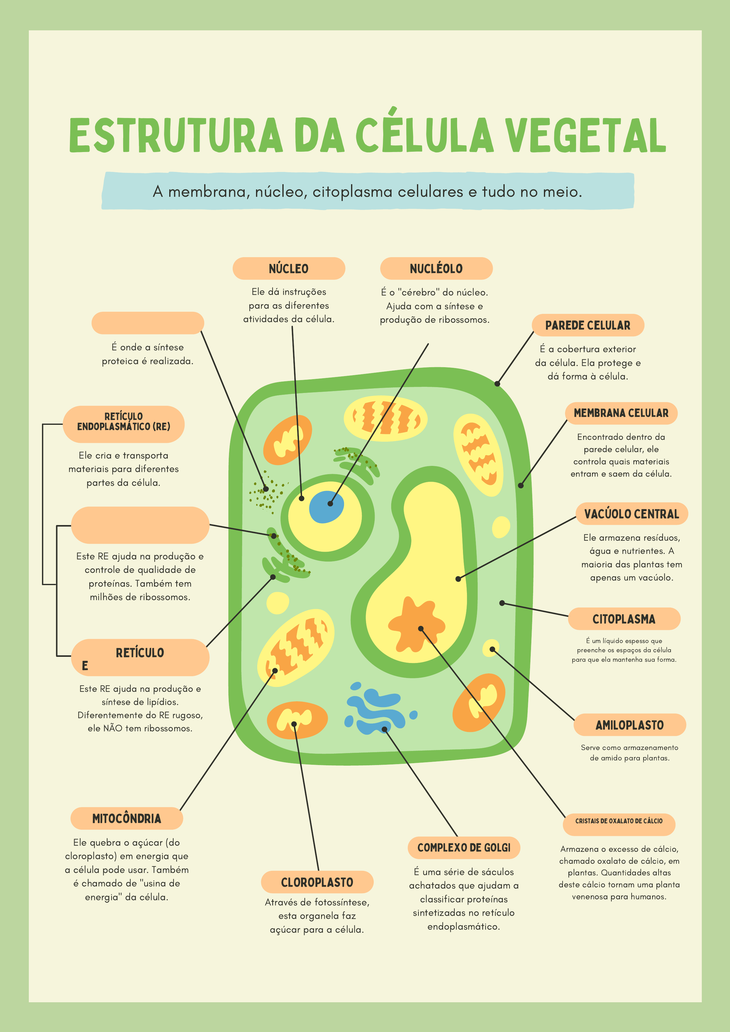 <p>É uma série de sáculos</p><p>achatados que ajudam a</p><p>classificar proteínas</p><p>sintetizadas no retículo</p><p>endoplasmático.</p><p>COMPLEXO DE GOLGI</p><p>AMILOPLASTO</p><p>CRISTAIS DE OXALATO DE CÁLCIO</p><p>Ele quebra o açúcar (do</p><p>cloroplasto) em energia que</p><p>a célula pode usar. Também</p><p>é chamado de "usina de</p><p>energia" da célula.</p><p>Mitocôndria</p><p>É um líquido espesso que</p><p>preenche os espaços da célula</p><p>para que ela mantenha sua forma.</p><p>Estrutura da Célula VEGETAL</p><p>A membrana, núcleo, citoplasma celulares e tudo no meio.</p><p>Retículo</p><p>Endoplasmático LISO</p><p>Retículo</p><p>Endoplasmático RUGOSO</p><p>Ribossomos</p><p>NÚCLEO nucléolo</p><p>Parede Celular</p><p>membrana celular</p><p>VACÚOLO CENTRAL</p><p>CLOROPLASTO</p><p>CITOPLASMA</p><p>Este RE ajuda na produção e</p><p>controle de qualidade de</p><p>proteínas. Também tem</p><p>milhões de ribossomos.</p><p>Através de fotossíntese,</p><p>esta organela faz</p><p>açúcar para a célula.</p><p>Ele armazena resíduos,</p><p>água e nutrientes. A</p><p>maioria das plantas tem</p><p>apenas um vacúolo.</p><p>Encontrado dentro da</p><p>parede celular, ele</p><p>controla quais materiais</p><p>entram e saem da célula.</p><p>É a cobertura exterior</p><p>da célula. Ela protege e</p><p>dá forma à célula.</p><p>É onde a síntese</p><p>proteica é realizada.</p><p>Este RE ajuda na produção e</p><p>síntese de lipídios.</p><p>Diferentemente do RE rugoso,</p><p>ele NÃO tem ribossomos.</p><p>Retículo</p><p>Endoplasmático (RE)</p><p>Ele cria e transporta</p><p>materiais para diferentes</p><p>partes da célula.</p><p>Armazena o excesso de cálcio,</p><p>chamado oxalato de cálcio, em</p><p>plantas. Quantidades altas</p><p>deste cálcio tornam uma planta</p><p>venenosa para humanos.</p><p>Serve como armazenamento</p><p>de amido para plantas.</p><p>Ele dá instruções</p><p>para as diferentes</p><p>atividades da célula.</p><p>É o "cérebro" do núcleo.</p><p>Ajuda com a síntese e</p><p>produção de ribossomos.</p><p>Nome SérieData professor</p><p>NOMEIE AS PARTES DA</p><p>CÉLULA VEGETAL</p><p>É um líquido espesso que preenche</p><p>os espaços da célula para que ela</p><p>mantenha sua forma.</p><p>Ele armazena resíduos, água e</p><p>nutrientes. A maioria das</p><p>plantas tem apenas um vacúolo.</p><p>Encontrado dentro da parede</p><p>celular, ele controla quais materiais</p><p>entram e saem da célula.</p><p>É a cobertura exterior da</p><p>célula. Ela protege e dá</p><p>forma à célula.</p><p>É o "cérebro" do</p><p>núcleo.</p><p>É onde a síntese</p><p>proteica é realizada.</p><p>É onde a síntese</p><p>proteica é realizada.</p><p>Ele dá instruções</p><p>para as diferentes</p><p>atividades da célula.</p><p>Este RE ajuda na</p><p>produção e controle de</p><p>qualidade de proteínas.</p><p>Também tem milhões de</p><p>ribossomos.</p><p>Este RE não tem</p><p>ribossomos. Ele ajuda na</p><p>produção e síntese de</p><p>lipídios.</p><p>Também é chamado de</p><p>"usina de energia" da</p><p>célula.</p><p>Através de fotossíntese,</p><p>esta organela faz açúcar</p><p>para a célula.</p><p>É uma série de sáculos</p><p>achatados que ajuda a</p><p>classificar proteínas.</p><p>Armazena o excesso de</p><p>cálcio, chamado oxalato</p><p>de cálcio, em plantas.</p><p>Serve como armazenamento</p><p>de amido para plantas.</p><p>A membrana, núcleo, citoplasma celulares e tudo no meio.</p><p>Este abriga o DNA da</p><p>célula. Ele conduz a síntese</p><p>de ribossomos e proteínas.</p><p>Uma série de sáculos que</p><p>ajuda a classificar</p><p>proteínas sintetizadas no</p><p>reticulo endoplasmático.</p><p>É uma substância parecida com gel</p><p>que preenche os espaços dentro da</p><p>célula para ajudá-la a manter sua</p><p>forma.</p><p>A mitocôndria faz um</p><p>composto das ligações</p><p>químicas quebradas de</p><p>moléculas alimentares (como</p><p>açúcar) chamadas adenosina</p><p>trifosfato (ATP), que é</p><p>armazenado até ser</p><p>necessário. Também é</p><p>conhecido como a "usina de</p><p>energia da célula".</p><p>É uma bolsa que tem</p><p>enzimas digestivas que</p><p>quebram os componentes</p><p>que a célula não precisa.</p><p>Também mata bactérias</p><p>que atacam o corpo.</p><p>Estes são sáculos</p><p>membranosos que são</p><p>usados para armazenar</p><p>outras coisas nas células.</p><p>Ele têm ribossomos ligados</p><p>a ele e cria proteína.</p><p>Não tem nenhum ribossomo e</p><p>ajuda a modificar proteínas</p><p>feitas pelo RE rugoso.</p><p>É uma série de membranas</p><p>dobradas na célula que</p><p>transportam materiais.</p><p>Esta é a cobertura fina</p><p>exterior que separa o</p><p>conteúdo da célula de outras</p><p>células. Também controla que</p><p>materiais entram e saem da</p><p>célula. Também conhecida</p><p>como membrana plasmática.</p><p>Núcleo</p><p>Complexo de Golgi</p><p>Citoplasma</p><p>Mitocôndria</p><p>Lisossomo</p><p>Vacúolos</p><p>Retículo</p><p>Endoplasmático Rugoso</p><p>Retículo</p><p>Endoplasmático Liso</p><p>Retículo</p><p>Endoplasmático</p><p>Membrana celular</p><p>Estrutura da célula animal</p><p>A membrana, núcleo, citoplasma celulares e tudo no meio.</p><p>Eles são uma série de sáculos</p><p>achatados que ajudam a</p><p>classificar proteínas</p><p>sintetizadas no retículo</p><p>endoplasmático rugoso.</p><p>É uma substância parecida com</p><p>gel que preenche os espaços na</p><p>célula para ela manter sua forma.</p><p>Também é conhecido</p><p>como a "usina de</p><p>energia da célula".</p><p>É uma bolha com enzimas</p><p>digestivas que quebram os</p><p>componentes que a célula não</p><p>precisa.</p><p>Estes são sáculos membranosos</p><p>usados para armazenar outras</p><p>coisas nas células.</p><p>Esta é a cobertura fina exterior</p><p>que separa o conteúdo da</p><p>célula de outras células.</p><p>Ela tem