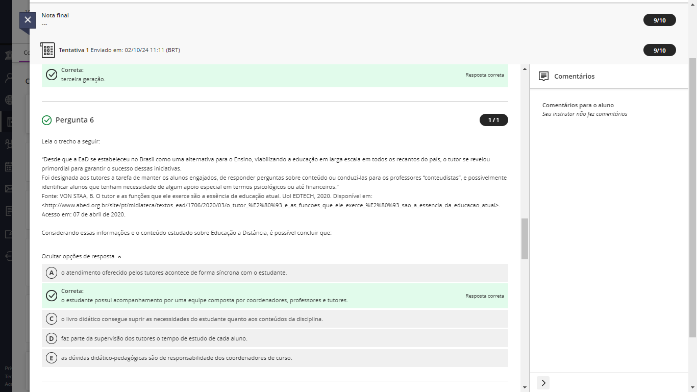 <p>Nota final 9/10 Tentativa 1 Enviado 02/10/24 11:11 (BRT) 9/10 Correta: Resposta correta Comentários terceira geração. Comentários para aluno Seu instrutor não fez comentários Pergunta 6 1/1 Leia trecho a seguir: "Desde que a EaD se estabeleceu no Brasil como uma alternativa para Ensino, viabilizando a educação em larga escala em todos os recantos do país, tutor se revelou primordial para garantir sucesso dessas Foi designada aos tutores a tarefa de manter os alunos engajados, de responder perguntas sobre conteúdo ou conduzi-las para os professores "conteudistas", e possivelmente identificar alunos que tenham necessidade de algum apoio especial em termos psicológicos ou até Fonte: VON B. tutor e as funções que ele exerce são a essência da educação atual. Uol EDTECH 2020. Disponível em: Acesso em: 07 de abril de 2020. Considerando essas informações e conteúdo estudado sobre Educação a Distância, é possível concluir que: Ocultar opções de resposta A o atendimento oferecido pelos tutores acontece de forma sincrona com Correta: Resposta correta estudante possui acompanhamento por uma equipe composta por coordenadores, professores e tutores. livro didático consegue suprir as necessidades do estudante quanto aos conteúdos da disciplina. D faz parte da supervisão dos tutores tempo de estudo de cada E as dúvidas didático-pedagógicas são de responsabilidade dos coordenadores de curso.</p>