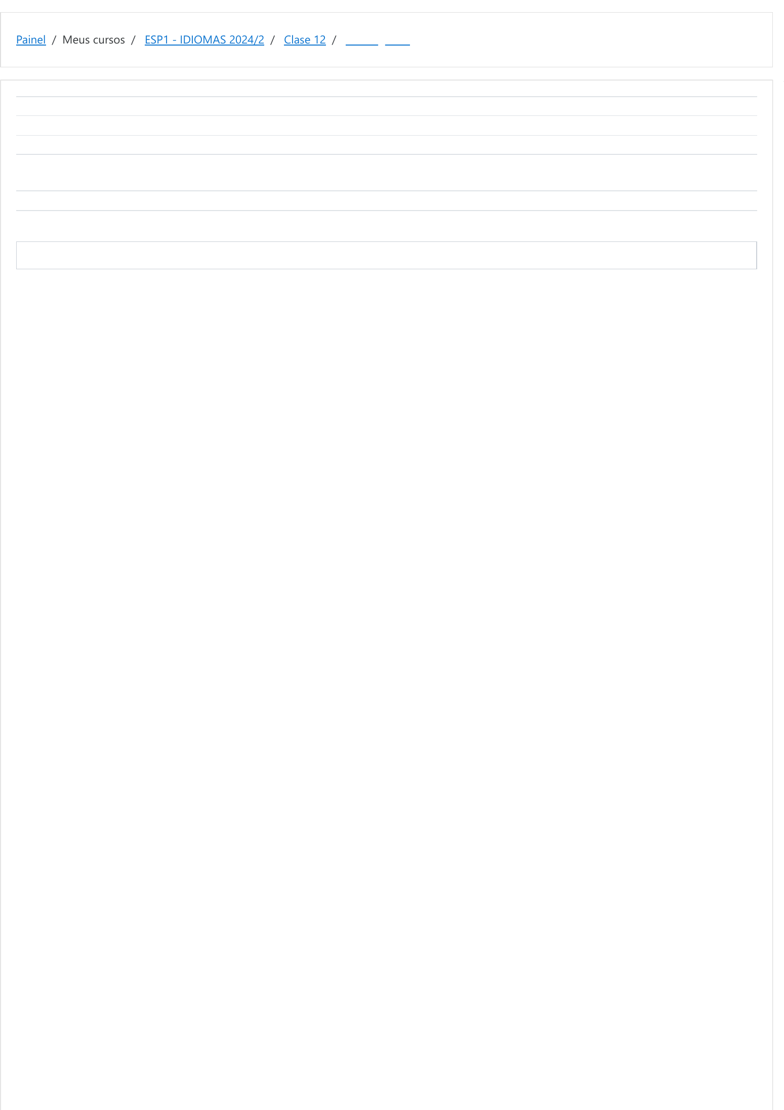 <p>Painel / Meus cursos / ESP1 - IDIOMAS 2024/2 / Clase 12 / Verbo gustar</p><p>Iniciado em domingo, 6 out 2024, 00:47</p><p>Estado Finalizada</p><p>Concluída em domingo, 6 out 2024, 00:52</p><p>Tempo</p><p>empregado</p><p>5 minutos 12 segundos</p><p>Notas 1,00/1,00</p><p>Avaliar 10,00 de um máximo de 10,00(100%)</p><p>Informação</p><p>Completa las frases con los pronombres átonos de complemento indirecto (me, te, le, nos, os,les) y con el presente de indicativo del verbo</p><p>gustar.</p><p>07/10/2024, 14:47 Verbo gustar: Revisão da tentativa</p><p>https://moodle.ifsul.edu.br/novohamburgo/mod/quiz/review.php?attempt=8450220&cmid=61982 1/2</p><p>https://moodle.ifsul.edu.br/novohamburgo/my/</p><p>https://moodle.ifsul.edu.br/novohamburgo/course/view.php?id=373</p><p>https://moodle.ifsul.edu.br/novohamburgo/course/view.php?id=373#section-18</p><p>https://moodle.ifsul.edu.br/novohamburgo/mod/quiz/view.php?id=61982</p><p>Questão 1</p><p>Correto</p><p>Atingiu 1,00 de 1,00</p><p>A Javier   las películas de ciencia ficción.</p><p>A vosotras   ir de compras.</p><p>A ellas   las minifaldas.</p><p>A ti no   levantarte temprano.</p><p>A nosotros    los buenos amigos.</p><p>A Jorge y a Rocío    cenar fuera de casa.</p><p>A mí   mucho la tortilla de patatas.</p><p>A ellos   las canciones en español.</p><p>A mi hijo   mucho coleccionar discos.</p><p>¿A ti   estar enamorado?</p><p>le gustan</p><p>os gusta</p><p>les gustan</p><p>te gusta</p><p>nos gustan</p><p>les gusta</p><p>me gusta</p><p>les gustan</p><p>le gusta</p><p>te gusta</p><p>Sua resposta está correta.</p><p>A resposta correta é:</p><p>A Javier [le] [gustan] las películas de ciencia ficción.</p><p>A vosotras [os] [gusta] ir de compras.</p><p>A ellas [les] [gustan] las minifaldas.</p><p>A ti no [te] [gusta] levantarte temprano.</p><p>A nosotros [nos] [gustan] los buenos amigos.</p><p>A Jorge y a Rocío [les] [gusta] cenar fuera de casa.</p><p>A mí [me ] [gusta] mucho la tortilla de patatas.</p><p>A ellos [les] [gustan] las canciones en español.</p><p>A mi hijo[le] [gusta] mucho coleccionar discos.</p><p>¿A ti [te] [gusta] estar enamorado?</p><p>◄ Gustar o interesar</p><p>Seguir para...</p><p>Pronombres de objeto directo ►</p><p>07/10/2024, 14:47 Verbo gustar: Revisão da tentativa</p><p>https://moodle.ifsul.edu.br/novohamburgo/mod/quiz/review.php?attempt=8450220&cmid=61982 2/2</p><p>https://moodle.ifsul.edu.br/novohamburgo/mod/quiz/view.php?id=61981&forceview=1</p><p>https://moodle.ifsul.edu.br/novohamburgo/mod/quiz/view.php?id=61983&forceview=1</p>