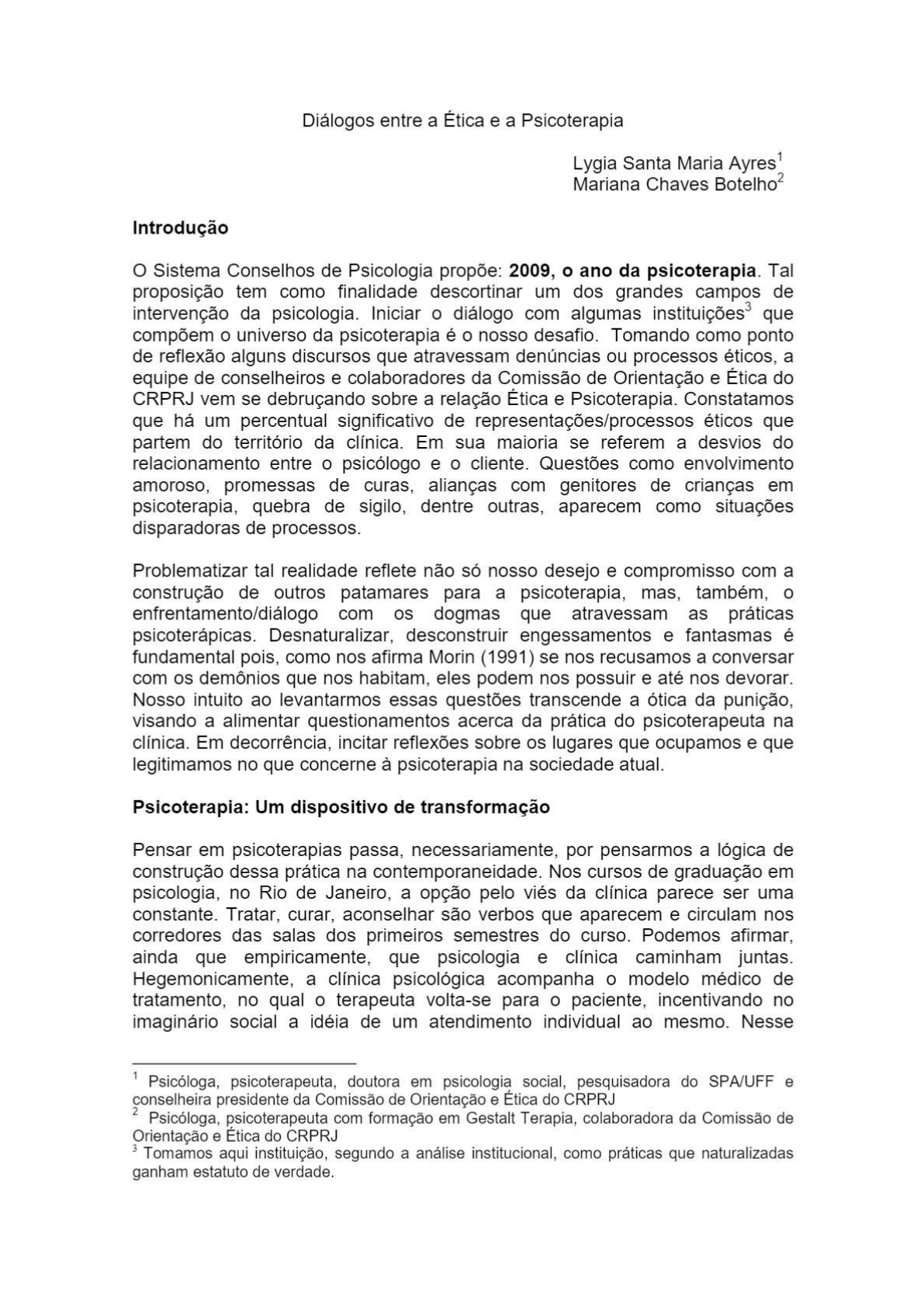 <p>Diálogos entre a Ética e a Psicoterapia Lygia Santa Maria Mariana Chaves Introdução Sistema Conselhos de Psicologia 2009, o ano da psicoterapia. Tal proposição tem como finalidade descortinar um dos grandes campos de intervenção da psicologia. Iniciar o diálogo com algumas que compõem o universo da psicoterapia é o nosso desafio. Tomando como ponto de reflexão alguns discursos que atravessam denúncias ou processos éticos, a equipe de conselheiros e colaboradores da Comissão de Orientação e Ética do CRPRJ vem se sobre a relação Ética e Psicoterapia. Constatamos que há um percentual significativo de representações/processos éticos que partem do território da clínica. Em sua maioria se referem a desvios do relacionamento entre o psicólogo e o cliente. Questões como envolvimento amoroso, promessas de curas, alianças com genitores de crianças em psicoterapia, quebra de sigilo, dentre outras, aparecem como situações disparadoras de processos. Problematizar tal realidade reflete não só nosso desejo e compromisso com a construção de outros patamares para a psicoterapia, mas, também, o enfrentamento/diálogo com os dogmas que atravessam as práticas psicoterápicas. Desnaturalizar, desconstruir engessamentos e fantasmas é fundamental pois, como nos afirma Morin (1991) se nos recusamos a conversar com os demônios que nos habitam, eles podem nos possuir e até nos devorar. Nosso intuito ao levantarmos essas questões transcende a ótica da punição, visando a alimentar questionamentos acerca da prática do psicoterapeuta na clínica. Em decorrência, incitar reflexões sobre os lugares que ocupamos e que legitimamos no que concerne à psicoterapia na sociedade atual. Psicoterapia: Um dispositivo de transformação Pensar em psicoterapias passa, necessariamente, por pensarmos a lógica de construção dessa prática na contemporaneidade. Nos cursos de graduação em psicologia, no Rio de Janeiro, a opção pelo viés da clínica parece ser uma constante. Tratar, curar, aconselhar são verbos que aparecem e circulam nos corredores das salas dos primeiros semestres do curso. Podemos afirmar, ainda que empiricamente, que psicologia e clínica caminham juntas. Hegemonicamente, a clínica psicológica acompanha o modelo médico de tratamento, no qual o terapeuta volta-se para o paciente, incentivando no imaginário social a idéia de um atendimento individual ao mesmo. Nesse 1 Psicóloga, psicoterapeuta, doutora em psicologia social, pesquisadora do SPA/UFF e conselheira presidente da Comissão de Orientação e Ética do CRPRJ 2 Psicóloga, psicoterapeuta com formação em Gestalt Terapia, colaboradora da Comissão de Orientação e Ética do CRPRJ 3 Tomamos aqui instituição, segundo a análise institucional, como práticas que naturalizadas ganham estatuto de verdade.</p><p>sentido, a escuta do psicoterapeuta (psicólogo, psicanalista, psiquiatra) é direcionada ao sujeito, pois, via de regra, é ele quem opera a demanda por psicoterapia. Trabalhamos aqui com a noção de sujeito coletivo, na medida em que somos constituídos no atravessamento de múltiplas vozes. Vozes e posições que dialogam entre si assujeitando a pessoa, mas ao mesmo tempo preservando a abertura para a inovação e para a construção de novos posicionamentos e processos de resignificação acerca do mundo, do outro e de si mesmo. Entende-se por psicoterapia o espaço no qual o paciente vai em busca de recursos para lidar com as dificuldades que ele identifica em sua vida. A interação que se instala a partir dessa procura/desejo provoca uma troca entre parceiros, cliente e psicoterapeuta, caracterizando um espaço de reflexão. Esse lugar que se configura enquanto um dispositivo de transformação do sujeito transcende os muros das clínicas, dos consultórios, dos Serviços de Psicologia Aplicada e de outros serviços de atendimento psicoterápico. Logo, também deve ser encarado como uma práxis fundamental no campo da ação social. Como nos afirma Rodrigues (2009) "A psicoterapia é antes de tudo um instrumental que deve ser entendido em seu âmbito mais amplo, ou seja, como um saber importante para os cidadãos que sofrem emocional e psicologicamente com e nas contradições da vida cotidiana. A psicoterapia deve ser reconhecida em sua amplitude social e de direitos da população em usufruir desta ferramenta" (p.51). Dessa forma, o acesso à psicoterapia deve ser garantido à população brasileira independentemente de credo, raça, condição sócio-econômica pelas políticas de Estado enquanto um instrumento de transformação social. Muitas são as vertentes teóricas que sustentam as práticas psicoterápicas. Umas apostam na relação de causa e efeito entre os objetos, outras apontam para as experiências traumáticas num determinado período da vida como os vilões da história, etc. É lógico que a escuta dar-se-á segundo as filiações teóricas que atravessam o profissional psi. No entanto, independentemente das diferenças entre as múltiplas correntes teóricas que constituem o universo das psicoterapias, uma questão que nos parece que deva permear todas elas é a possibilidade de enxergar o homem a partir de uma visão integrada/sistêmica, onde o psíquico, o orgânico e o social, dada suas porosidades, se agenciam exercendo influência na construção desse indivíduo, assim como na configuração de suas problemáticas. De qualquer forma, esse indivíduo estará sempre inserido em contextos sociais e, a partir dessa premissa, a psicoterapia deve ser incluída na luta social de direitos da população. Pensando-se sob esta perspectiva, a psicoterapia não pode ser reduzida a um lugar específico ou de apêndice de um determinado saber, seja o psicológico, seja o médico. A psicoterapia, por seu espectro de cores, pertence a uma articulação de múltiplos saberes. Na realidade, com respeito ao que constitui o profissional psi, qualquer que seja a formação