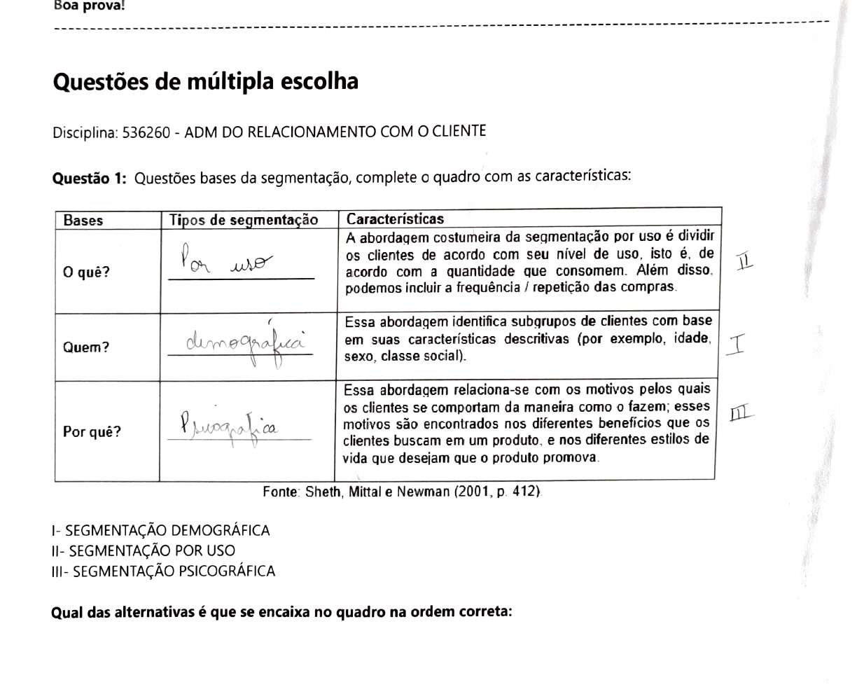 Questão 1: Questões bases da segmentação, complete o quadro com as características: