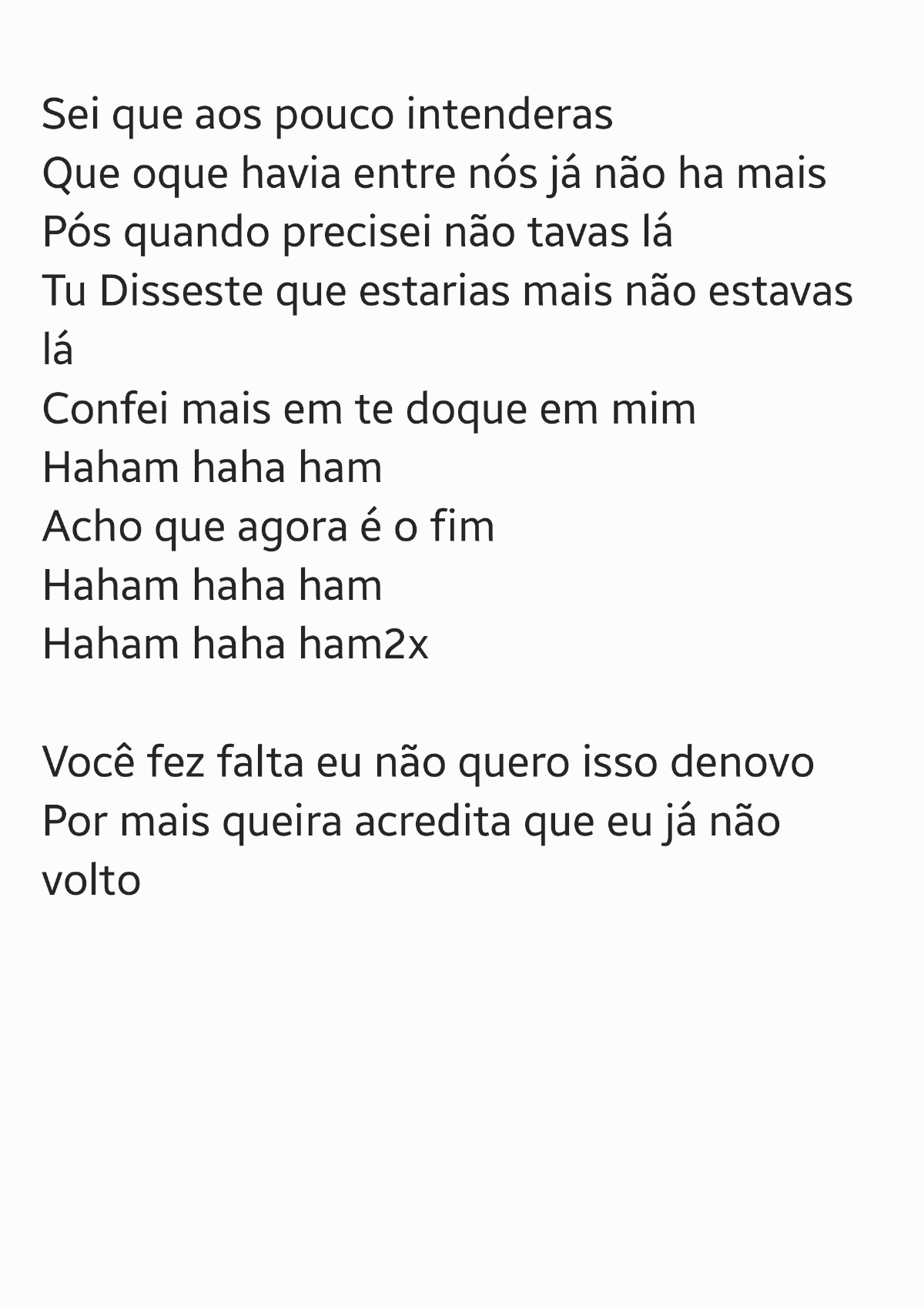 <p>Sei que aos pouco intenderas Que oque havia entre nós já não ha mais Pós quando precisei não tavas lá Tu Disseste que estarias mais não estavas lá Confei mais em te doque em mim Haham haha ham Acho que agora é o fim Haham haha ham Haham haha ham2x Você fez falta eu não quero isso denovo Por mais queira acredita que eu já não volto</p>