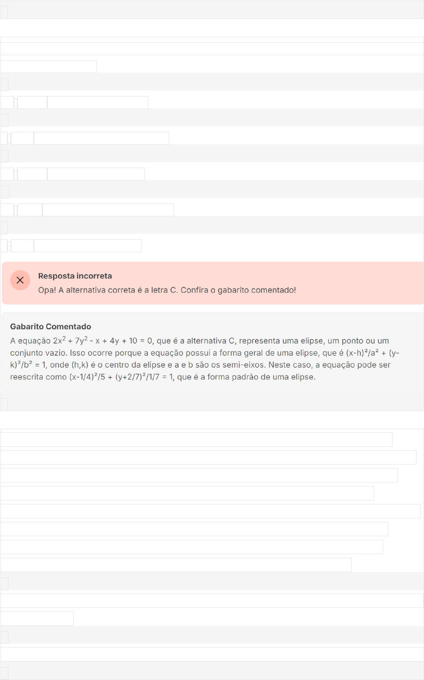 <p>1</p><p>Marcar para revisão</p><p>Marque a alternativa abaixo que representa a equação de uma elipse, um ponto ou conjunto vazio.</p><p>A</p><p>2x2 + 2y2 - 5x + 4y + 10 = 0</p><p>B</p><p>x2 + y2 + 2xy - 5x + 4y + 10 = 0</p><p>C</p><p>2x2 + 7y2 - x + 4y + 10 = 0.</p><p>D</p><p>2x2 - 4y2 + xy - 5x + 4y + 10 = 0.</p><p>E</p><p>x2 + y2 - 5x + 4y + 10 = 0.</p><p>2</p><p>Marcar para revisão</p><p>A geometria é uma ferramenta fundamental na engenharia civil, especialmente no projeto de estruturas arquitetônicas. Ao analisar a forma de uma cônica representada por uma equação do segundo grau com duas variáveis, é possível identificar características específicas. Uma dessas características está relacionada à existência do termo xy na equação. Qual das alternativas abaixo descreve corretamente a configuração das cônicas em relação aos eixos cartesianos quando o termo xy não está presente (b = 0)?</p><p>A</p><p>As cônicas têm seus eixos de simetria inclinados em relação aos eixos cartesianos.</p><p>B</p><p>As cônicas têm seus eixos de simetria paralelos aos eixos cartesianos.</p><p>C</p><p>As cônicas são retas.</p><p>D</p><p>As cônicas são elipses.</p><p>E</p><p>As cônicas são hipérboles.</p><p>3</p><p>Marcar para revisão</p><p>A geometria é amplamente utilizada na arquitetura e no design de interiores para criar espaços harmoniosos e visualmente agradáveis. Ao projetar uma sala de estar, o arquiteto precisa considerar diferentes formas geométricas, incluindo a hipérbole. Ao analisar a equação reduzida de uma hipérbole, é possível identificar seu tipo com base no sinal negativo presente na equação. Qual das alternativas abaixo descreve corretamente o tipo de hipérbole com base no sinal negativo antes da fração relacionada à variável y?</p><p>A</p><p>Hipérbole vertical.</p><p>B</p><p>Hipérbole horizontal.</p><p>C</p><p>Hipérbole simétrica.</p><p>D</p><p>Hipérbole ascendente.</p><p>E</p><p>Hipérbole descendente.</p><p>4</p><p>Marcar para revisão</p><p>Determine a equação das retas assíntotas da hipérbole vertical de centro em ( 2,2), excentricidade 2 e eixo imaginário valendo 6.</p><p>A</p><p>B</p><p>C</p><p>D</p><p>E</p><p>5</p><p>Marcar para revisão</p><p>Determine o lugar geométrico e a excentricidade da cônica representada pela equação (y−3)29−(x+2)216=1(y−3)29−(x+2)216=1(y−3)29−(x+2)216=1.</p><p>A</p><p>Hipérbole horizontal com excentricidade 53</p><p>B</p><p>Hipérbole vertical com excentricidade 53</p><p>C</p><p>Hipérbole horizontal com excentricidade 54</p><p>D</p><p>Hipérbole vertical com excentricidade 54</p><p>E</p><p>Elipse vertical com excentricidade 35</p><p>6</p><p>Marcar para revisão</p><p>Uma propriedade importante da parábola é que ela é a trajetória descrita por um objeto em lançamento oblíquo quando a resistência do ar é desprezada, como o arremesso de uma bola de basquete, por exemplo. Qual das alternativas abaixo define corretamente a propriedade geométrica da parábola relacionada à sua equação?</p><p>A</p><p>A parábola é uma curva formada por uma reta geratriz e um vértice.</p><p>B</p><p>A parábola é uma curva formada por dois vértices e uma reta geratriz.</p><p>C</p><p>A parábola é uma curva formada por uma reta geratriz e um foco.</p><p>D</p><p>A parábola é uma curva formada por um foco e uma diretriz.</p><p>E</p><p>A parábola é uma curva formada por um ponto de inflexão e uma reta tangente.</p><p>7</p><p>Marcar para revisão</p><p>Marque a alternativa abaixo que representa a equação de uma hipérbole ou duas retas concorrentes.</p><p>A</p><p>2x2 + 2y2 - 4xy - 4y + 10 = 0.</p><p>B</p><p>x2 + y2 - 5x + 4y + 10 = 0.</p><p>C</p><p>2x2 + y2 - 5x + 4y + 10 = 0.</p><p>D</p><p>2x2 + y2 + xy - 5x + 4y + 10 = 0.</p><p>E</p><p>2x2 - y2 - 4xy - 5x + 4y + 10 = 0.</p><p>image7.png</p><p>image1.png</p><p>image2.png</p><p>image3.png</p><p>image4.png</p><p>image5.png</p><p>image6.png</p>