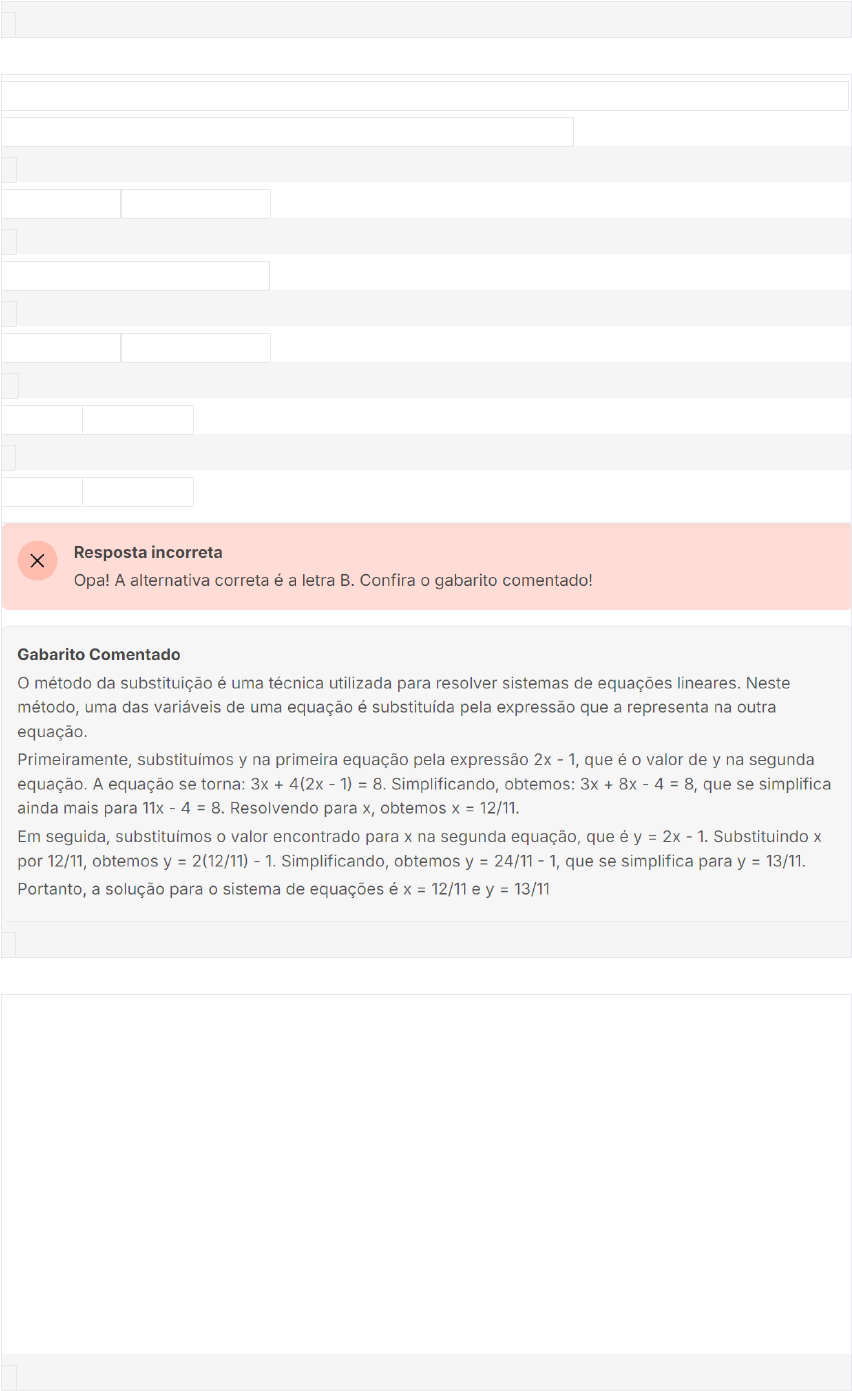 <p>1</p><p>Marcar para revisão</p><p>Dadas as equações lineares 3x + 4y = 8 e y = 2x - 1, utilize o método da substituição para encontrar o valor de x e y.</p><p>A</p><p>x = 11/10 e y = 13/11</p><p>B</p><p>x = 12/11 e y = 13/11</p><p>C</p><p>x = 14/10 e y = 11/12</p><p>D</p><p>x = 14 e y = 11</p><p>E</p><p>x = 12 e y = 13</p><p>2</p><p>Marcar para revisão</p><p>Em um laboratório de física, um grupo de estudantes está realizando experimentos para coletar dados e determinar relações lineares entre diferentes variáveis. Durante a análise dos resultados, eles se deparam com a necessidade de resolver sistemas lineares para encontrar os coeficientes das equações. Nesse contexto, discutem as vantagens e desvantagens da regra de Cramer em relação ao método Gauss-Jordan.</p><p>Considerando as características da regra de Cramer e sua relação com o método Gauss-Jordan, qual é uma desvantagem específica da regra de Cramer para a resolução de sistemas lineares?</p><p>A</p><p>A regra de Cramer garante uma solução única para qualquer sistema linear.</p><p>B</p><p>A regra de Cramer é menos suscetível a erros de arredondamento durante o processo de cálculo.</p><p>C</p><p>A regra de Cramer resolve o sistema diretamente por um quociente de determinantes.</p><p>D</p><p>A regra de Cramer é mais eficiente em termos de tempo de execução para sistemas com muitas incógnitas.</p><p>E</p><p>A regra de Cramer normalmente requer o cálculo de todos os determinantes necessários, o que pode ser trabalhoso.</p><p>3</p><p>Marcar para revisão</p><p>Um grupo de arquitetos está projetando um complexo residencial em uma área urbana. Eles estão analisando as posições relativas de diferentes blocos de apartamentos para garantir que não haja superposição ou espaços vazios indesejados. Para isso, eles utilizam sistemas de equações lineares com três variáveis para representar os planos de cada bloco.</p><p>Sobre a analogia entre a solução de sistemas de três variáveis e a posição relativa de planos na geometria analítica, assinale a alternativa correta:</p><p>A</p><p>Um sistema possível e determinado corresponde à situação em que os planos dos blocos de apartamentos se interceptam em um único ponto, garantindo uma posição precisa para cada bloco.</p><p>B</p><p>Um sistema possível e determinado corresponde à situação em que os planos dos blocos de apartamentos são paralelos e não se interceptam, resultando em uma distribuição desejada dos espaços.</p><p>C</p><p>Um sistema possível e indeterminado corresponde à situação em que os planos dos blocos de apartamentos se interceptam em uma reta comum, permitindo diferentes combinações de posicionamento dos blocos.</p><p>D</p><p>Um sistema possível e indeterminado corresponde à situação em que os planos dos blocos de apartamentos não têm pontos de interseção, resultando em um projeto arquitetônico impossível de ser concretizado.</p><p>E</p><p>Um sistema impossível corresponde à situação em que os planos dos blocos de apartamentos se interceptam em diferentes pontos, gerando sobreposições indesejadas e inviabilizando a construção do complexo residencial.</p><p>4</p><p>Marcar para revisão</p><p>(AGIRH/2022 - Adaptado) A representação gráfica de um sistema de 1º grau, cujo resultado é possível e indeterminado é dado por:</p><p>A</p><p>Duas retas concorrentes.</p><p>B</p><p>Duas retas paralelas.</p><p>C</p><p>Duas retas sobrepostas.</p><p>D</p><p>Duas retas perpendiculares ortogonais.</p><p>E</p><p>Duas retas ortogonais em R3.</p><p>5</p><p>Marcar para revisão</p><p>Uma empresa de produção de alimentos está analisando seu estoque de ingredientes para garantir a eficiência na produção. Para isso, eles precisam resolver um sistema de equações lineares para determinar a quantidade necessária de cada ingrediente em diferentes receitas.</p><p>Sobre a definição e classificação do sistema de equações lineares, assinale a alternativa correta:</p><p>A</p><p>Um sistema de equações lineares é um conjunto de equações onde todas as incógnitas têm expoentes iguais a 1 e representam retas no plano cartesiano.</p><p>B</p><p>Um sistema de equações lineares é um conjunto de equações onde as incógnitas são elevadas a diferentes potências e representam curvas no plano cartesiano.</p><p>C</p><p>Um sistema de equações lineares é um conjunto de equações onde as incógnitas são elevadas a potências maiores que 1 e representam parábolas no plano cartesiano.</p><p>D</p><p>Um sistema de equações lineares é um conjunto de equações onde as incógnitas são lineares, ou seja, elevadas a expoentes iguais a 1 e representam retas no plano cartesiano.</p><p>E</p><p>Um sistema de equações lineares é um conjunto de equações onde todas as incógnitas são constantes e representam pontos no plano cartesiano.</p><p>6</p><p>Marcar para revisão</p><p>Considere o seguinte sistema de equações lineares:</p><p>⎧⎪⎨⎪⎩−3x+2y−z=04x−y+2z=0x−3y+4z=0{−3x+2y−z=04x−y+2z=0x−3y+4z=0</p><p>Com base nas informações apresentadas, é correto afirmar que esse sistema é:</p><p>A</p><p>Um sistema linear homogêneo.</p><p>B</p><p>Um sistema linear não homogêneo.</p><p>C</p><p>Um sistema linear impossível.</p><p>D</p><p>Um sistema linear possível e indeterminado.</p><p>E</p><p>Um sistema linear possível e determinado.</p><p>7</p><p>Marcar para revisão</p><p>Determine os autovalores do sistema linear de equações {8x−2y=02y+4x=3{8x−2y=02y+4x=3</p><p>A</p><p>2 e 6</p><p>B</p><p>4 e 5</p><p>C</p><p>1/4 e 1</p><p>D</p><p>1 e 4</p><p>E</p><p>3 e 7</p><p>8</p><p>Marcar para revisão</p><p>Obtenha a imagem do vetor (3, 4) em relação à transformação linear definida por T:R2 →→ R2 tal que T(x,y) = (2x - y, x + y).</p><p>A</p><p>(3, 4)</p><p>B</p><p>(1, 2)</p><p>C</p><p>(2, 7)</p><p>D</p><p>(7, 2)</p><p>E</p><p>(3, 8)</p><p>9</p><p>Marcar para revisão</p><p>E