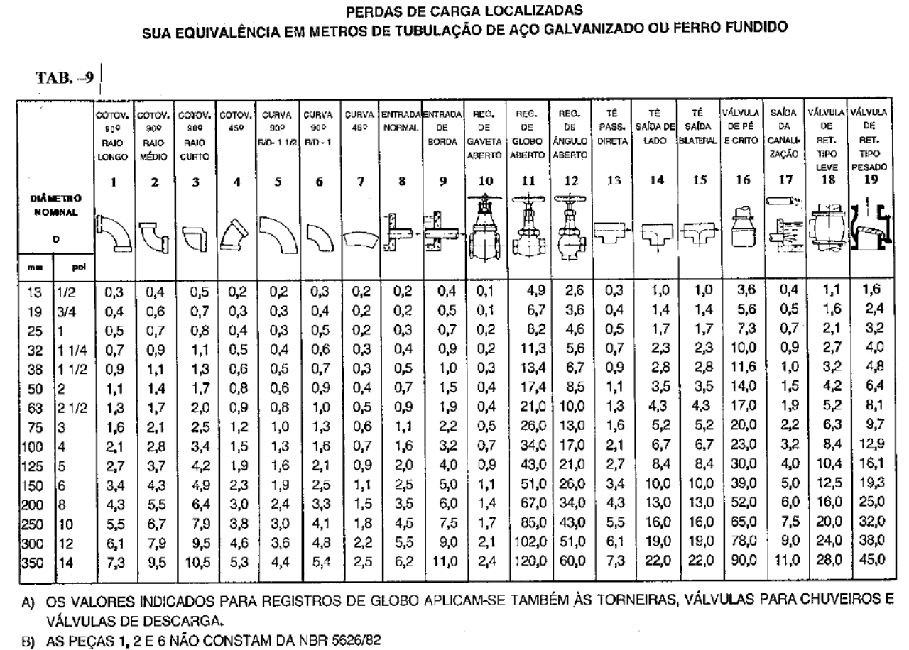 <p>PERDAS DE CARGA LOCALIZADAS SUA EQUIVALÊNCIA EM METROS DE TUBULAÇÃO DE AÇO GALVANIZADO FERRO FUNDIDO TAB. -9 COTOV. COTOV. CURVA CURVA CURVA ENTRADA ENTRADA REG. REG. REG. TÉ TÉ TÉ VÁLVULA SAÍDA VÁLVULA VÁLVULA 900 900 450 900 450 NORMAL DE DE DE DE PASS. SAÍDA DE SAÍDA DE PÉ DA DE DE RAIO RAIO RAIO BORDA GAVETA GLOBO DIRETA LADO E CRITO RET. RET. LONGO MÉDIO CURTO ABERTO ABERTO ABERTO ZAÇÃO TIPO TIPO LEVE PESADO 1 2 3 4 5 6 7 8 9 10 11 12 13 14 15 16 17 18 19 D pol 13 1/2 0,3 0,4 0,5 0,2 0,2 0,3 0,2 0,2 0,4 0,1 4,9 2,6 0,3 1,0 1,0 3,6 0,4 1,1 1,6 19 3/4 0,4 0,6 0,7 0,3 0,3 0,4 0,2 0,2 0,5 0,1 6,7 3,6 0,4 1,4 1,4 5,6 0,5 1,6 2,4 25 1 0,5 0,7 0,8 0,4 0,3 0,5 0,2 0,3 0,7 0,2 8,2 4,6 0,5 1,7 1,7 7,3 0,7 2,1 3,2 32 1 1/4 0,7 0,9 1,1 0,5 0,4 0,6 0,3 0,4 0,9 0,2 11,3 5,6 0,7 2,3 2,3 10,0 0,9 2,7 4,0 38 1 1/2 0,9 1,1 1,3 0,6 0,5 0,7 0,3 0,5 1,0 0,3 13,4 6,7 0,9 2,8 2,8 11,6 1,0 3,2 4,8 50 2 1,1 1,4 1,7 0,8 0,6 0,9 0,4 0,7 1,5 0,4 17,4 8,5 1,1 3,5 3,5 14,0 1,5 4,2 6,4 63 1,3 1,7 2,0 0,9 0,8 1,0 0,5 0,9 1,9 0,4 21,0 10,0 1,3 4,3 4,3 17,0 1,9 5,2 8,1 75 3 1,6 2,1 2,5 1,2 1,0 1,3 0,6 1,1 2,2 0,5 26,0 13,0 1,6 5,2 5,2 20,0 2,2 6,3 9,7 100 4 2,1 2,8 3,4 1,5 1,3 1,6 0,7 1,6 3,2 0,7 34,0 17,0 2,1 6,7 6,7 23,0 3,2 8,4 12,9 125 5 2,7 3,7 4,2 1,9 1,6 2,1 0,9 2,0 4,0 0,9 43,0 21,0 2,7 8,4 8,4 30,0 4,0 10,4 16,1 150 6 3,4 4,3 4,9 2,3 1,9 2,5 1,1 2,5 5,0 1,1 51,0 26,0 3,4 10,0 10,0 39,0 5,0 12,5 19,3 200 8 4,3 5,5 6,4 3,0 2,4 3,3 1,5 3,5 6,0 1,4 67,0 34,0 4,3 13,0 13,0 52,0 6,0 16,0 25,0 250 10 5,5 6,7 7,9 3,8 3,0 4,1 1,8 4,5 7,5 1,7 85,0 43,0 5,5 16,0 16,0 65,0 7,5 20,0 32,0 300 12 6,1 7,9 9,5 4,6 3,6 4,8 2,2 5,5 9,0 2,1 102,0 51,0 6,1 19,0 19,0 78,0 9,0 24,0 38,0 350 14 7,3 9,5 10,5 5,3 4,4 5,4 2,5 6,2 11,0 2,4 120,0 60,0 7,3 22,0 22,0 90,0 11,0 28,0 45,0 A) os VALORES INDICADOS PARA REGISTROS DE GLOBO APLICAM-SE TAMBÉM ÀS TORNEIRAS, VÁLVULAS PARA CHUVEIROS E VÁLVULAS DE DESCARGA. B) AS PEÇAS E 6 NÃO CONSTAM DA NBR 5626/82</p>