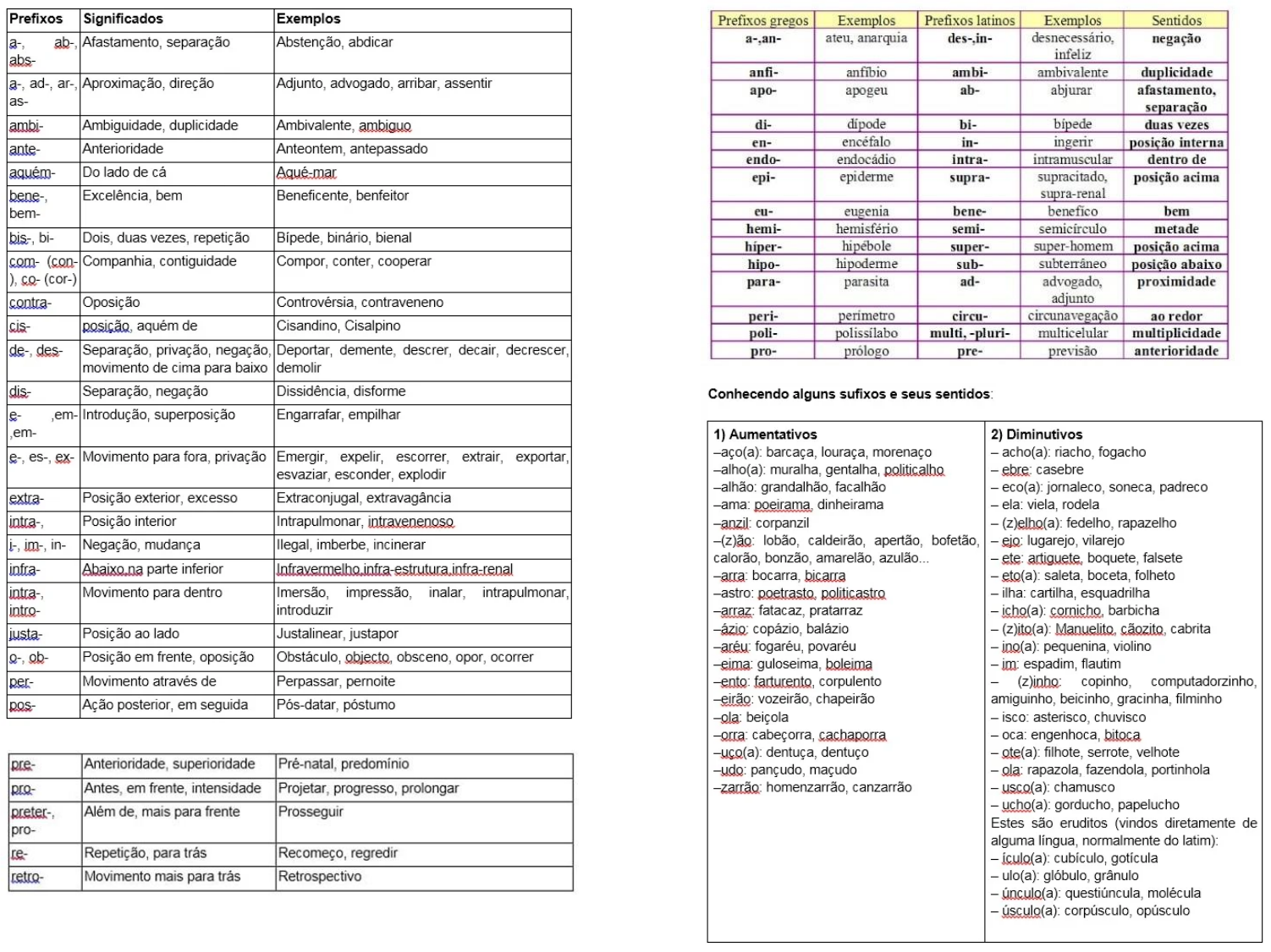 <p>Prefixos Significados Exemplos Prefixos gregos Exemplos Prefixos latinos Exemplos Sentidos a-, Afastamento, separação Abstenção, abdicar a-an- ateu, anarquia des-,in- desnecessário, negação abs- infeliz anfi- ambi- ambivalente duplicidade a-, ad-, Aproximação, direção Adjunto, advogado, arribar, assentir apo- apogeu ab- abjurar afastamento, as- separação ambi- Ambiguidade, duplicidade Ambivalente, ambiguo di- dípode bi- bipede duas vezes ante- Anterioridade en- encéfalo Anteontem, antepassado in- ingerir posição interna endo- endocádio intra- intramuscular dentro de aquém- Do lado de cá epi- epiderme supra- supracitado, posição acima bene-, Excelência, bem Beneficente, benfeitor supra-renal bem- eu- eugenia bene- benefico bem hemi- hemisfério semi- semicírculo metade bis-, bi- Dois, duas vezes, repetição Bípede, binário, bienal hipébole super- super-homem posição acima com- (con- Companhia, contiguidade Compor, conter, cooperar hipo- hipoderme sub- subterrâneo posição abaixo ), (cor-) para- parasita ad- advogado, proximidade contra- Oposição Controvérsia, contraveneno adjunto peri- perimetro circu- circunavegação ao redor cis- aquém de Cisandino, Cisalpino poli- multi, -pluri- multicelular multiplicidade des- privação, negação, Deportar, demente, descrer, decair, decrescer, pro- prólogo pre- previsão anterioridade movimento de cima para baixo demolir dis- negação Dissidência, disforme Conhecendo alguns sufixos e seus sentidos: e- em- Introdução, superposição Engarrafar, empilhar em- 1) Aumentativos 2) Diminutivos e-, es-, ex- Movimento para fora, privação Emergir, expelir, escorrer, extrair, exportar, -aço(a): barcaça, louraça, morenaço - acho(a): riacho, fogacho esvaziar, esconder, explodir -alho(a): muralha, gentalha, politicalho ebre: casebre -alhão: grandalhão, facalhão - eco(a): jornaleco, soneca, padreco extra- Posição exterior, excesso Extraconjugal, extravagância -ama: poeirama, dinheirama - ela: viela, rodela Posição interior Intrapulmonar, intravenenoso -anzil: corpanzil - (z)elho(a): fedelho, rapazelho i-, im-, in- Negação, mudança llegal, imberbe, incinerar -(z)ão: lobão, caldeirão, apertão, bofetão, - ejo: lugarejo, vilarejo calorão, bonzão, amarelão, - ete: boquete, falsete infra- Abaixo na parte inferior Infravermelho infra estrutura infra-renal -arra: bocarra, bicarra - eto(a): saleta, boceta, folheto intra-, Movimento para dentro Imersão, impressão, inalar, intrapulmonar, -astro: politicastro - ilha: cartilha, esquadrilha intro- introduzir fatacaz, pratarraz - icho(a): cornicho, barbicha justa- Posição ao lado Justalinear, justapor copázio, balázio - (z)ito(a): cabrita fogaréu, povaréu ino(a): pequenina, violino Q-, ob- Posição em frente, oposição objecto, obsceno, opor, ocorrer -eima: guloseima, boleima - im: espadim, flautim per- Movimento através de Perpassar, pernoite -ento: corpulento - (z)inho: copinho, computadorzinho, pos- Ação posterior, em seguida Pós-datar, póstumo -eirão: vozeirão, chapeirão amiguinho, beicinho, gracinha, filminho -ola: beiçola - isco: asterisco, chuvisco -orra: cabeçorra, cachaporra - oca: engenhoca, bitoca -uco(a): dentuça, dentuço - ote(a): filhote, serrote, velhote pre- Anterioridade, superioridade Pré-natal, predomínio -udo: pançudo, maçudo - ola: rapazola, fazendola, portinhola pro- Antes, em frente, intensidade Projetar, progresso, prolongar -zarrão: canzarrão - usco(a): chamusco preter-, Além de, mais para frente Prosseguir - ucho(a): gorducho, papelucho pro- Estes são eruditos (vindos diretamente de alguma língua, normalmente do latim): re- Repetição, para trás Recomeço, regredir - ículo(a): cubículo, retro- Movimento mais para trás Retrospectivo - ulo(a): glóbulo, grânulo - molécula - úsculo(a): corpúsculo, opúsculo</p>