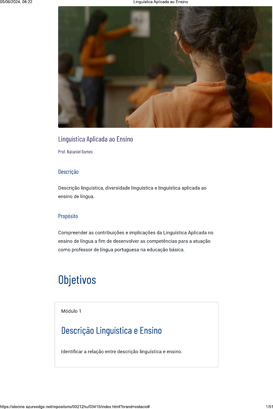 <p>Linguística Aplicada ao Ensino Prof. Nataniel Gomes Descrição Descrição linguística, diversidade linguística e linguística aplicada ao ensino de língua. Propósito Compreender as contribuições e implicações da Linguística Aplicada no ensino de língua a fim de desenvolver as competências para a atuação como professor de língua portuguesa na educação básica. Objetivos Módulo 1 Descrição Linguística e Ensino Identificar a relação entre descrição linguística e ensino. 1/51</p><p>05/06/2024, 08:22 Linguística Aplicada ao Ensino Módulo 2 0 Professor e a Diversidade Linguística Identificar as implicações da diversidade linguística em sala de aula. Módulo 3 Linguística Aplicada ao Ensino de Leitura e Escrita Identificar as contribuições da Linguística Aplicada para o ensino de leitura e escrita. 2/51</p><p>05/06/2024, 08:22 Linguística Aplicada ao Ensino Introdução A Linguística Aplicada, como uma subárea da Linguística, tem feito diferença nos estudos da língua em situações reais de uso, incluindo aspectos relacionados com identidade, valores e crenças, entre outros. Desde seu surgimento, a Linguística Aplicada também traz seus aportes teóricos para o tema do ensino de língua. A contribuição da Linguística Aplicada ao ensino-aprendizagem de língua pode ser reconhecida em diferentes elaborações teóricas, propostas metodológicas e até mesmo por meio de críticas a procedimentos tradicionais e equivocados de se abordar a língua. Assim, é muito importante conhecer as contribuições da Linguística Aplicada para as questões relacionadas com o ensino de língua, seja a língua materna (L1) ou uma língua estrangeira (L2). Tudo isso, afinal, pode ajudar a escola a se transformar em um espaço mais motivador, inclusivo e democrático de aprendizagem da língua, tornando a sala de aula uma experiência voltada para a cidadania exercida por meio da linguagem. Material para download Clique no botão abaixo para fazer o download do conteúdo completo em formato PDF. Download material 3/51</p><p>05/06/2024, 08:22 Linguística Aplicada ao Ensino 1 - Descrição Linguística e Ensino Ao final deste módulo, você será capaz de identificar a relação entre descrição linguística e ensino. Teoria e prática nos estudos linguísticos Linguística e a Relação Teoria-Prática Para começar nossa discussão sobre a relação entre descrição linguística e ensino, é preciso, primeiramente, chamar sua atenção para a falsa dicotomia entre a linguística e a prática cotidiana. Muitos estudantes acabam tendo a impressão de que as elaborações teóricas da linguística se opõem à prática, às situações reais e às necessidades do uso da língua. Por isso, é preciso reconhecer que os estudos linguísticos partem da prática e voltam para a prática. professor e linguista indiano Kanavillil Rajagopalan é bastante enfático ao comentar essa situação de separação entre os estudos linguísticos e a prática ou uso da língua. Eu acho que a maior desgraça que poderia ter acontecido com a nossa disciplina, e qualquer outra, é a 4/51</p><p>05/06/2024, 08:22 Linguística Aplicada ao Ensino divisão de bolo entre teoria e prática. Foi um desastre, é um desastre! Eu me recuso a aceitar essa distinção simplesmente! Um teórico que não pensa na prática é um teórico (RAJAGOPALAN, 2003, p. 180) A linguística pode ter inúmeros desdobramentos para a educação, indo da qualificação profissional até o ensino propriamente dito, servindo como recurso importante para se trabalhar a interação, a comunicação e a expressão em diversas áreas. Cada área da linguística tem uma abordagem bastante específica para o fenômeno da linguagem. Todas elas têm dado a sua contribuição para investigação da linguagem, cada uma a seu modo. É preciso estarmos cientes de que o professor, ao fazer a opção por uma certa corrente teórica, o que inclui uma metodologia específica, uma abordagem particular e um objeto a ser descortinado, acaba assumindo uma determinada perspectiva teórico-metodológica que pode ser misturar também a crenças e valores que o professor carrega consigo. Se alguém adota uma Já quem tem uma perspectiva da língua a análise da língua a partir do linguista suíço partir do linguista norte- Ferdinand de Saussure, X americano Noam de viés estruturalista, Chomsky, teórico da assumirá uma visão gerativista, abordagem que prevê entenderá que a que a língua é um gramática é inata e sistema. marcada por princípios e parâmetros. Outra abordagem poderia ser feita a partir do linguista russo Roman Jakobson, teórico formalista, que via a língua como um sistema que tem 5/51</p><p>05/06/2024, 08:22 Linguística Aplicada ao Ensino propósito comunicativo e estruturado a partir dos Seis elementos da comunicação, com os respectivos enfoques nas funções emotiva, conativa, metalinguística, poética, fática e referencial da linguagem. Seis elementos da comunicação Emissor, receptor, código, mensagem, canal e contexto. Ao adotarmos uma abordagem do linguista norte-americano William Labov, da sociolinguística variacionista, assumiremos que a língua é marcada por fatores sociais, como classe social, escolaridade, sexo, idade, que revelam a diversidade linguística exercida pelos falantes dentro da comunidade. o linguista William Labov. Vamos considerar um pouco mais a última abordagem que mencionamos, o enfoque sociolinguístico com ênfase na variação linguística. A abordagem da sociolinguística A perspectiva da sociolinguística ainda é muito recorrente nas salas de aula e relaciona as variantes linguísticas com elementos sociais que rodeiam os falantes. Esse tipo de abordagem no ensino de língua materna ajudou a diminuir o preconceito em relação ao uso de variantes linguísticas, afinal, todas as manifestações apresentam uma motivação e uma justificativa a partir do contexto social em