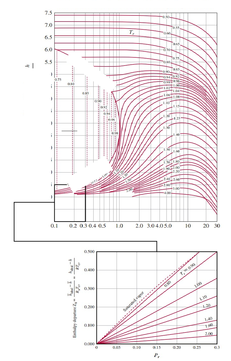 <p>Disciplina: Termodinâmica dos Materiais</p><p>Identificação da tarefa: Tarefa 3. Unidade 3. Envio de Arquivo.</p><p>Pontuação: 10 pontos</p><p>TAREFA 3</p><p>. Pressão reduzida</p><p>Líquido saturado</p><p>Gás saturado</p><p>Diferença de Entalpia</p><p>Fonte: http://eon.sdsu.edu/testhome/Test/solve/basics/tables/tablesRG/hNO.html</p><p>Voltemos ao exemplo do Capítulo 7. Imagine um processo de estrangulamento (por exemplo, por uma válvula de estrangulamento) em que o gás metano passa de 2 MPa para 0,92 MPa na temperatura de 25°C sem troca de calor (adiabático) e em regime permanente. Determine a temperatura final do metano</p><p>De acordo com a primeira lei, assumindo como desprezíveis a energia cinética e potencial, sendo interações de calor e trabalho nulos, teremos em que e sendo o termo desconhecido. Para podermos utilizar as coordenadas generalizadas precisamos de obter os seguinte valores tabelados e fixos do metano:</p><p>·</p><p>·</p><p>·</p><p>·</p><p>E com esses valores podemos determinar a temperatura e pressão reduzida:</p><p>Por outro lado, expandido a entalpia teremos:</p><p>em que o termo é função de e , é a integral do calor específico de até enquanto o último termo é função de e . Embora a única incógnita seja (ou equivalentemente ), a solução deve ser encontrada por métodos de tentativa e erro iterativos.</p><p>A solução será mostrada considerando que o estado da saíde é não saturado e que o calor específico do gás é constante. Da Figura dada para e :</p><p>Assim, podemos escrever a equação final como:</p><p>Aonde</p><p>Que pode ser resolvida iterativamente por meio de “chutes” no valor de que zerem essa equação. Determine .</p><p>image5.png</p><p>image6.png</p><p>image1.png</p><p>image2.png</p><p>image3.png</p><p>image4.png</p>