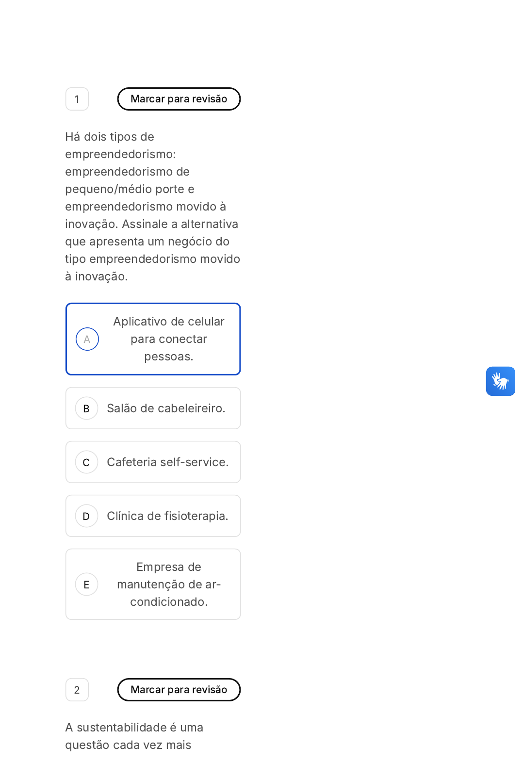 <p>A</p><p>B</p><p>C</p><p>D</p><p>E</p><p>1 Marcar para revisão</p><p>Há dois tipos de</p><p>empreendedorismo:</p><p>empreendedorismo de</p><p>pequeno/médio porte e</p><p>empreendedorismo movido à</p><p>inovação. Assinale a alternativa</p><p>que apresenta um negócio do</p><p>tipo empreendedorismo movido</p><p>à inovação.</p><p>Aplicativo de celular</p><p>para conectar</p><p>pessoas.</p><p>Salão de cabeleireiro.</p><p>Cafeteria self-service.</p><p>Clínica de fisioterapia.</p><p>Empresa de</p><p>manutenção de ar-</p><p>condicionado.</p><p>2 Marcar para revisão</p><p>A sustentabilidade é uma</p><p>questão cada vez mais</p><p>A</p><p>B</p><p>C</p><p>D</p><p>E</p><p>importante para as empresas.</p><p>Além de ser uma forma de</p><p>contribuir para um futuro</p><p>melhor para o planeta e as</p><p>pessoas, também pode trazer</p><p>benefícios financeiros e de</p><p>reputação para as</p><p>organizações. Nesse contexto,</p><p>qual é o objetivo principal das</p><p>ações de sustentabilidade nas</p><p>empresas?</p><p>Maximizar a geração</p><p>de resíduos.</p><p>Aumentar o uso de</p><p>recursos naturais.</p><p>Minimizar a geração</p><p>de resíduos e o uso</p><p>de recursos naturais.</p><p>Apenas medir o</p><p>impacto da empresa</p><p>na comunidade local e</p><p>no meio ambiente.</p><p>Ignorar</p><p>completamente as</p><p>questões sociais e</p><p>ambientais.</p><p>3 Marcar para revisão</p><p>Pesquisas mostram que para</p><p>inovação o trabalho em equipe</p><p>A</p><p>B</p><p>C</p><p>D</p><p>E</p><p>é mais proveitoso. Apesar</p><p>disso, essa forma de trabalho</p><p>também possui desvantagens.</p><p>Assinale a alternativa que</p><p>indica uma desvantagem do</p><p>trabalho em equipe.</p><p>Pressão para o</p><p>consenso pode limitar</p><p>a qualidade das</p><p>soluções.</p><p>O desenvolvimento do</p><p>grupo aumenta a</p><p>coesão e o espírito de</p><p>companheirismo entre</p><p>as pessoas</p><p>integrantes da equipe.</p><p>O envolvimento na</p><p>solução de problemas</p><p>aumenta a</p><p>identificação com os</p><p>resultados.</p><p>A interação aumenta a</p><p>quantidade de</p><p>soluções levantadas.</p><p>Mais pessoas</p><p>envolvidas trazem</p><p>mais informações</p><p>para o processo de</p><p>solucionar problemas.</p><p>A</p><p>B</p><p>C</p><p>4 Marcar para revisão</p><p>Sobre o consentimento dos</p><p>praticantes em pesquisas de</p><p>mercado, é correto afirmar que:</p><p>É opcional no caso de</p><p>estudos de mercado</p><p>porque não tem</p><p>objetivos científicos.</p><p>É um diálogo de</p><p>perguntas e respostas</p><p>abertas entre o</p><p>entrevistador e a</p><p>pessoa entrevistada.</p><p>Aproxima-se mais de</p><p>uma conversa</p><p>informal que evolui</p><p>conforme a interação</p><p>do entrevistador e do</p><p>entrevistado.</p><p>D</p><p>E</p><p>São reuniões de</p><p>consumidores ou</p><p>pessoas do público-</p><p>alvo que a empresa</p><p>deseja captar como</p><p>consumidores.</p><p>É quando o</p><p>participante da</p><p>pesquisa concorda</p><p>com o uso de seus</p><p>dados pessoais e</p><p>suas respostas para a</p><p>elaboração de um</p><p>estudo.</p><p>5 Marcar para revisão</p><p>O licenciamento ambiental</p><p>funciona como uma ferramenta</p><p>de gestão pública para garantir</p><p>o controle das ações humanas</p><p>sobre o meio ambiente. Ele</p><p>inclui a autorização da</p><p>localização, instalação e</p><p>operação de atividades de uma</p><p>empresa, por meio das licenças</p><p>prévia, de instalação e de</p><p>operação. Qual é a importância</p><p>do licenciamento ambiental</p><p>para as empresas?</p><p>A</p><p>B</p><p>C</p><p>O licenciamento</p><p>ambiental é</p><p>imprescindível para</p><p>todo e qualquer tipo</p><p>de empresa,</p><p>independentemente</p><p>do ramo de atuação.</p><p>Apenas empresas de</p><p>grande porte</p><p>precisam de</p><p>licenciamento</p><p>ambiental.</p><p>O licenciamento</p><p>ambiental é</p><p>importante apenas</p><p>para empresas</p><p>localizadas em áreas</p><p>de preservação</p><p>ambiental.</p><p>--</p><p>hora</p><p>: --</p><p>min</p><p>: --</p><p>seg</p><p>Exibir</p><p>Questão 10 de 10</p><p>Respondidas �10� Em branco �0�</p><p>Finalizar prova</p><p>1 2 3 4 5</p><p>6 7 8 9 10</p><p>Prova AV Inovação e Empreendedorismo</p><p>D</p><p>E</p><p>A</p><p>B</p><p>O licenciamento</p><p>ambiental é</p><p>fundamental para</p><p>empresas que</p><p>desejam instalar,</p><p>ampliar ou operar</p><p>atividades que</p><p>possam causar</p><p>impactos no meio</p><p>ambiente.</p><p>O licenciamento</p><p>ambiental é</p><p>importante apenas</p><p>para empresas que</p><p>atuam no setor</p><p>industrial.</p><p>6 Marcar para revisão</p><p>O Mix de Marketing é uma</p><p>ferramenta fundamental para</p><p>estruturar a oferta de uma</p><p>empresa ao mercado,</p><p>englobando diversos</p><p>componentes que devem ser</p><p>cuidadosamente geridos para</p><p>atingir os objetivos de</p><p>marketing. Qual dos elementos</p><p>a seguir faz parte do Mix de</p><p>Marketing �4 Ps)?</p><p>Segmentação</p><p>Posicionamento</p><p>C</p><p>D</p><p>E</p><p>A</p><p>B</p><p>C</p><p>Produto</p><p>Métricas e Avaliação</p><p>Experiência do Cliente</p><p>7 Marcar para revisão</p><p>Considerando os tipos de</p><p>inovação, assinale a alternativa</p><p>correta:</p><p>Um modelo de</p><p>negócios é a forma</p><p>que uma empresa</p><p>consegue obter</p><p>receitas e ter sua</p><p>viabilidade como</p><p>negócio.</p><p>Um modelo de</p><p>negócios é o novo</p><p>posicionamento de</p><p>mercado de um</p><p>produto ou serviço já</p><p>estabelecido.</p><p>Um modelo de</p><p>negócios é uma ação</p><p>direcionada a resolver</p><p>ou enfrentar</p><p>problemas da</p><p>sociedade.</p><p>D</p><p>E</p><p>Um modelo de</p><p>negócios é uma</p><p>inovação que</p><p>transforma</p><p>radicalmente um</p><p>mercado substituindo</p><p>seus competidores</p><p>por uma solução mais</p><p>acessível,