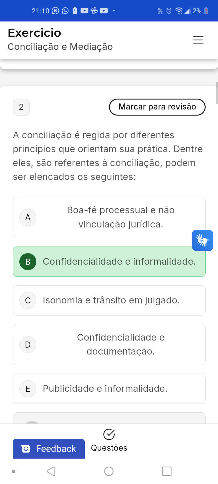 <p>Vo LTE L 2% ! Exercicio Conciliação e Mediação 2 Marcar para revisão A conciliação é regida por diferentes princípios que orientam sua prática. Dentre eles, são referentes à conciliação, podem ser elencados os seguintes: Boa-fé processual e não A vinculação jurídica. Confidencialidade e informalidade. C Isonomia e trânsito em julgado. Confidencialidade e D documentação. E Publicidade e informalidade. Feedback Questões</p>