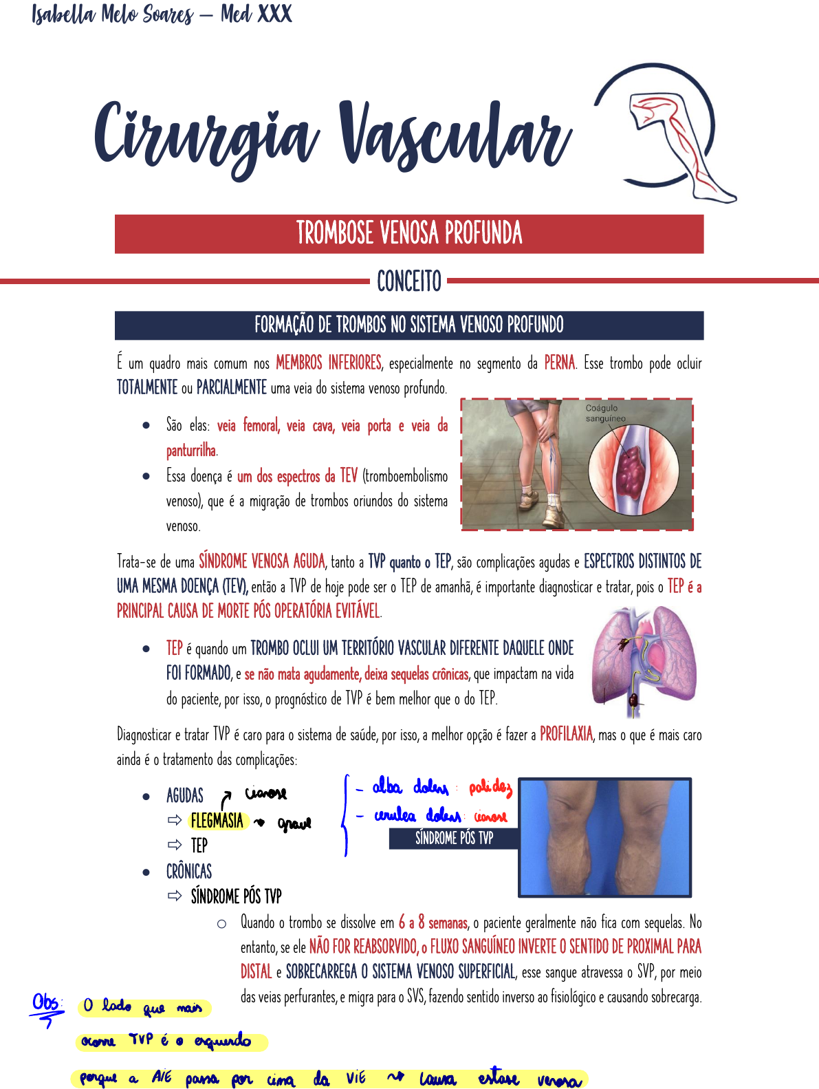 <p>Isabella Melo Soares – Med XXX</p><p>TROMBOSE VENOSA PROFUNDA</p><p>CONCEITO</p><p>FORMAÇÃO DE TROMBOS NO SISTEMA VENOSO PROFUNDO</p><p>É um quadro mais comum nos MEMBROS INFERIORES, especialmente no segmento da PERNA. Esse trombo pode ocluir</p><p>TOTALMENTE ou PARCIALMENTE uma veia do sistema venoso profundo.</p><p>x São elas: veia femoral, veia cava, veia porta e veia da</p><p>panturrilha.</p><p>x Essa doença é um dos espectros da TEV (tromboembolismo</p><p>venoso), que é a migração de trombos oriundos do sistema</p><p>venoso.</p><p>Trata-se de uma SÍNDROME VENOSA AGUDA, tanto a TVP quanto o TEP, são complicações agudas e ESPECTROS DISTINTOS DE</p><p>UMA MESMA DOENÇA (TEV), então a TVP de hoje pode ser o TEP de amanhã, é importante diagnosticar e tratar, pois o TEP é a</p><p>PRINCIPAL CAUSA DE MORTE PÓS OPERATÓRIA EVITÁVEL.</p><p>x TEP é quando um TROMBO OCLUI UM TERRITÓRIO VASCULAR DIFERENTE DAQUELE ONDE</p><p>FOI FORMADO, e se não mata agudamente, deixa sequelas crônicas, que impactam na vida</p><p>do paciente, por isso, o prognóstico de TVP é bem melhor que o do TEP.</p><p>Diagnosticar e tratar TVP é caro para o sistema de saúde, por isso, a melhor opção é fazer a PROFILAXIA, mas o que é mais caro</p><p>ainda é o tratamento das complicações:</p><p>x AGUDAS</p><p>Ö FLEGMASIA</p><p>Ö TEP</p><p>x CRÔNICAS</p><p>Ö SÍNDROME PÓS TVP</p><p>o Quando o trombo se dissolve em 6 a 8 semanas, o paciente geralmente não fica com sequelas. No</p><p>entanto, se ele NÃO FOR REABSORVIDO, o FLUXO SANGUÍNEO INVERTE O SENTIDO DE PROXIMAL PARA</p><p>DISTAL e SOBRECARREGA O SISTEMA VENOSO SUPERFICIAL, esse sangue atravessa o SVP, por meio</p><p>das veias perfurantes, e migra para o SVS, fazendo sentido inverso ao fisiológico e causando sobrecarga.</p><p>Cirurgia Vascular</p><p>SÍNDROME PÓS TVP</p><p>- alba dolen : polidez</p><p>- cianore</p><p>(-crulea doles : cianor</p><p>↳ Grave</p><p>Obs : O tado que mais</p><p>T</p><p>ocorre TVP é o esquerdo</p><p>porque a ATE passa por cima da Vie Laura estase verova</p><p>Isabella Melo Soares – Med XXX</p><p>E a Síndrome Pós Trombótica é um conjunto de sinais e sintomas decorrentes da sobrecarga do</p><p>sistema venoso superficial após um episódio de trombose venosa profunda.</p><p>FISIOPATOLOGIA</p><p>A FISIOPATOLOGIA DA TVP É CARACTERIZADA PELA TRÍADE DE VIRCHOW</p><p>A principal base fisiopatológica da ocorrência de TVP está no FUNCIONAMENTO INADEQUADO DA CASCATA DE COAGULAÇÃO. Em</p><p>situações fisiológicas, essa sequência TRANSFORMA FIBRINOGÊNIO EM FIBRINA, que se LIGA A PLAQUETAS, formando TROMBOS.</p><p>x Os TROMBOS, portanto, são estruturas formadas de plaquetas e</p><p>fibrina que podem levar à isquemia por OBSTRUÇÃO VASCULAR</p><p>OU EMBOLIA À DISTÂNCIA.</p><p>x Ele flutua na corrente sanguínea e pode ocasionar EMBOLIA</p><p>PULMONAR.</p><p>Vários eventos podem desencadear uma situação de ESTÍMULO INADEQUADO OU EXAGERADO À FORMAÇÃO DE TROMBOS por</p><p>meio da ativação da cascata de coagulação e Tríade de Virchow é composta pelos principais elementos associados a isso:</p><p>x ESTASE VENOSA</p><p>Ö Imobilização prolongada; Doença venosa crônica; Viagens prolongadas; Via aérea prolongada e Politraumas.</p><p>x LESÃO ENDOTELIAL</p><p>Ö Traumas na cirurgia; Cateteres; Via aérea prolongada; Politraumas e Sepse.</p><p>x HIPERCOAGULABILIDADE</p><p>Ö Malignidade; Gestação e puerpério; Terapia estrogênica; Sepse e Trombofilias.</p><p>Paciente Cirúrgico</p><p>Esses 3 componentes são encontrados ao mesmo tempo no PACIENTE CIRÚRGICO, por isso, se diz que o LEITO CIRÚRGICO É UMA</p><p>FÁBRICA DE COÁGULOS, por isso, é necessário realizar a PROFILAXIA para que ele não desenvolva trombose venosa profunda.</p><p>x A ESTASE ocorre quando o paciente se deita na mesa cirúrgica</p><p>e fica imobilizado.</p><p>x A LESÃO ENDOTELIAL é o próprio trauma advindo da</p><p>manipulação cirúrgica.</p><p>x A HIPERCOAGULABILIDADE faz parte de todo pós-operatório,</p><p>pois compõe a responda endócrina e metabólica ao trauma, que</p><p>é uma defesa natural do organismo para parar o sangramento.</p><p>TRÍADE DE VIRCHOW</p><p>ESTASE VASCULAR HIPERCOAGULABILIDADE LESÃO DO ENDOTÉLIO</p><p>Quando maior a cirurgia, maior a chance de formar</p><p>um trombo.</p><p>↑</p><p>meia e anticoagulação evitam</p><p>Isabella Melo Soares – Med XXX</p><p>Síndrome Pós-Trombótica</p><p>Os TROMBOS VENOSOS geralmente se formam PRÓXIMOS AS VÁLVULAS desses vasos, esse sangue preso ao redor das válvulas,</p><p>provoca:</p><p>x DEFICIÊNCIA DE FUNCIONALIDADE DA VÁLVULA</p><p>Ö Então, mesmo que o coágulo seja reabsorvido com 6 a 8</p><p>semanas, a VÁLVULA PERDE SUA FUNÇÃO e não volta a</p><p>fechar, fazendo com que o paciente fique com REFLUXO DO</p><p>SISTEMA VENOSO PROFUNDO PARA O SUPERFICIAL, o que</p><p>causa doença venosa crônica.</p><p>x FATOR OBSTRUTIVO PERSISTENTE</p><p>Ö Se não ocorrer recanalização completa do vaso.</p><p>x TROMBOEMBOLIA PULMONAR</p><p>Ö Quando o trombo se fragmenta, formam-se ÊMBOLOS, que pode provocar embolia arterial aguda.</p><p>FATORES DE RISCO</p><p>ESTÃO LIGADOS À GÊNESE DOS TROMBOS: ESTASE, LESÃO ENDOTELIAL E HIPERCOAGULABILIDADE</p><p>x IMOBILIZAÇÃO OU INTERNAÇÃO PROLONGADA</p><p>x CIRURGIAS E TRAUMA</p><p>x NEOPLASIAS</p><p>x IDADE ACIMA DE 60 ANOS</p><p>x TABAGISMO</p><p>x ESTADO GRAVÍDICO-PUERPERAL</p><p>Ö A gravidez é a condição não patológica que mais aumenta o risco de</p><p>TVP (12X).</p><p>x HISTÓRIA PRÉVIA DE TVP</p><p>x USO DE CONTRACEPTIVOS ORAIS E TERAPIA DE REPOSIÇÃO</p><p>HORMONAL</p><p>x DOENÇA INFLAMATÓRIA INTESTINAL</p><p>x SÍNDROME NEFRÓTICA</p><p>x TROMBOCITOPENIA INDUZIDA POR HEPARINA</p><p>x DOENÇA AGUDA GRAVE</p><p>x ACESSO VENOSO CENTRAL</p><p>x COVID-19</p><p>x LESÃO MEDULAR</p><p>x POLICITEMIA VERA</p><p>Ö Doença crônica em que ocorre aumento de todas as células sang