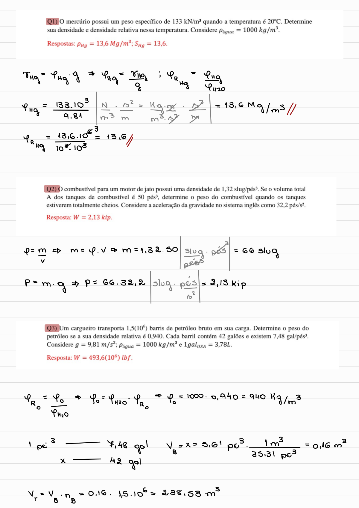 <p>Q1) o mercúrio possui um peso específico de 133 quando a temperatura é 20°C. Determine sua densidade e densidade relativa nessa temperatura. Considere Págua = Respostas: PHg = SHg = 13,6. = = m3m Q2) combustível para um motor de jato possui uma densidade de 1,32 Se volume total A dos tanques de combustível é 50 determine peso do combustível quando os tanques estiverem totalmente cheios. Considere a aceleração da gravidade no sistema inglês como 32,2 Resposta: kip. m m=1,32.50 => 66.32,2 = 2,13 Kip Q3) Um cargueiro transporta 1,5(106) barris de petróleo bruto em sua carga. Determine o peso do petróleo se a sua densidade relativa Cada barril contém 42 galões e existem 7,48 Considere g = Págua = 1000 kg/m3 e 1galusa = 3,78L. Resposta: W = 493,6(106) lbf. = = 7,48 gol = 0,16 35,31 X 42 gol</p><p>OT = 0,225 IN Q4) Um tanque é fabricado de aço com 20 mm de espessura. Se ele possui dióxido de carbono a uma pressoo temperatura absoluta de 1,35 Mpa e uma temperatura de 20 °C, determine peso total do tanque. A densidade do aço e diâmetro interno do tanque é de 3 m. Resposta: W = - = = m3 3 = pl CO2 P = 24,39 R.T = = m3 3 3 Q5) A viscosidade cinemática do querosene é = 2,39(10-6) Determine sua viscosidade em unidades FPS. Na temperatura considerada, querosene possui peso específico relativo de 0,810. Considere = g = 9,81 m/s2. Resposta: = rs 7946.1 = 810 g 9,81 => kg 3 j s m2</p><p>1935,9 N.s. = 40.4.10 lb.s 4,45 N Q6) Quando a força P é aplicada à placa, perfil de velocidade para um fluido newtoniano confinado sob a placa é aproximado por = (12y1/4) mm/s, onde y está em mm. Determine a tensão de cisalhamento dentro do fluido y = 8 mmey = 16 mm. Considere Resposta: T = 0,1875 mPa (y = 16 mm); T = 0,315 mPa (y=8 mm) P 16mm y = dy dy dy 3N N= = mm2 -3 = 0,315.10 N 0,315 mm = 163/4 Q7) perfil de velocidade de um fluido newtoniano escoando por uma superfície fixa é aproximado por = Usen Determine a tensão de cisalhamento no fluido em y= hey= h/2. A viscosidade do fluido é Resposta: T= T= dy</p><p>do = d U.sen ( oly dy 2h 4) 2h 2h dy 2h ( IT 2h 2h p/y=h 2h p/yzh 4 2h 2h 52 ITN.U = 0,353 2h 2 4 h h Q8) Se uma força de P = 2 N faz com que um eixo de 30 mm de diâmetro deslize por um mancal lubrificado com uma velocidade constante de 0,5 m/s, determine a viscosidade do lubrificante e a velocidade constate do eixo quando P = 8N. suponha que o lubrificante seja um fluido newtoniano e que o perfil de velocidade entre o eixo e mancal seja linear. o espaço entre o mancal e o eixo é de 1 mm. Respostas: = 0,849 N. ; v=2 m/s. 50 mm 0.5 m/s P</p><p>r. = 15.50 = 4712,4 mm2 = m2 106 mm2 = = F 2 m A 0,004712 N = 424,4.0,001 =0,849 N.S E m2 = 1694, 8 N/m2 0.004712 = = 2 m E N Q9) o recipiente está parcialmente cheio de óleo, água e ar. Determine as pressões em A, B e C. Considere = 62,4 Yoleo = 55,1 Respostas: PA = 3,26 psi; psi; = 2,83 psi. n a Ar h, Óleo 3 pés B hy h2 Água 1 hs + ; P = PA = = 470 lb. = 3.26 P B = P A - - = 158 lb = A - = 2,83 psi// 144</p><p>Q10) Determine a pressão d'água absoluta na tubulação B se o tanque estiver cheio de petróleo bruto à profundidade de 1,5 m. Considere Patm = 101 kPa; Ppet = 880 Págua = 1000 Resposta: N resultodo h, m 0.6 m 0.5 m B = Patm + Patm + PB = Pa Q11) A pressão de ar na tubulação A é de 300 kPa. Determine a pressão d'água na tubulação em B. Considere Págua = 1000 kg/m3. = 1,27 kg Respostas: PB = 303,9 kPa. A. hi m hz h3 B. B = P A + g + PB = + K Pa</p><p>Q12) Determine a magnitude da força resultante da água que atua sobre a placa triangular A na extremidade do recipiente. Desconsidere a largura da abertura no topo. Até que distância essa força atua a partir da superfície da água? Considere Págua = 1000 kg/m3. Respostas: 1,2 m - A 3 0,3 = + I Yc.A 36.Yc.A 36.0.8.0.36 Q14) Determine a força resultante que óleo exerce sobre a superfície semicircular AB. o tanque tem uma largura de 3 m. Considere Poelo = Resposta: kN A, m A 0.5m 1 m 1 m A2 = 22 R = F R</p><p>Q15) Um campo de escoamento é definido pelos componentes de velocidade (8y) m/s, onde X e y estão em metros. Determine a equação da linha de corrente passando pelo ponto (2m, 3m). 3 m 2 m 4 dy = dy = dx 2x2 4 3 - X 2 = - - 2x = 2(x-2) -2 2(x-2) 2(x-2) x 3 Q16) O campo de velocidade de um campo de escoamento bidimensional é definido por m/s e = (2t) m/s, onde x está em metros e t em segundos. Determine a posição (x, y) de uma partícula quando t = 2 S, se a partícula passa pelo ponto (2m, 6m) quando t = 0. Respostas: y 6 m x 2 m olx = 1 1. X 4 2 In (x) = 4 =</p><p>dy=2t = It 1.2 = Q17) O escoamento de água pelo bocal faz com que a velocidade das partículas ao longo da linha de corrente do centro seja V = + m/s, onde t está em segundos e está em metros. Determine a aceleração de uma partícula em = 0,1 m quando t = 0,2 s. Resposta: 7,6 at ax = = = 20t at at = 200 3x2 = 600 x2 ax ax a= e a= 20.0.2 +</p><p>Q18) Um campo de escoamento tem componentes de velocidade de = (3x + m/s e V= (2y3 + 10t) m/s, onde e y estão em metros e está em segundos. Determine as magnitudes das acelerações local e convectiva de uma partícula no ponto x=3m,y = 1 m, quando t = Respostas: alocal = = 141,5 y alocal 20 = + (2y3+ at at a = + = local ax =3 = x + = dy aconv = (3.3+2.2).3 + = 132 = Q19) Um fluido escoa pela tubulação curva com uma velocidade média constante de 3 m/s. Determine a magnitude da aceleração das partículas de água na linha de corrente ao longo da linha de centro da tubulação. Resposta: 18 m/s2 0.5m 3 m/s Como o constante como muda eomo rot = = R</p><p>Q20) Um fluido escoa pela tubulação curva de modo que, ao longo da linha de corrente central V = (20s2 + 1000t3/2 +4) m/s, onde S está em metros e t em segundos. Determine a magnitude da aceleração de uma partícula no ponto A, onde S = 0,3 m, quando t = 0,02 S. Resposta: 349 R=05m / a= + = n = at 25 at R Analisando S = 3/2 A) = 1/2 = at at 2 = 3/2 = a = 3/2 = Analisando 