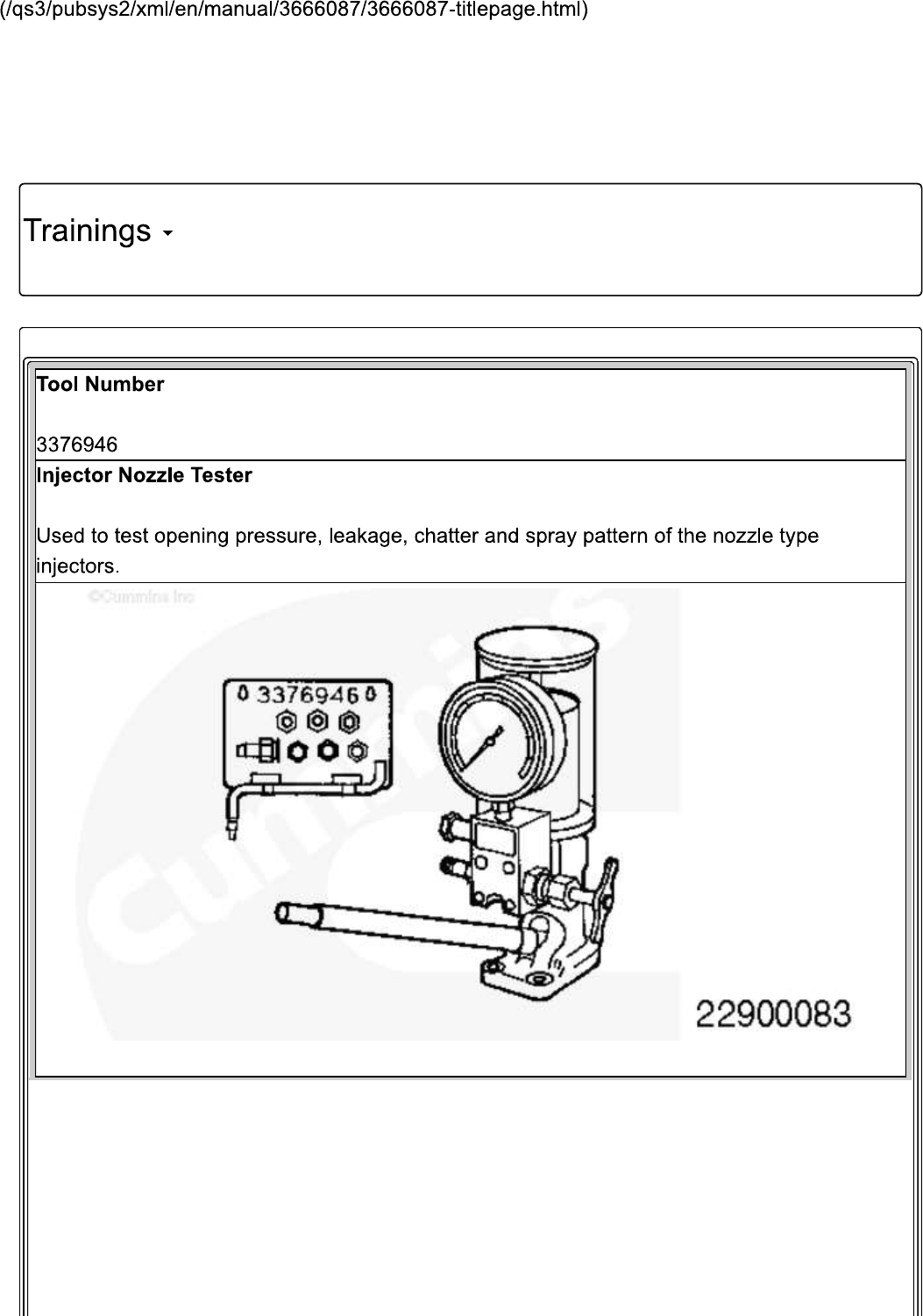 <p>Trainings Tool Number 3376946 Injector Nozzle Tester Used to test opening pressure, leakage, chatter and spray pattern of the nozzle type injectors. 0 3376946 0 22900083</p><p>Tool Number 3376947 Injector Nozzle Cleaning Kit Contains components to clean the injector nozzles. Included are: scrapers for 5, 6, and 7 mm injector nozzles, wooden cleaner for the seating surfaces, brass wire brush holder for injector nozzles, nozzle or orifice cleaning tool and holder, cleaning needles and scraper for ring groove. 22900082</p><p>Tool Number 3823276 Injector Puller Used to pull the injector. For use with externally mounted injectors. Inc 3823276 Tool Number 3825156 Injector Puller Used to pull the injector. For use with injectors mounted beneath the rocker lever cover. 3825156</p><p>Tool Number 3825157 Fuel Connector Puller Used to pull the fuel connector. Inc 3825157 Tool Number 3162268 Injector Holder Used with injection nozzle tester, Part Number 3376946, to hold injector during test. Inc 3162269</p><p>Tool Number 3822509 Injector Bore Brush Used to clean the injector bore. Inc 3822509</p><p>Tool Number 3376807 Filter Wrench Used to remove spin-on filters. Inc 3376807</p><p>Tool Number 3824879 Anti-seize Lubricant Used to speed assembly and disassembly of studs, bolts, and so forth. Inc ANTI-SEIZE LUBRICANT 382479 3824879 Last Modified: 31-Mar-2006</p><p>Trainings Preparatory Steps WARNING Batteries can emit explosive gases. To reduce the x possibility of personal injury, always ventilate the compartment before servicing the batteries. To reduce the possibility of arcing, remove the negative (-) battery 13900050 cable first and attach the negative (-) battery cable last. Disconnect the batteries. Remove Distributor-Type Fuel Injection Pumps Remove the fuel tube from the manifold fitting and the pump. fe9tbma In-Line Pumps Remove the AFC tube. fe9tbmb</p><p>Inspect for Reuse In-Line Pump Inspect the rubber sealing washers, and replace as necessary. ft9wasa Install Distributor-Type Pump Note : Use new sealing washers when installing the tube. Assemble in the reverse order of removal. Torque Value: 9 n°m [ 80 in-lb ] fe9tbma In-Line Pump Install the AFC tube in the reverse order of removal. Torque Value: 24 n°m [ 18 ft-lb ] fe9tbmb Finishing Steps WARNING Batteries can emit explosive gases. To reduce the possibility of personal injury, always ventilate the compartment before servicing the batteries. To reduce</p><p>the possibility of arcing, remove the negative (-) battery cable first and attach the negative (-) battery cable last. Connect the batteries Operate the engine and check for leaks. 13900050 Last Modified: 31-Mar-2006</p><p>Trainings General Information WARNING Fuel is flammable. Keep all cigarettes, flames, pilot lights, arcing equipment, and switches out of the work area and areas sharing ventilation to reduce the possibility of severe personal injury or death when working on the fuel system. WARNING Do not vent the fuel system on a hot engine; this can cause fuel to spill onto a hot exhaust manifold, which can cause a fire. The low-pressure fuel system for a diesel installed in the vehicle consists of the fuel tank, lines between the tank and the engine, transfer pump and lines, and fuel filter and lines. Air or bubbles at the injection pump can cause the engine not to operate or erratic engine operation and/or subsequent malfunction of the fuel injection pump. Air can be introduced by leaks in the fuel system prior to the transfer pump since the fuel in the lines is under a vacuum and can draw air into the system. Bubbles can result from any number of restrictions in the system: Plugged fuel filter Crimped fuel line. If sufficient fuel reaches the injection pump from the low-pressure system then solutions to engine operational problems are elsewhere. The following steps will aid in evaluating low- pressure fuel system performance. Replacing the fuel supply lines, fuel filters, fuel injection pump, high-pressure fuel lines, and injectors will let air enter into the fuel system. Follow the specified procedure to bleed the air from the system.</p><p>Use the following procedure for proper venting of the low pressure side of the fuel system. Refer to Procedure 006- ON START 015 OFF in Section 6. 30 Seconds Use the following procedure to determine if venting the fuel pump is necessary. Refer to Procedure 005-012 ft900w or Refer to Procedure 005-014 in Section 5. Use the following procedure for venting of the high pressure side of the fuel system. Refer to Procedure 006-051 in Section 6. Since the fuel transfer pump provides positive pressure through the fuel filter and supply line to the fuel injection pump, loose connections or defective seals show as a fuel RPM leak and not as an air leak. fs901kb Air in the fuel system will cause the following engine problems: Hard to start Run rough OK Misfire Fuel knock. Note : If an excessive amount of air has entered into the system, the system will need to be vented. Follow the "Prime" sections referenced above. Test A source that is often overlooked for air to enter the fuel system is between the inlet of the prefilter and the suction tube in the tank. Fuel tanks that have the outlet fitting at the</p><p>top have a suction tube that extends to the bottom of the tank. Cracks or pin holes in the weld that join the tube to the fitting can let air enter the fuel system. Also, check to make sure all the fittings from the fuel supply line on the tank to the inlet of the fuel transfer pump are tight. fs900se Use a sight glass at the fuel lift pump inlet to check for air in the fuel supply lines. Before venting the air in the fuel, turn the knob on the shutoff valve clockwise to open the valve. After finish venting, turn the knob on the shutoff valve counterclockwise to close the valve. 05600171 A stuck-open injector can also blow combustion gas back into the pump and cause air to be present in the overflow. If the engine seems to be misfiring or r
