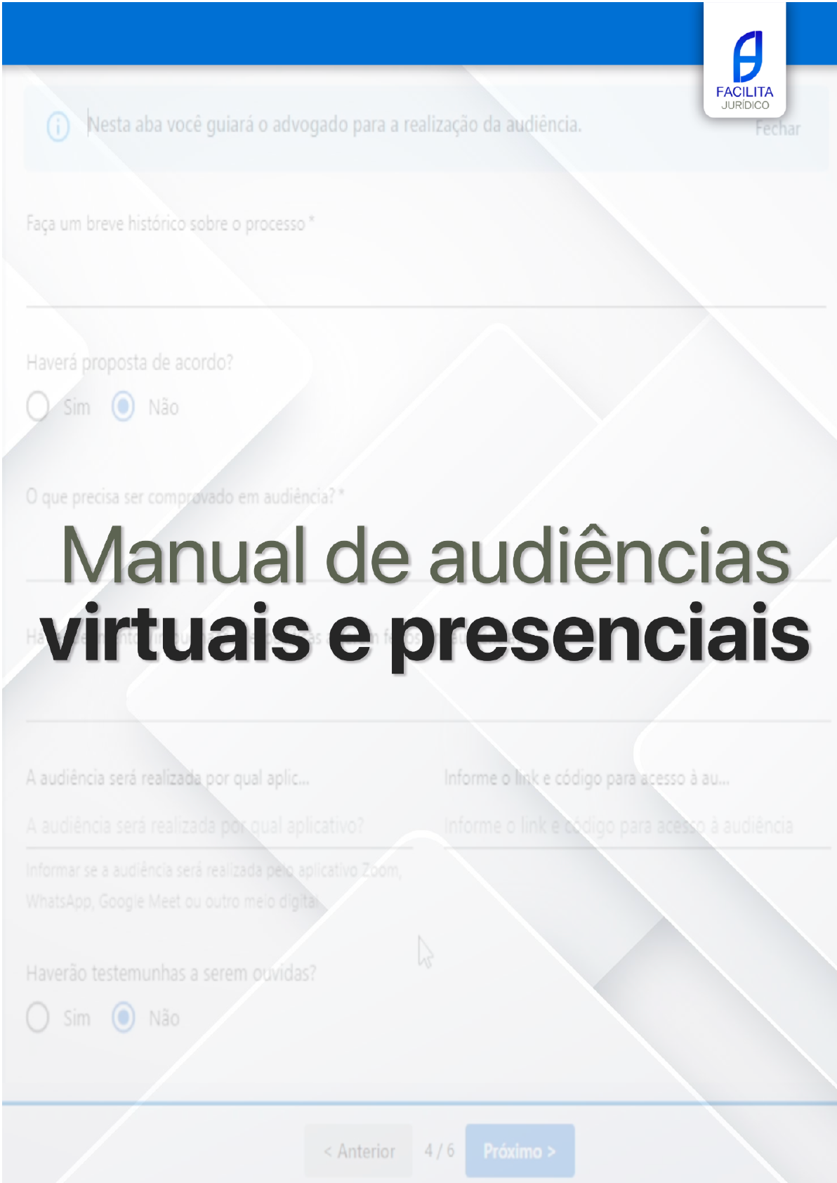 <p>SUMÁRIO</p><p>OS SERVIÇOS DE AUDIÊNCIA ONLINE 4</p><p>O CREDENCIAMENTO COMO FACILITER AUDIENCISTA 5</p><p>O SERVIÇO DE AUDIÊNCIA NA PLATAFORMA 6</p><p>A SOLICITAÇÃO DO CLIENTE 6</p><p>A VINCULAÇÃO E PROCEDIMENTOS 7</p><p>AUDIÊNCIAS VIRTUAIS 8</p><p>O RELATÓRIO DA AUDIÊNCIA 11</p><p>AUDIÊNCIAS PRESENCIAIS 13</p><p>O SUPORTE DO FACILITER AUDIENCISTA 15</p><p>QUALIDADE 16</p><p>FINANCEIRO 16</p><p>AUDIÊNCIAS CÍVEIS 17</p><p>AUDIÊNCIA DE CONCILIAÇÃO E MEDIAÇÃO CÍVEL 17</p><p>DE EVENTUAL AUSÊNCIA AO ATO 19</p><p>DA RÉGUA DE TRANSAÇÃO – ATÉ ONDE SE PODERÁ NEGOCIAR 19</p><p>DA CONCLUSÃO - AUDIÊNCIA DE CONCILIAÇÃO E MEDIAÇÃO CÍVEL 20</p><p>AUDIÊNCIA UNA - ATO NO JUIZADO ESPECIAL CÍVEL 20</p><p>CONCLUSÃO – AUDIÊNCIA UNA 22</p><p>AUDIÊNCIA DE INSTRUÇÃO CÍVEL 23</p><p>DO PONTO DE PARTIDA 23</p><p>ESCOPO DA AUDIÊNCIA DE INSTRUÇÃO – PREPARO E O QUE FAZER NO DIA</p><p>24</p><p>HIPÓTESES DE ADIAMENTO 25</p><p>DA AUDIÊNCIA DE INSTRUÇÃO – TENTATIVA DE CONCILIAÇÃO PRÉVIA E</p><p>ORDEM DE PRODUÇÃO DE PROVAS 26</p><p>DOS QUESTIONAMENTOS BÁSICOS 27</p><p>DOS DEBATES ORAIS OU RAZÕES FINAIS ESCRITAS 28</p><p>DA ATA DE AUDIÊNCIA 28</p><p>DA CONCLUSÃO - DA AUDIÊNCIA DE INSTRUÇÃO 29</p><p>AUDIÊNCIAS TRABALHISTAS 29</p><p>AS AUDIÊNCIAS TRABALHISTAS E SEUS RITOS 29</p><p>RITO SUMÁRIO 29</p><p>RITO SUMARÍSSIMO 30</p><p>RITO ORDINÁRIO 34</p><p>DA AUDIÊNCIA DE CONCILIAÇÃO 35</p><p>DO PROTESTO EM AUDIÊNCIA 38</p><p>DA MANIFESTAÇÃO ORAL 38</p><p>DOS PROCEDIMENTOS A SEREM ADOTADOS PELO AUDIENCISTA 39</p><p>AUDIÊNCIAS CRIMINAIS 40</p><p>CONSIDERAÇÕES INICIAIS - PREMISSAS PARA A CORRETA REALIZAÇÃO DE</p><p>AUDIÊNCIA 40</p><p>TIPOS DE AUDIÊNCIAS NA SEARA PENAL 41</p><p>DA AUDIÊNCIA DE CUSTÓDIA 41</p><p>PREVISÃO LEGAL E CONSIDERAÇÕES GERAIS 41</p><p>PONTOS DE ATENÇÃO E ARGUIÇÕES POSSÍVEIS EM SEDE DE AUDIÊNCIA DE</p><p>CUSTÓDIA 42</p><p>DA AUDIÊNCIA DE INSTRUÇÃO E JULGAMENTO 42</p><p>DAS DIFERENÇAS ENTRE OS RITOS ORDINÁRIO E SUMÁRIO 42</p><p>DA ORDEM DE OITIVAS E DO REQUERIMENTO DE DILIGÊNCIAS 44</p><p>PONTOS DE ATENÇÃO E ARGUIÇÕES POSSÍVEIS EM SEDE DE AUDIÊNCIA DE</p><p>INSTRUÇÃO E JULGAMENTO 44</p><p>PONTOS DE ATENÇÃO E ARGUIÇÕES POSSÍVEIS EM SEDE DE AUDIÊNCIA</p><p>ÂMBITO DOS JUIZADOS ESPECIAIS CRIMINAIS 45</p><p>DA AUDIÊNCIA PRELIMINAR DE CONCILIAÇÃO 45</p><p>DA AUDIÊNCIA DE INSTRUÇÃO E JULGAMENTO 47</p><p>DA CONCLUSÃO – AUDIÊNCIAS CRIMINAIS 48</p><p>AUDIÊNCIAS PREVIDENCIÁRIAS 48</p><p>DAS ORIENTAÇÕES GERAIS - INSTALAÇÃO DA AUDIÊNCIA 49</p><p>PRODUÇÃO DE PROVA ORAL 50</p><p>EXEMPLOS DE QUESITOS PARA AUDIÊNCIA PREVIDENCIÁRIA -</p><p>COMPROVAÇÃO DE TEMPO DE CONTRIBUIÇÃO 52</p><p>ALEGAÇÕES FINAIS E SENTENÇA 52</p><p>CONCLUSÃO GERAL 56</p><p>OS SERVIÇOS DE AUDIÊNCIA</p><p>Olá Faciliter!</p><p>Estamos muito felizes com seu interesse em fazer parte do nosso time de</p><p>faciliters audiencistas!</p><p>A Facilita Jurídico é uma startup feita da união de tecnologia com</p><p>conhecimento jurídico, pioneira na elaboração de petições sob medida, totalmente online,</p><p>para todo o Brasil. Hoje somos a extensão do operacional de mais de 1.500 (mil e</p><p>quinhentos) escritórios de advocacia espalhados por todo o Brasil e estamos em constante</p><p>crescimento.</p><p>Nossa missão é auxiliar advogados em sua rotina operacional e para isso,</p><p>buscamos constante aprimoramento de procedimentos para melhoria dos serviços e para</p><p>atender aos anseios de nossos clientes.</p><p>Por isso, e atendendo a muitos pedidos de nossos clientes, além da</p><p>elaboração de documentos jurídicos em geral, a Facilita Jurídico passará a oferecer os</p><p>serviços de audiência online e presencial em várias áreas do Direito: cível, trabalhista,</p><p>criminal e previdenciária.</p><p>Ofereceremos prestação de serviços para diferentes tipos de audiências</p><p>para atender às necessidades dos clientes, realizando audiências de conciliação, instrução,</p><p>oitiva de testemunhas e una.</p><p>Como nosso parceiro, você já sabe que o alicerce da Facilita</p><p>Jurídico é a qualidade e na prestação de serviços de audiências não será</p><p>diferente!</p><p>Por isso, preparamos este ebook exclusivo para os nossos faciliters</p><p>audiencistas com o objetivo de fornecer as informações necessárias para realizar</p><p>audiências eficazes e eficientes, além de ajudá-los a se preparar melhor para lidar com</p><p>situações imprevistas que possam ocorrer durante a audiência.</p><p>Vamos conhecer os procedimentos e padrões do Programa de Faciliter</p><p>Audiencistas?</p><p>O CREDENCIAMENTO COMO FACILITER AUDIENCISTA</p><p>Para os Faciliters que já se encontram ativos na plataforma, a habilitação</p><p>é muito simples e possível para aquele que possuem score igual ou superior a 3.0.</p><p>Vamos ao passo a passo:</p><p>Primeiro passo: entrar em “meu perfil” > “disponibilidade” > “adicionar</p><p>especialidade:</p><p>Segundo passo: incluir a opção audiência presencial e a área de</p><p>atuação (se mais de uma, repetir o procedimento), informando se atua como preposto ou</p><p>se possui preposto para levar em audiência:</p><p>Terceiro passo: clicar em “adicionar comarca”:</p><p>Quarto passo: selecionar as comarcas de atuação, podendo ser mais de</p><p>uma.</p><p>Observação: será também possível a habilitação de faciliters inativos na</p><p>plataforma por meio de contato com o suporte para reativação e posterior realização do</p><p>procedimento supra.</p><p>Agora, para aqueles que ainda não fazem parte de nossa plataforma, as</p><p>etapas são tais como o teste de credenciamento, disponível em:</p><p>https://nosy-singer-e35.notion.site/AUDIENCISTAS-CREDENCIAMENTO-PARA-FACILITERS-</p><p>f1572d792b8647e3b774a6c707e83666?pvs=4</p><p>O SERVIÇO DE AUDIÊNCIA NA PLATAFORMA</p><p>A SOLICITAÇÃO DO CLIENTE</p><p>A Facilita Jur