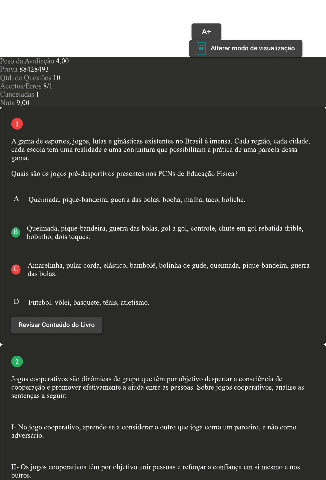 <p>A+ Alterar modo de visualização Peso da Avaliação 4,00 Prova 88428493 Qtd. de Questões 10 Acertos/Erros 8/1 Canceladas 1 Nota 9,00 1 A gama de esportes, jogos, lutas e ginásticas existentes no Brasil é imensa. Cada região, cada cidade, cada escola tem uma realidade e uma conjuntura que possibilitam a prática de uma parcela dessa gama. Quais são os jogos pré-desportivos presentes nos PCNs de Educação Física? A Queimada, pique-bandeira, guerra das bolas, bocha, malha, taco, boliche. B Queimada, pique-bandeira, guerra das bolas, gol a gol, controle, chute em gol rebatida drible, bobinho, dois toques. C Amarelinha, pular corda, elástico, bolinha de gude, queimada, pique-bandeira, guerra das bolas. D Futebol. vôlei, basquete, tênis, atletismo. Revisar Conteúdo do Livro 2 Jogos cooperativos são dinâmicas de grupo que têm por objetivo despertar a consciência de cooperação e promover efetivamente a ajuda entre as pessoas. Sobre jogos cooperativos, analise as sentenças a seguir: I- No jogo cooperativo, aprende-se a considerar outro que joga como um parceiro, e não como adversário. II- Os jogos cooperativos têm por objetivo unir pessoas e reforçar a confiança em si mesmo e nos outros.</p><p>III- Ganhar ou perder não é que realmente importa, e sim processo como um todo. IV- Fazem com que a pessoa aprenda a se colocar no lugar do outro, e não priorizar apenas seu lado. Assinale a alternativa CORRETA: A Somente a sentença III está correta. B As sentenças I, II, III e IV estão corretas. C Somente a sentença I está correta. D Somente a sentença II está correta. 3 A palavra jogo é originária do latim e significa brinquedo, folguedo, divertimento, passatempo sujeito a regras, ou até mesmo uma série de coisas que formam uma coleção. Qual tipo de jogo, em seu desenrolar, não pode ser determinado nem resultado obtido previamente? A Delimitado. B Incerto. C Produtivo. D Livre. 4 A Educação Física tem um valor imprescindível na comunidade escolar, por seu caráter multidimensional e pluridisciplinar. Sobre a Educação Física, analise as sentenças a seguir: Deve possibilitar a releitura e a reapropriação crítica dos conhecimentos da cultura corporal de movimento, que auxilia as crianças a serem autônomas, críticas e criativas nessa dimensão social. II- Saber sobre a cultura corporal do movimento não afeta em nada a vida social do ser humano e não contribui para conhecimento do corpo. III- É responsável pela tematização da cultura corporal do movimento. Essa cultura desenvolve no ser humano um tipo de conhecimento muito particular, insubstituível.</p><p>Assinale a alternativa CORRETA: A Somente a sentença II está correta. B As sentenças I e II estão corretas. C As sentenças I e III estão corretas. D As sentenças II e III estão corretas. 5 Uma criança de 4 a 6 anos já começa a aceitar regras e há um aumento em sua capacidade de concentração, que proporciona ao professor a possibilidade de trabalhar com atividades mais complexas. Considereando atividades e brinquedos que podem ser sugeridos nessa fase, assinale a alternativa INCORRETA: A Argila para modelar. B Jogos eletrônicos. C Ferramentas de brinquedo. D Fantoches, máscaras. 6 É preciso oferecer às crianças momentos ricos e diversificados, permitindo que elas possam fazer uso da liberdade, da criatividade e da espontaneidade, propondo-lhes atividades em que brinquedo seja objeto de desenvolvimento, estimulando aprendizagens, superando desafios e somando conquistas. Considerando algumas possibilidades de vivenciar lúdico de acordo com cada fase de evolução da criança, associe os itens, utilizando código a seguir: a 2 anos. II- 2 a 4 anos. III- Mais de 4 anos.</p><p>( ) Nesse período, a criança já apresenta evolução na capacidade de concentração e percepção proprioceptiva e exteroceptiva, já é capaz de aceitar regras e possibilitando ao educador trabalho com atividades mais complexas. Nesse período, surge interesse por atividades com números e letras. ( ) Nessa idade, as crianças gostam de brincadeiras com poucas regras, pois interesse é motor e sensorial, porque já apresenta percepção de seu esquema corporal, se relaciona com objetos e possui conhecimento de suas partes do corpo. ( ) Suas principais características são as descobertas pelo tato, dos movimentos, das formas, das pessoas, das texturas e necessitam de atividades de coordenação motora, como abrir, fechar, empilhar, encaixar, puxar, empurrar e atividades de comunicação. Assinale a alternativa que apresenta a sequência CORRETA: A I III II. B I - II III. C II - III I. D Atenção: Esta questão foi cancelada, porém a pontuação foi considerada. 7 A palavra lúdico vem do latim ludus, que significa brinquedo, brincadeira, brincar, passando a ser reconhecido como uma ferramenta essencial para desenvolvimento habilidades humanas. Conforme Santin (1994, p. 87), " lúdico e a ludicidade só serão compreendidos no seu acontecer. O lúdico se parece com uma sinfonia: ela precisa ser executada para ser vivida. Não é uma ideia intelectualizada que nos dá a compreensão da sinfonia. Ela não foi criada para se tornar conceito, mas para ser vivenciada mediante sua execução. O ato lúdico coloca-se na mesma esteira e, ainda, com uma grande diferença. Ele não precisa de partitura. Cada ato lúdico é novo e original, jamais repetido". Sobre exposto, analise as sentenças a seguir: I- Proporcionar brincadeiras e jogos é função dos professores de Educação Física ou nos horários do recreio. II- Os jogos e as brincadeiras, possuem caráter instrutivo, pois é uma obrigação da escola utilizá-los como metodologia. III- As brincadeiras tradicionais não precisam ser adotadas nas escolas, pois são praticadas fora dela. IV- Os jogos e as brincadeiras podem ser integrados ao ensino, auxiliando em diversas disciplinas durante a aprendizagem. Assinale a alternativa CORRETA: FONTE: SANTIN