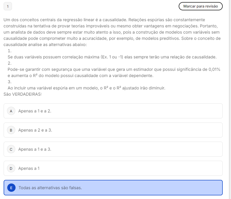 <p>1 Marcar para revisão Um dos conceitos centrais da regressão linear é a Relações espúrias são constantemente construídas na tentativa de provar teorias improváveis ou mesmo obter vantagens em negociações. Portanto, um analista de dados deve sempre estar muito atento a isso, pois a construção de modelos com variáveis sem causalidade pode comprometer muito a acuracidade, por exemplo, de modelos preditivos. Sobre conceito de causalidade analise as alternativas abaixo: 1. Se duas variáveis possuem correlação máxima (Ex. 1 ou -1) elas sempre terão uma relação de causalidade. 2. Pode-se garantir com segurança que uma variável que gera um estimador que possui significância de 0,01% e aumenta R2 do modelo possui causalidade com a variável dependente. 3. Ao incluir uma variável espúria em um modelo, e R2 ajustado irão diminuir. São VERDADEIRAS: A Apenas a 1 e a 2. B Apenas a 2 e a 3. C Apenas a 1 e a 3. D Apenas a 1 E Todas as alternativas são falsas.</p>
